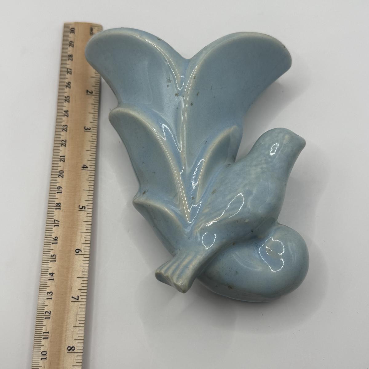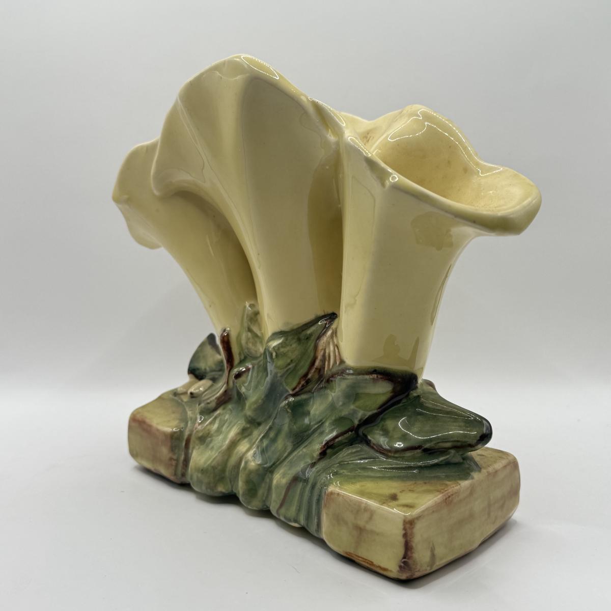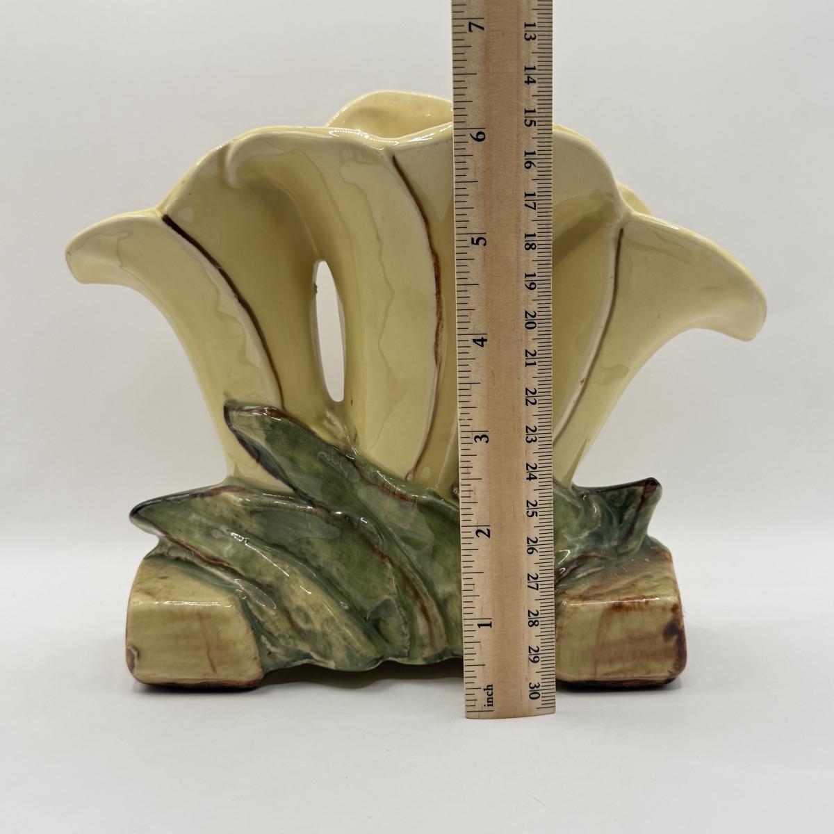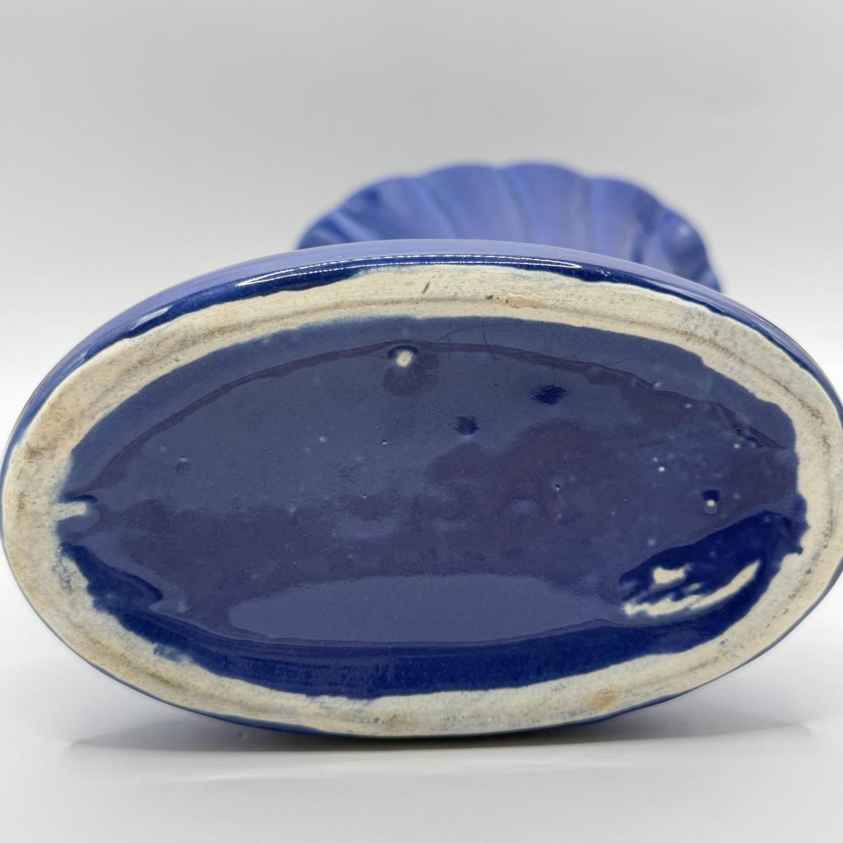 LOT 50K: Collection of Colorful Pottery: 1960s McCoy USA Triple Lily Vase, USA Pottery Cobalt Art Nouveau Vase, McCoy Yellow Pot& Wall Mounted Light Blue Bird Vase