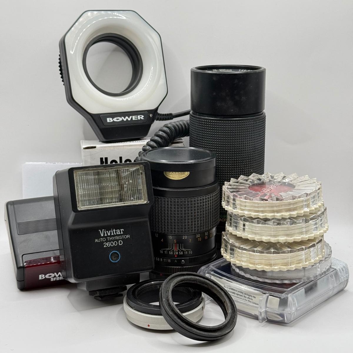 LOT 51K: Vivitar 58mm f/4.5-5.6 MC Macro Focusing Zoom Lens, Bower SFDRF Flash, Vivitar Auto Thyristor 2600-D Flash, DeJUR 135mm f/2.8 Lens, Holga MR-1 Macro Ring-Lite, Filters & More