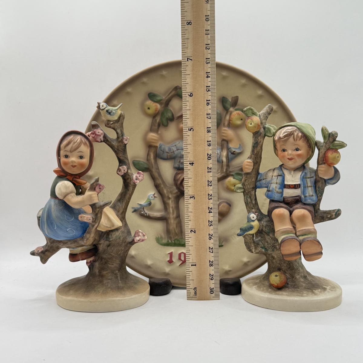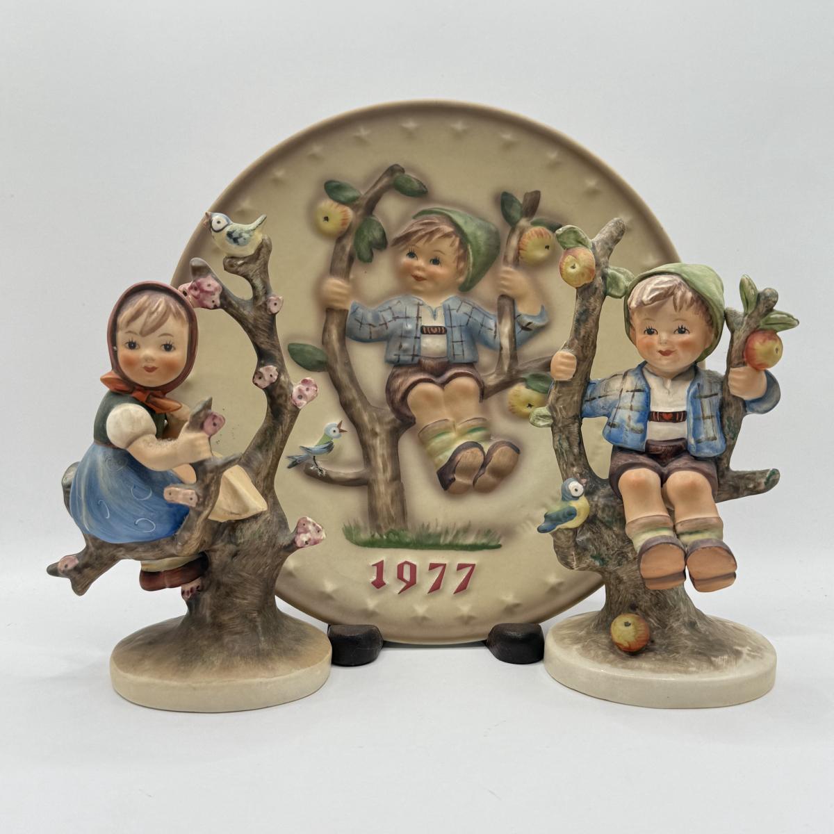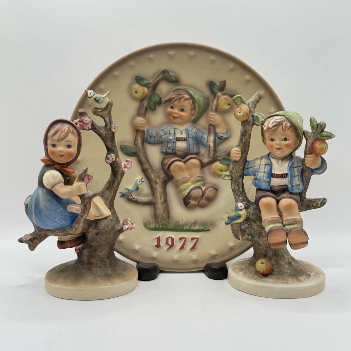 LOT 60K: Vintage Goebel M.I. Hummel Collection: Apple Girl and Apple Boy Figurines w/ 1977 Apple Boy Decorative Plate