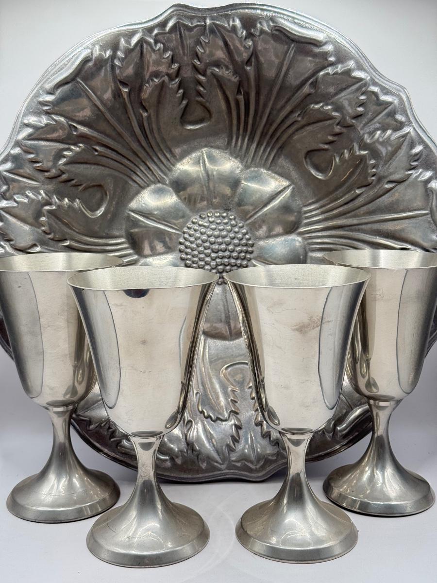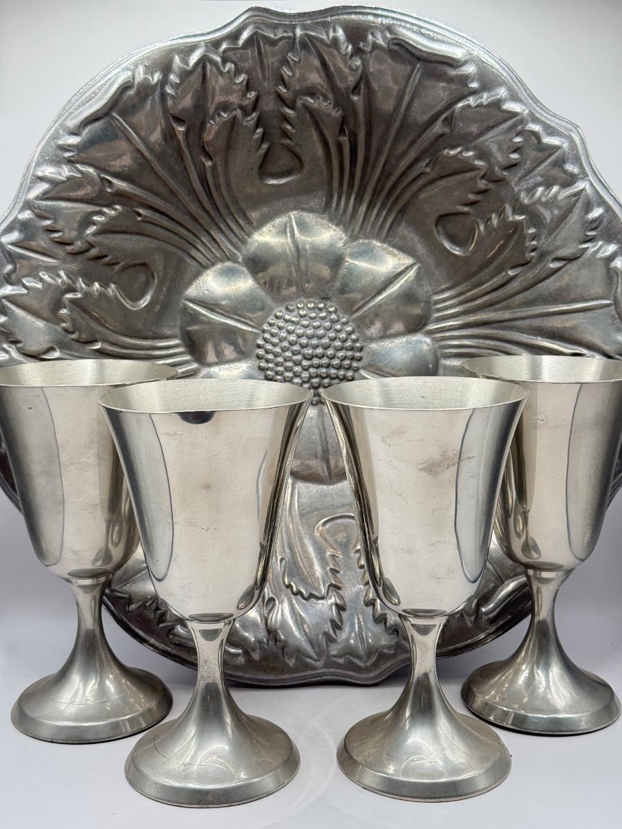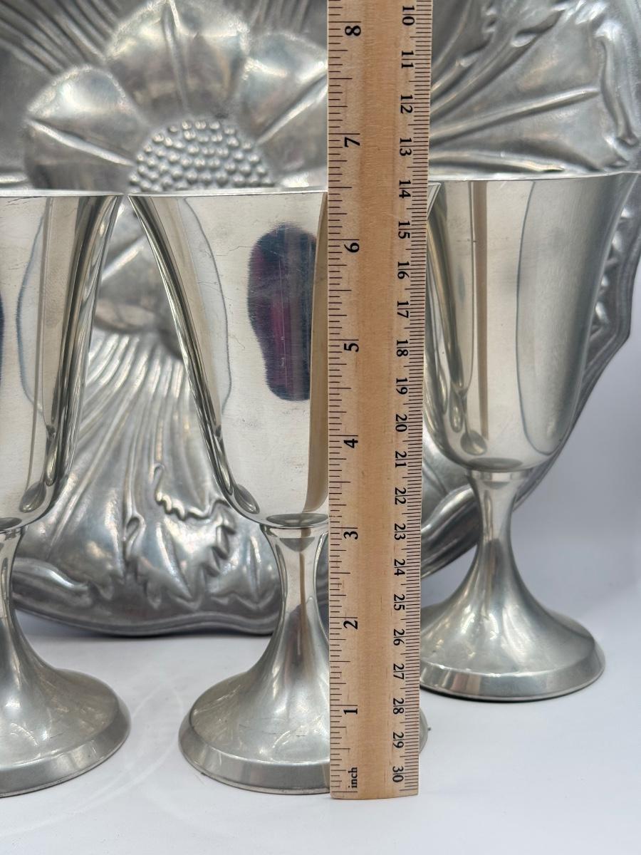 LOT 61K: Pewter Collection: Four Stiffel Goblets & RWP The Wilton Co Large Flower Bowl
