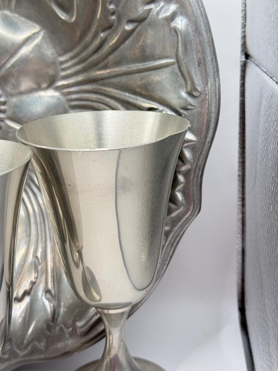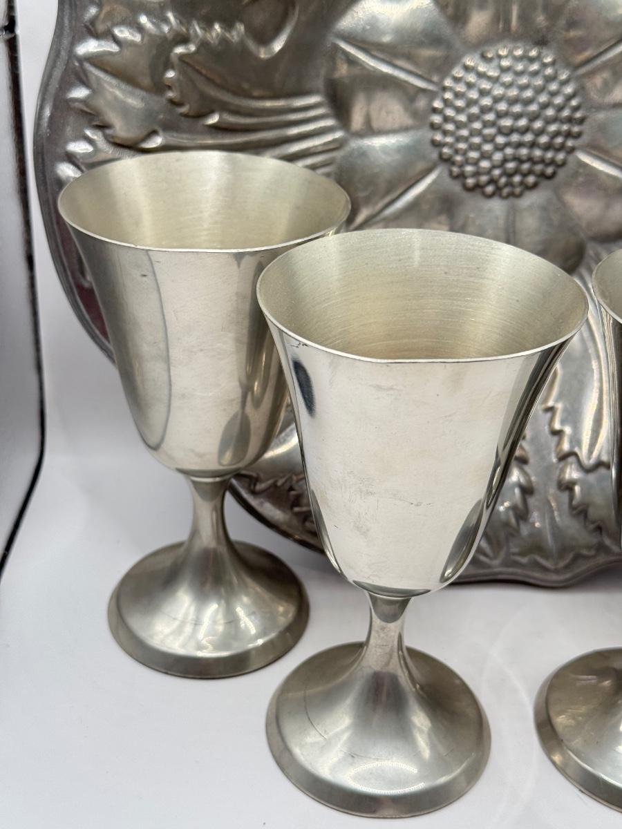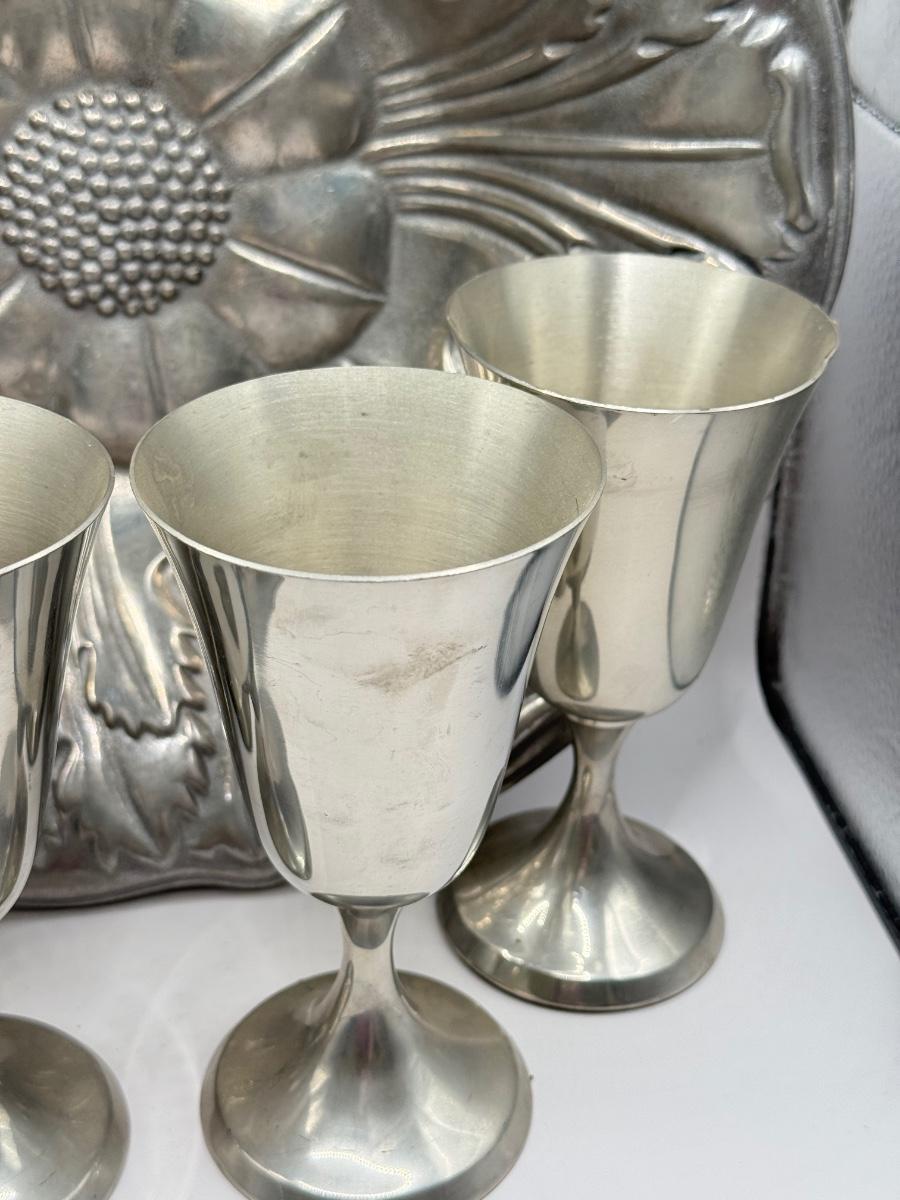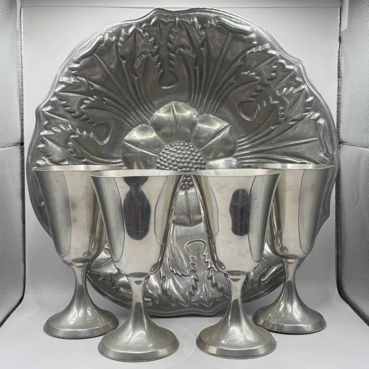 LOT 61K: Pewter Collection: Four Stiffel Goblets & RWP The Wilton Co Large Flower Bowl