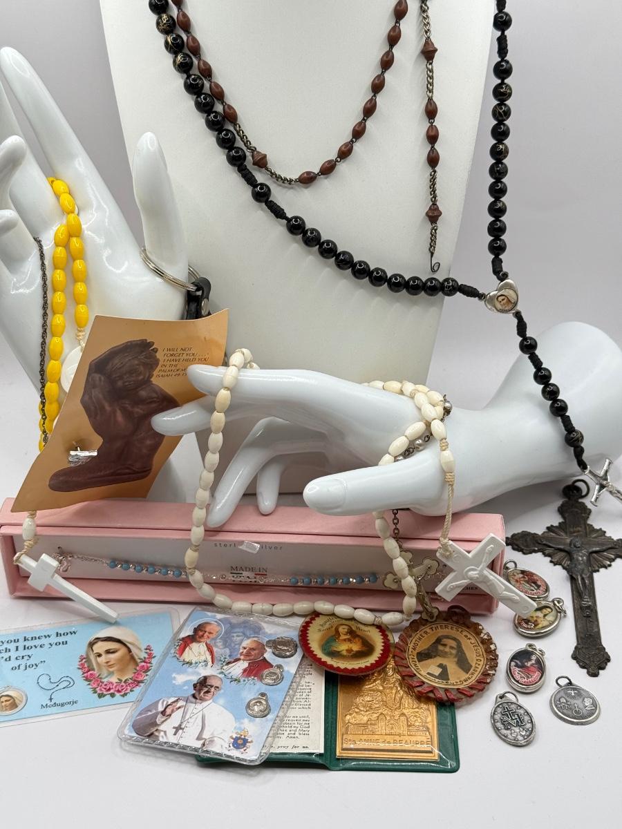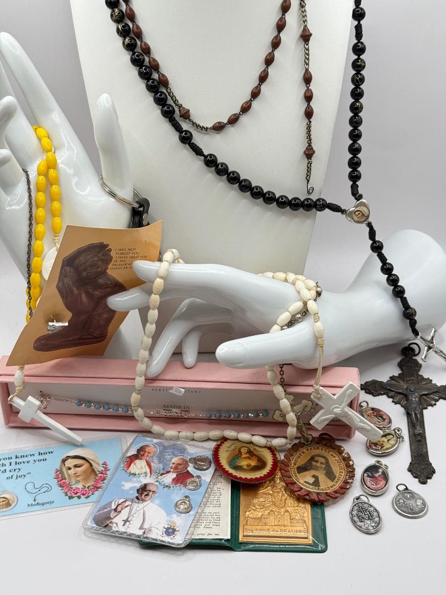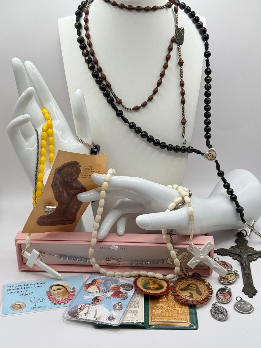 LOT 62J: 925 Italy Sterling Silver Mary Bracelet & Collection of Religious Charms, Rosaries & More