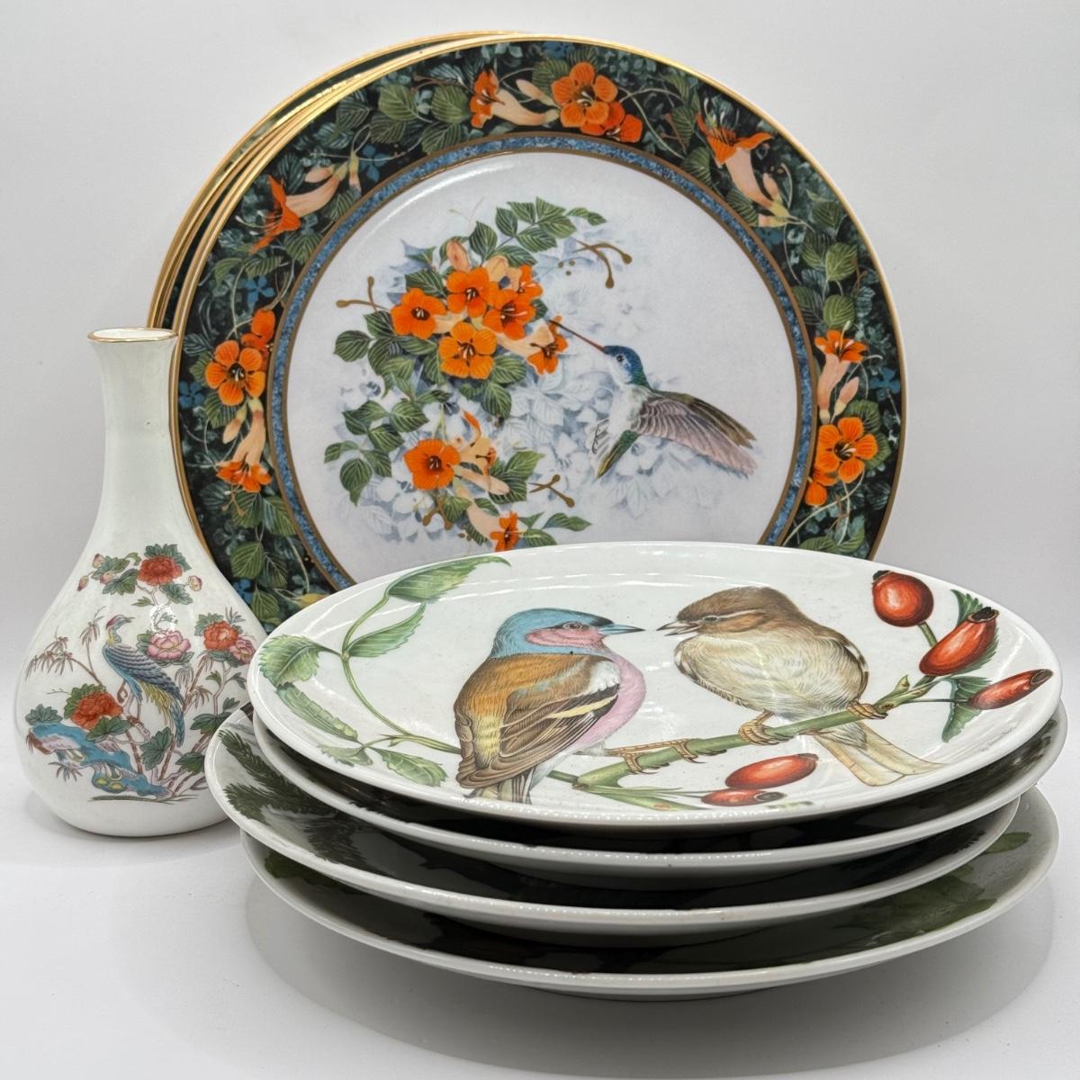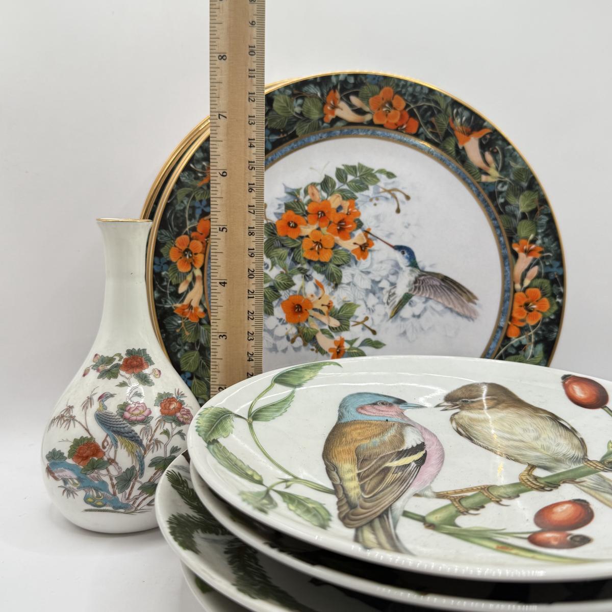 LOT 64K: Bird Themed China: Wedgwood Kutani Crane Bud Vase, Royal Doulton Theresa Politowicz Hummingbird Heirloom Plates & Vintage Goebel W. Germany Artist Styled Bird Plates