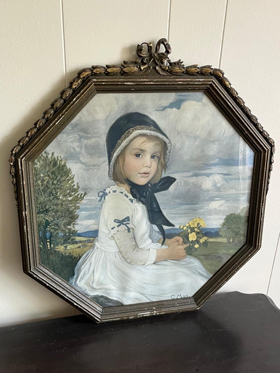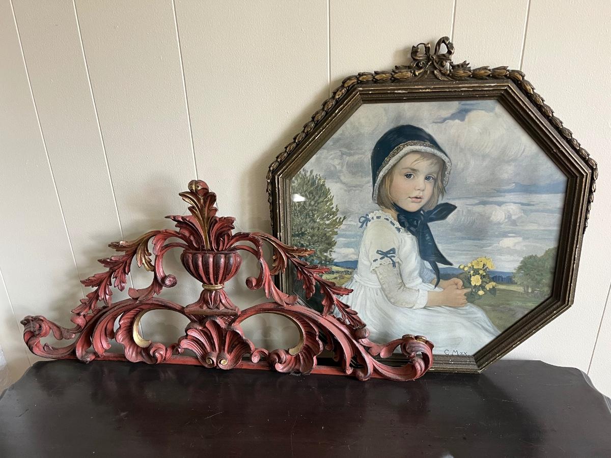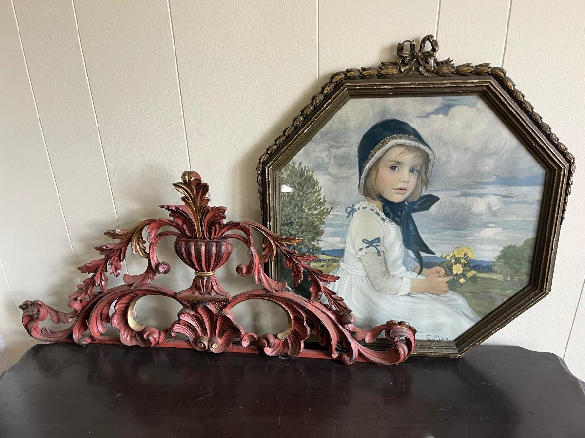 LOT 98L:Vintage / Antique Framed Print - "Anna Brigitta" by Corneille May + Antique Vintage Wall Pediment - Mase in Italy