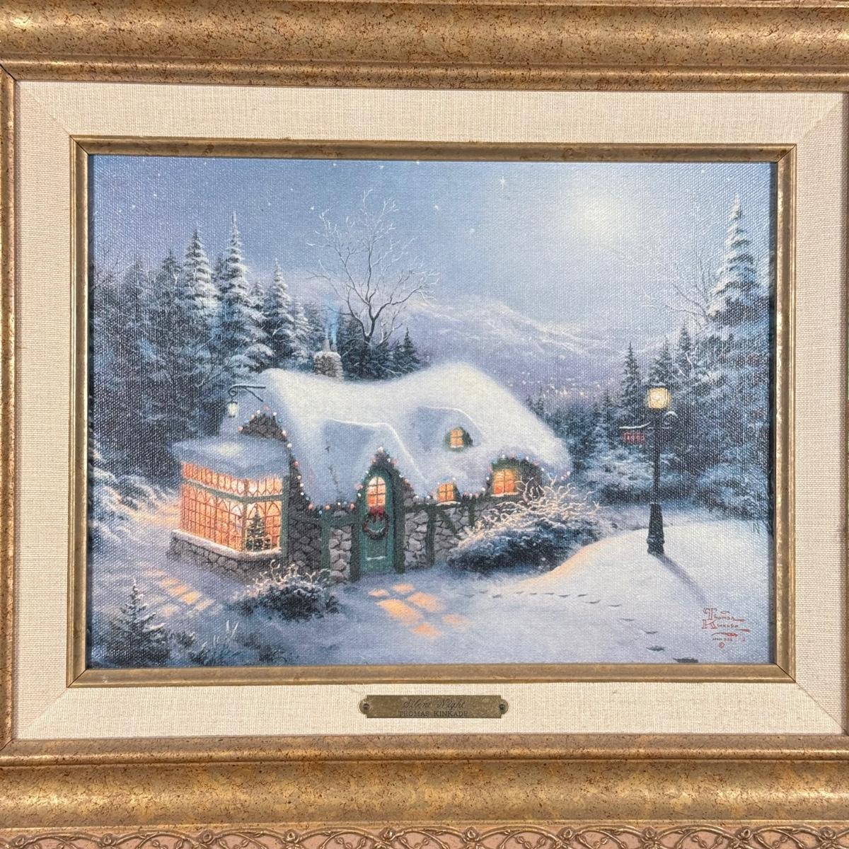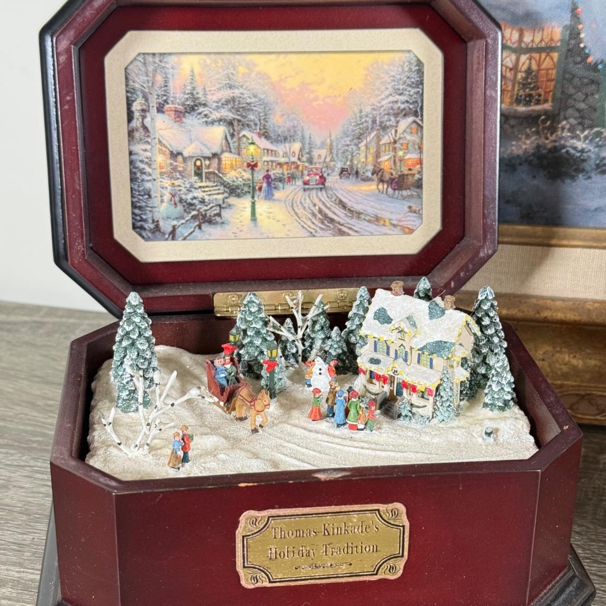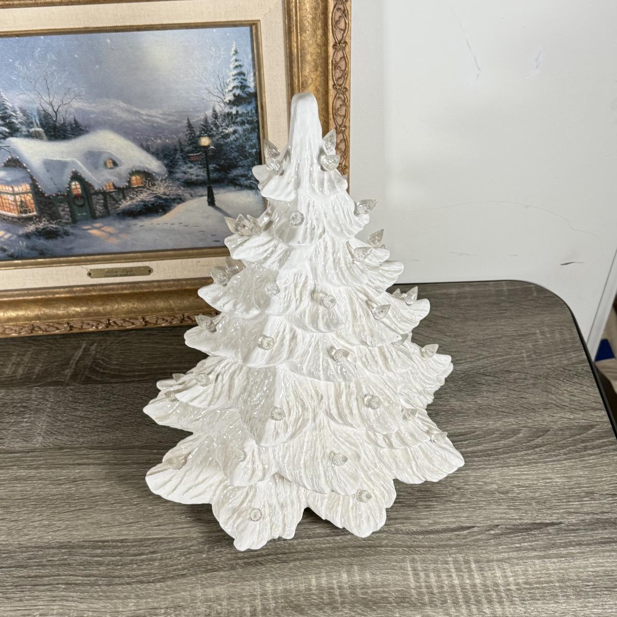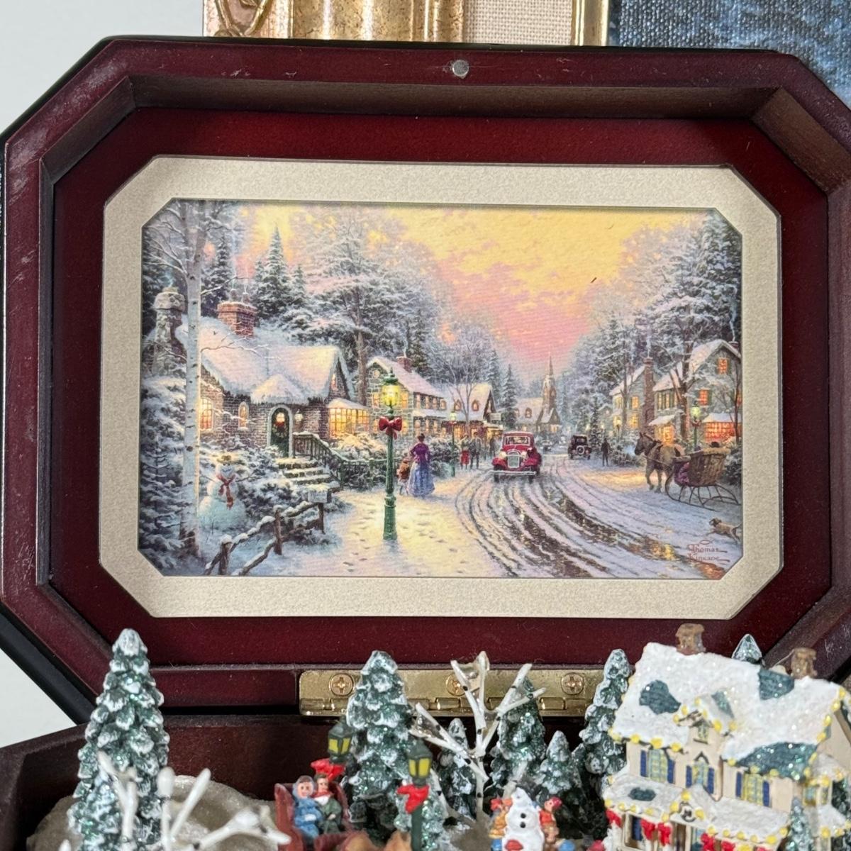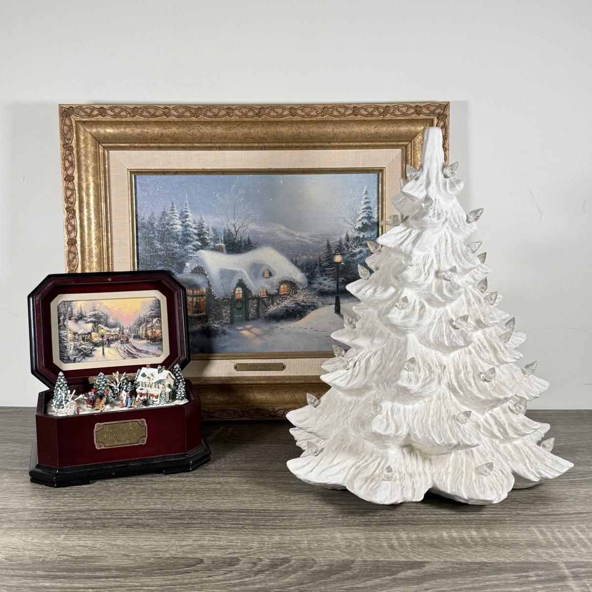LOT 101K: Thomas Kinkade "Silent Night" Framed Print w/ COA, Holiday Traditions "We Wish You a Merry Christmas" Music Box A5648 & White Ceramic Christmas Tree Top