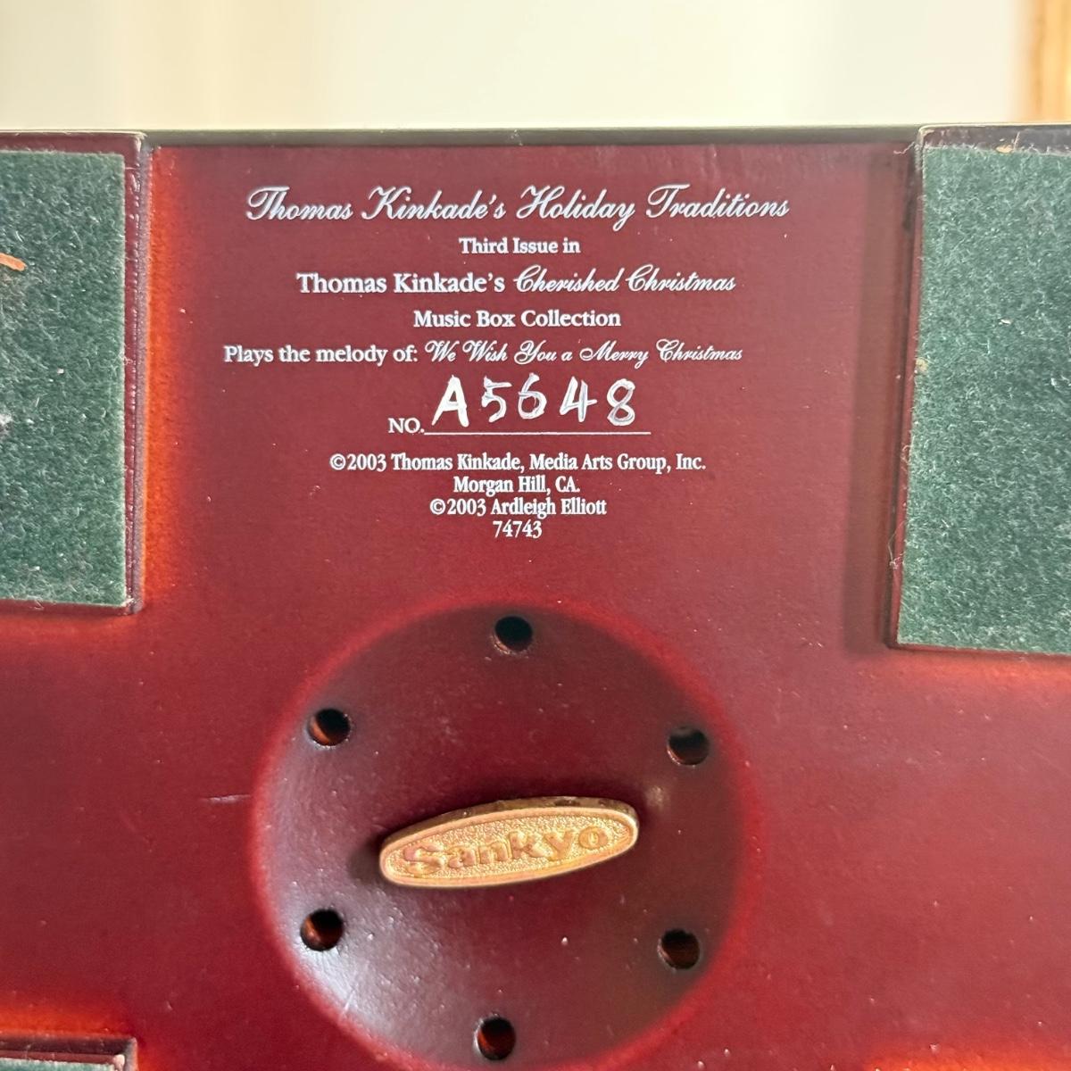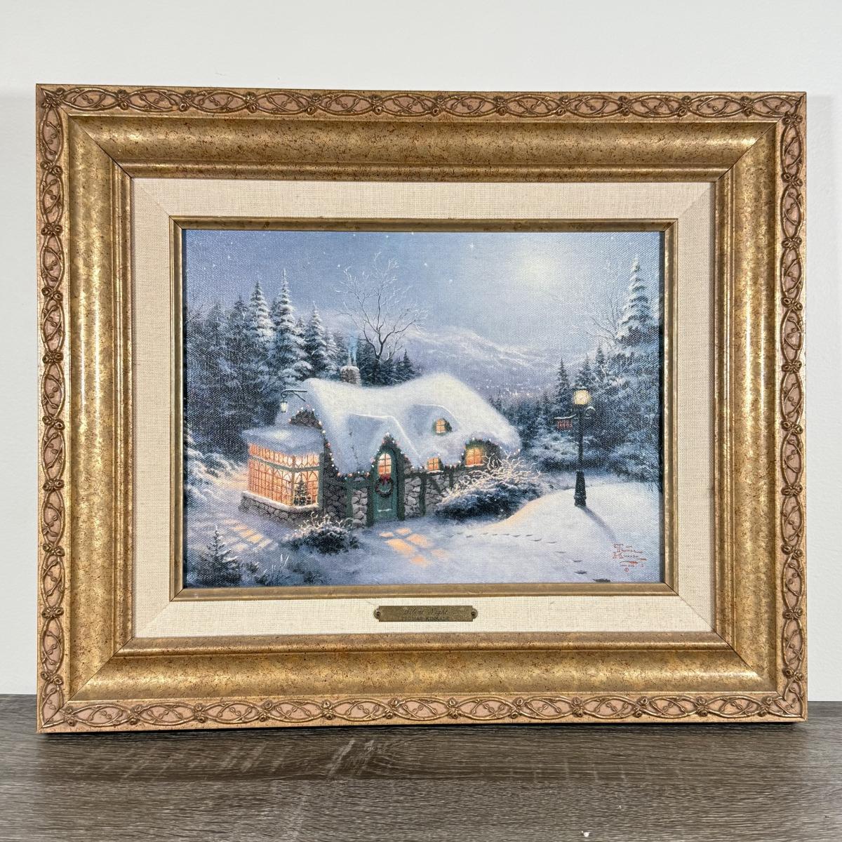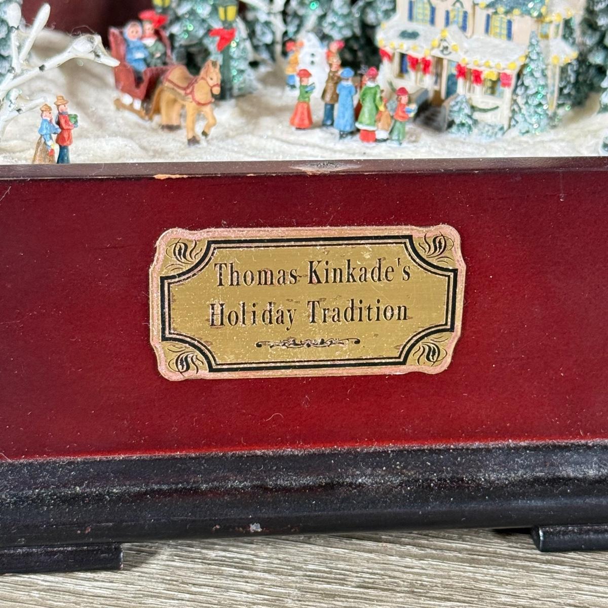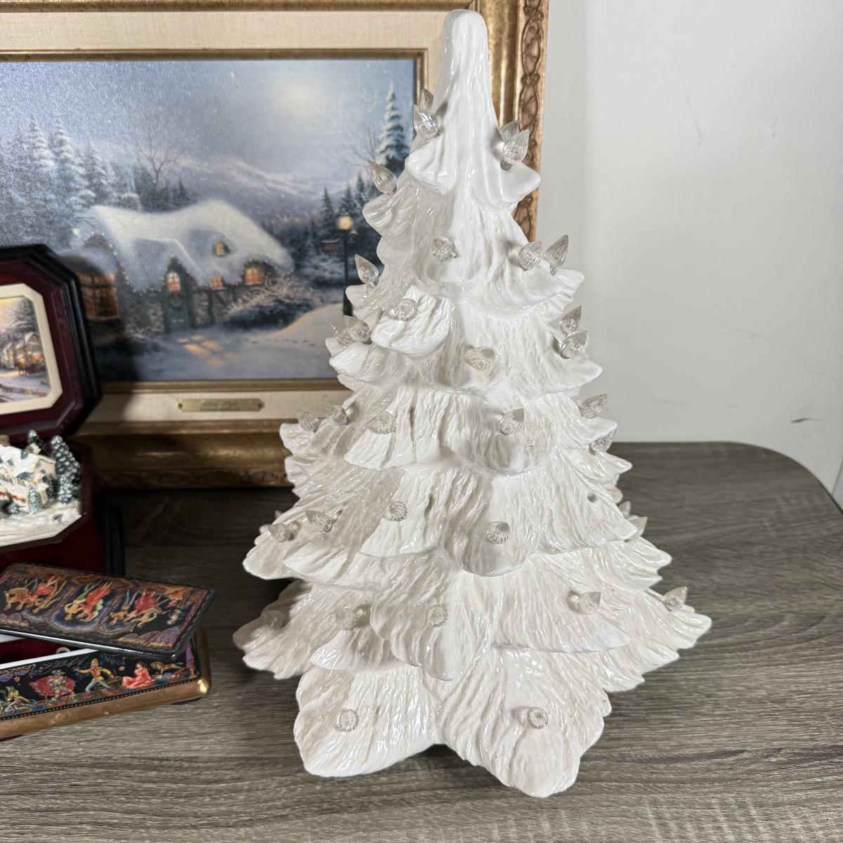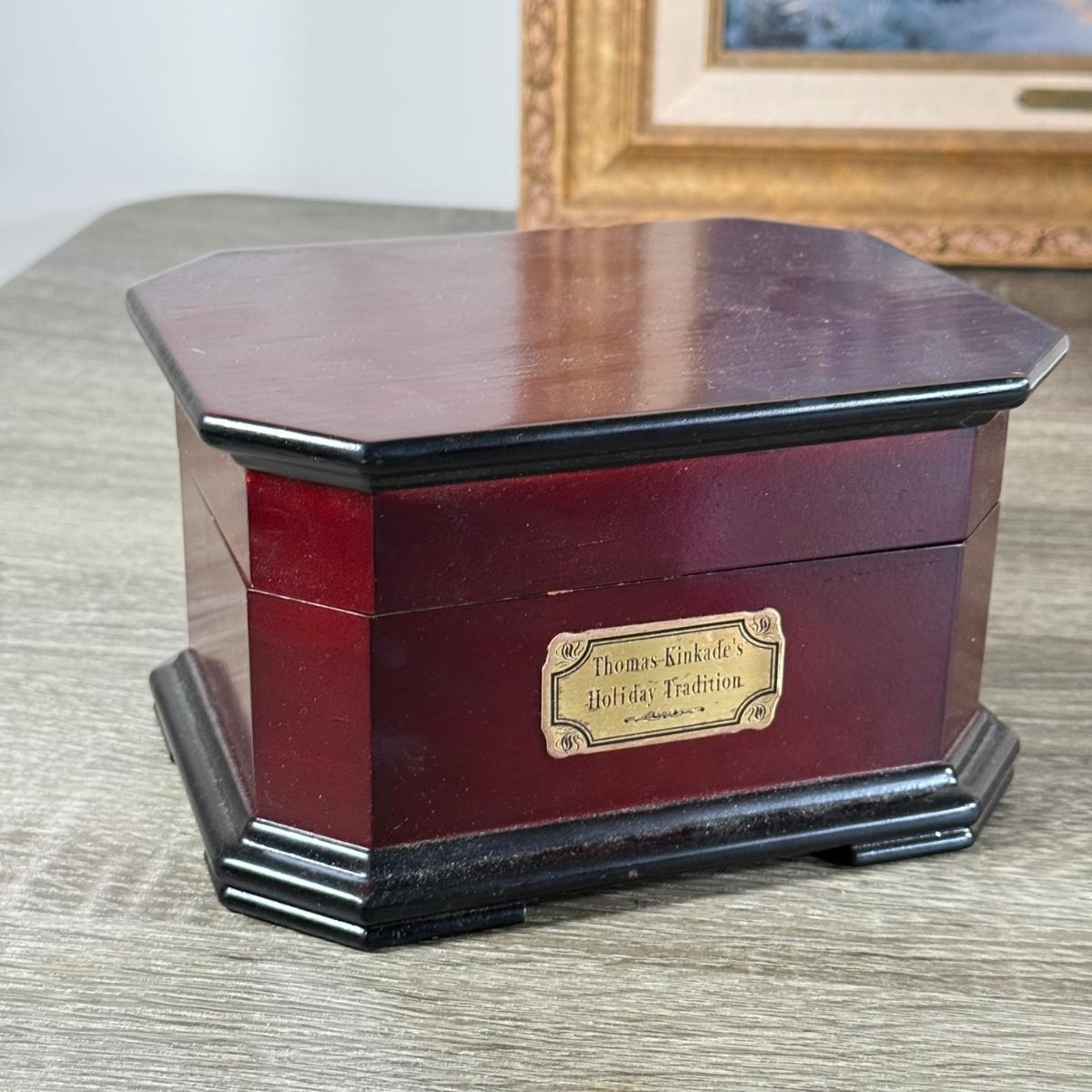 LOT 101K: Thomas Kinkade "Silent Night" Framed Print w/ COA, Holiday Traditions "We Wish You a Merry Christmas" Music Box A5648 & White Ceramic Christmas Tree Top