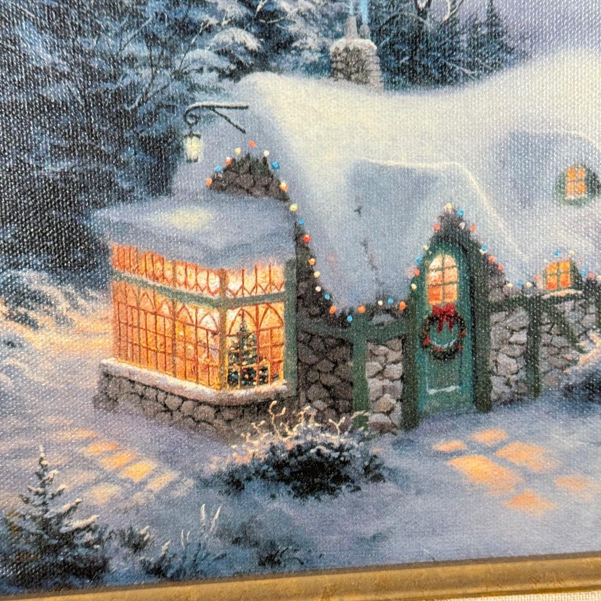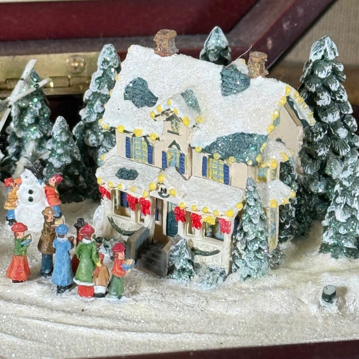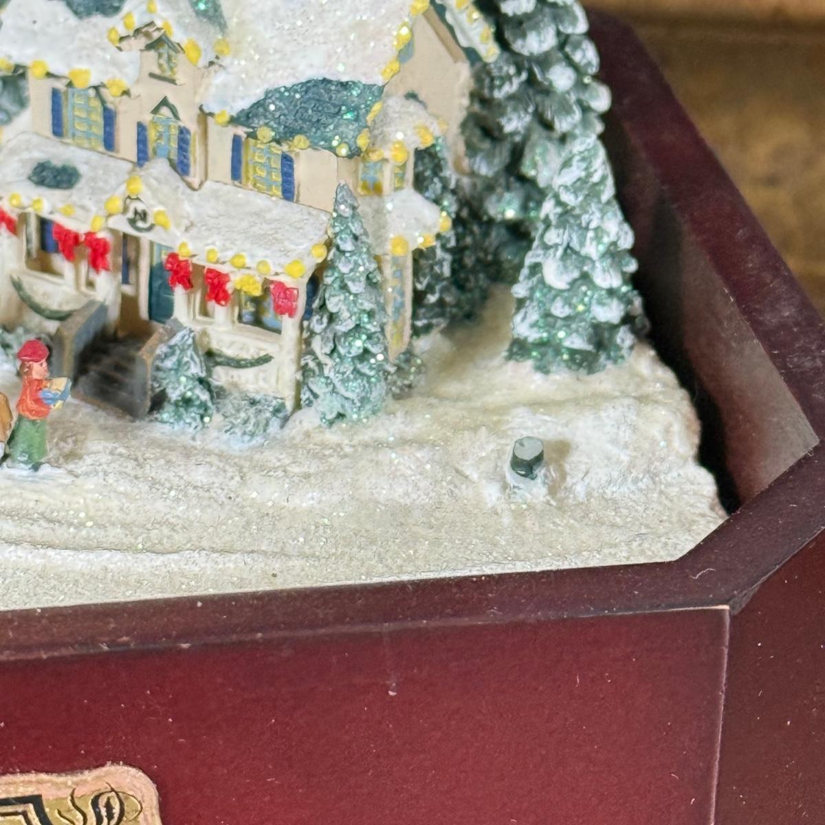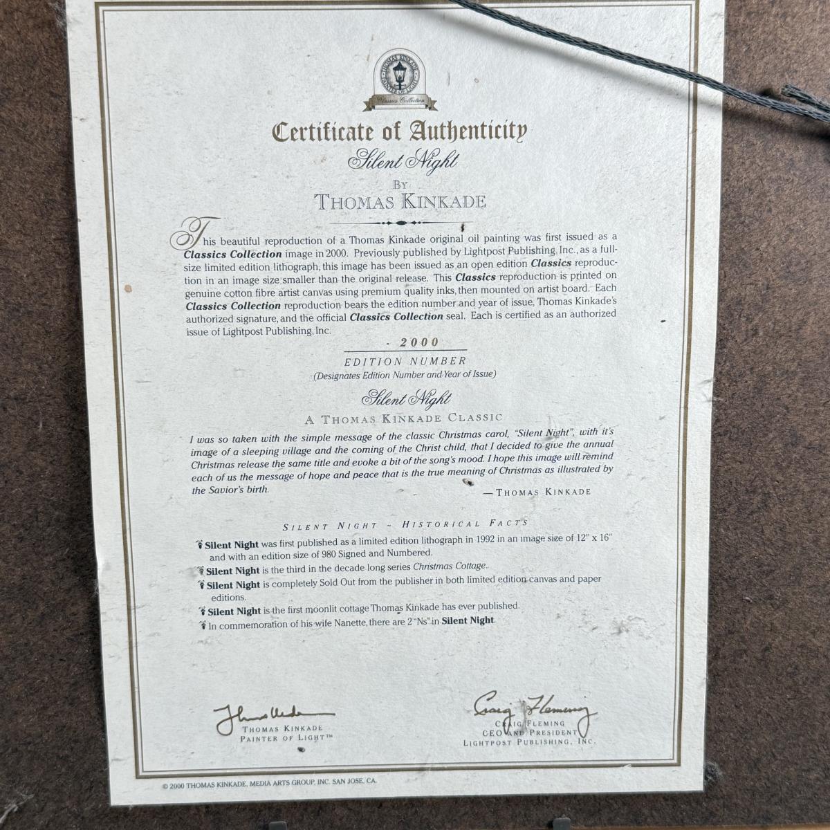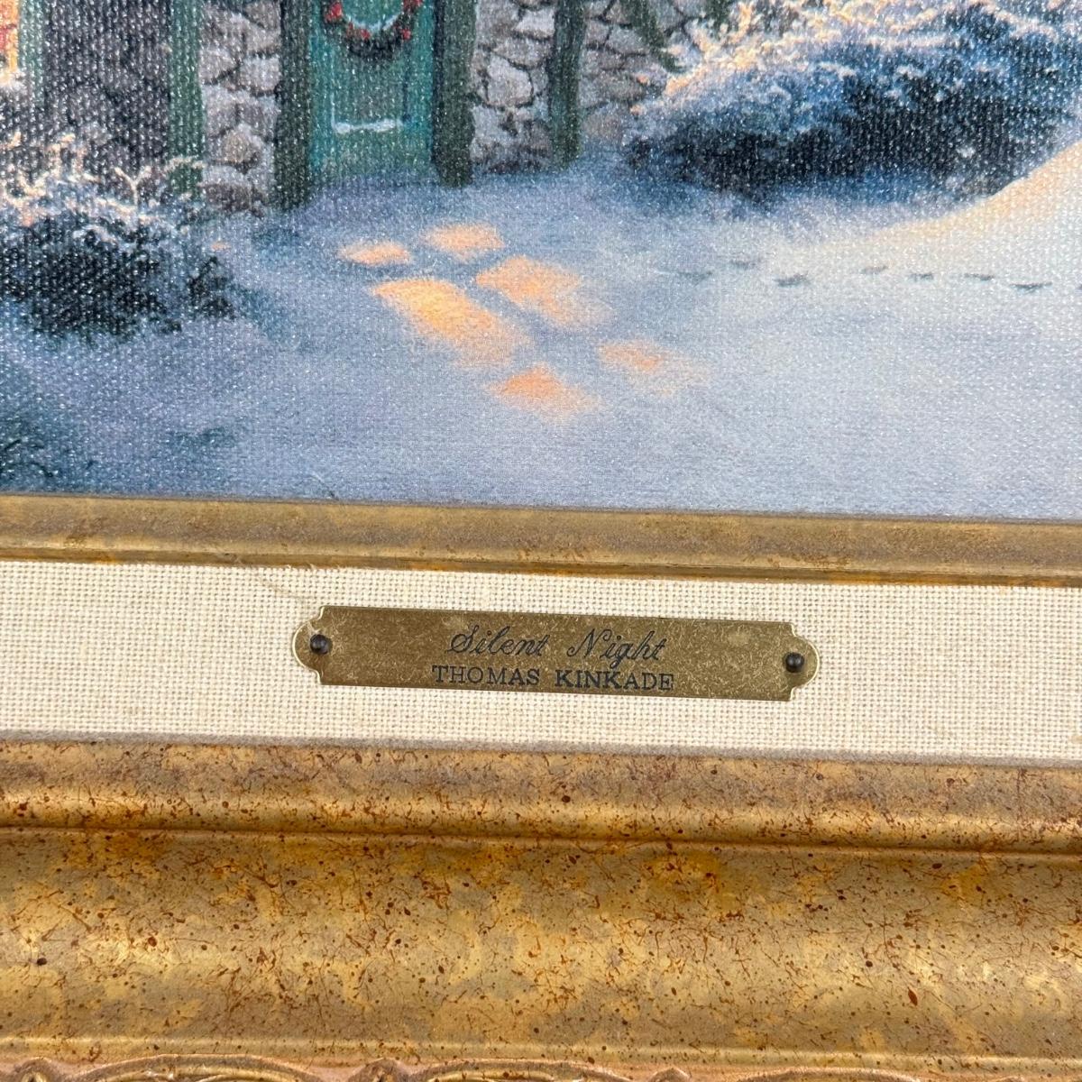 LOT 101K: Thomas Kinkade "Silent Night" Framed Print w/ COA, Holiday Traditions "We Wish You a Merry Christmas" Music Box A5648 & White Ceramic Christmas Tree Top