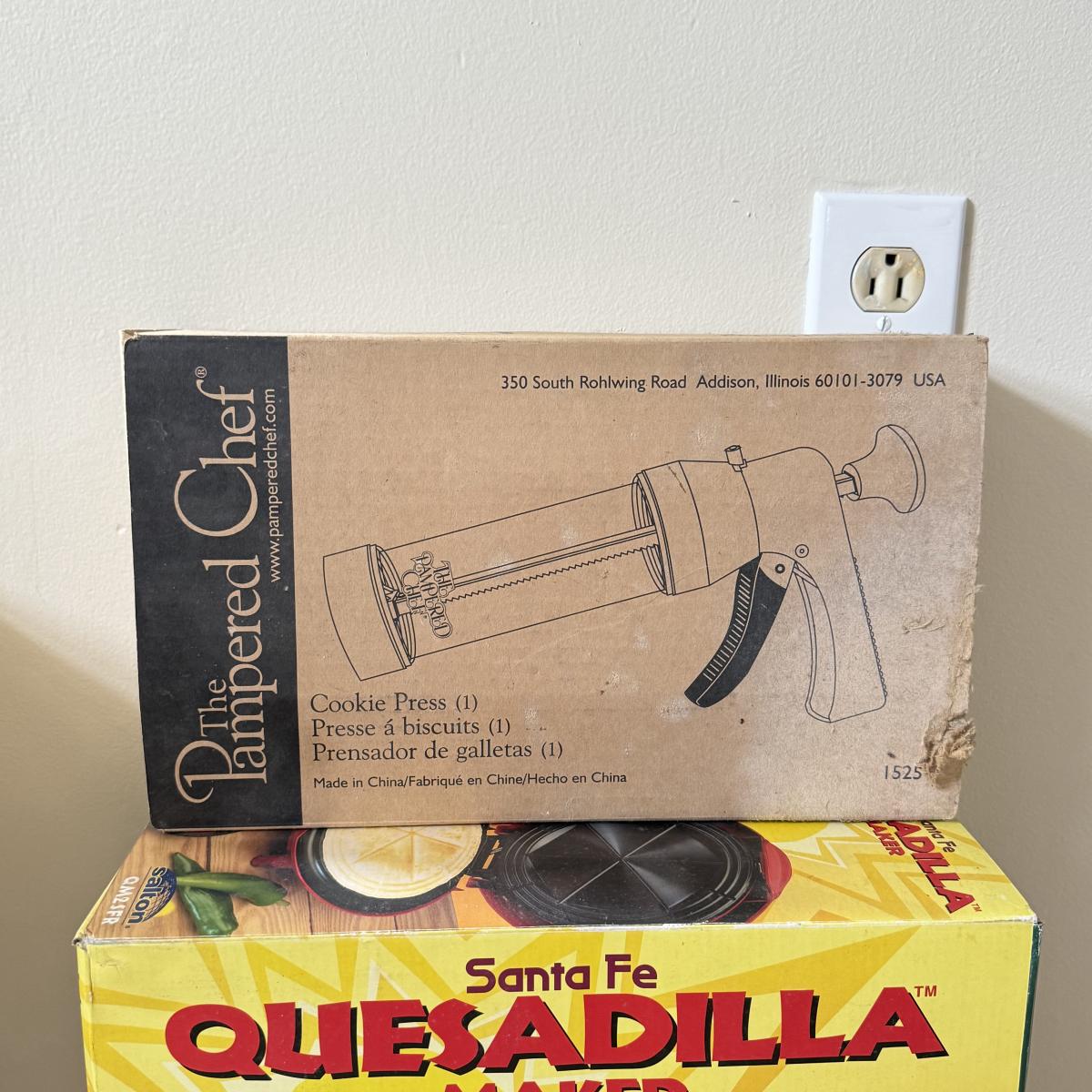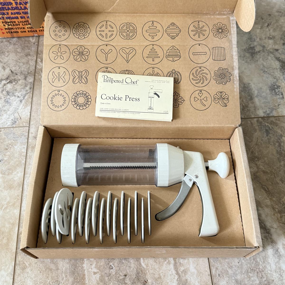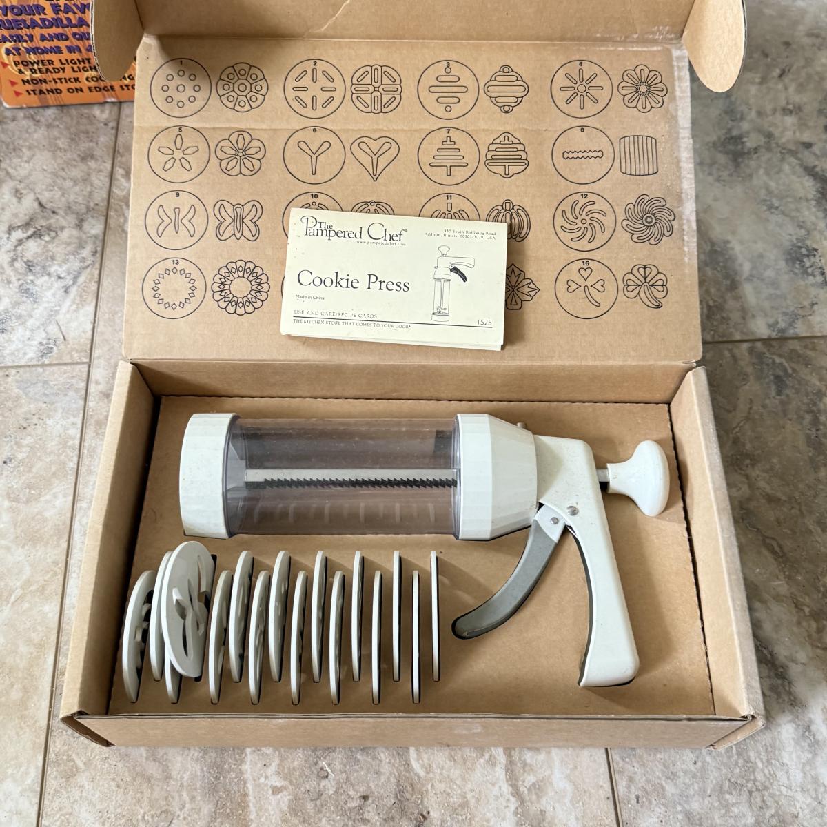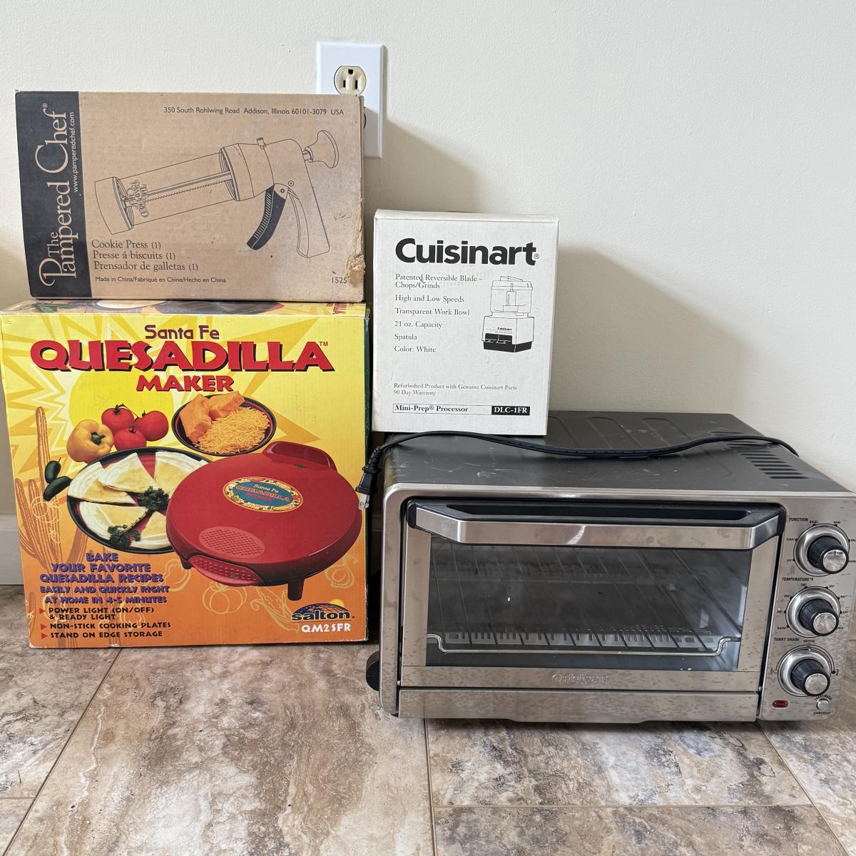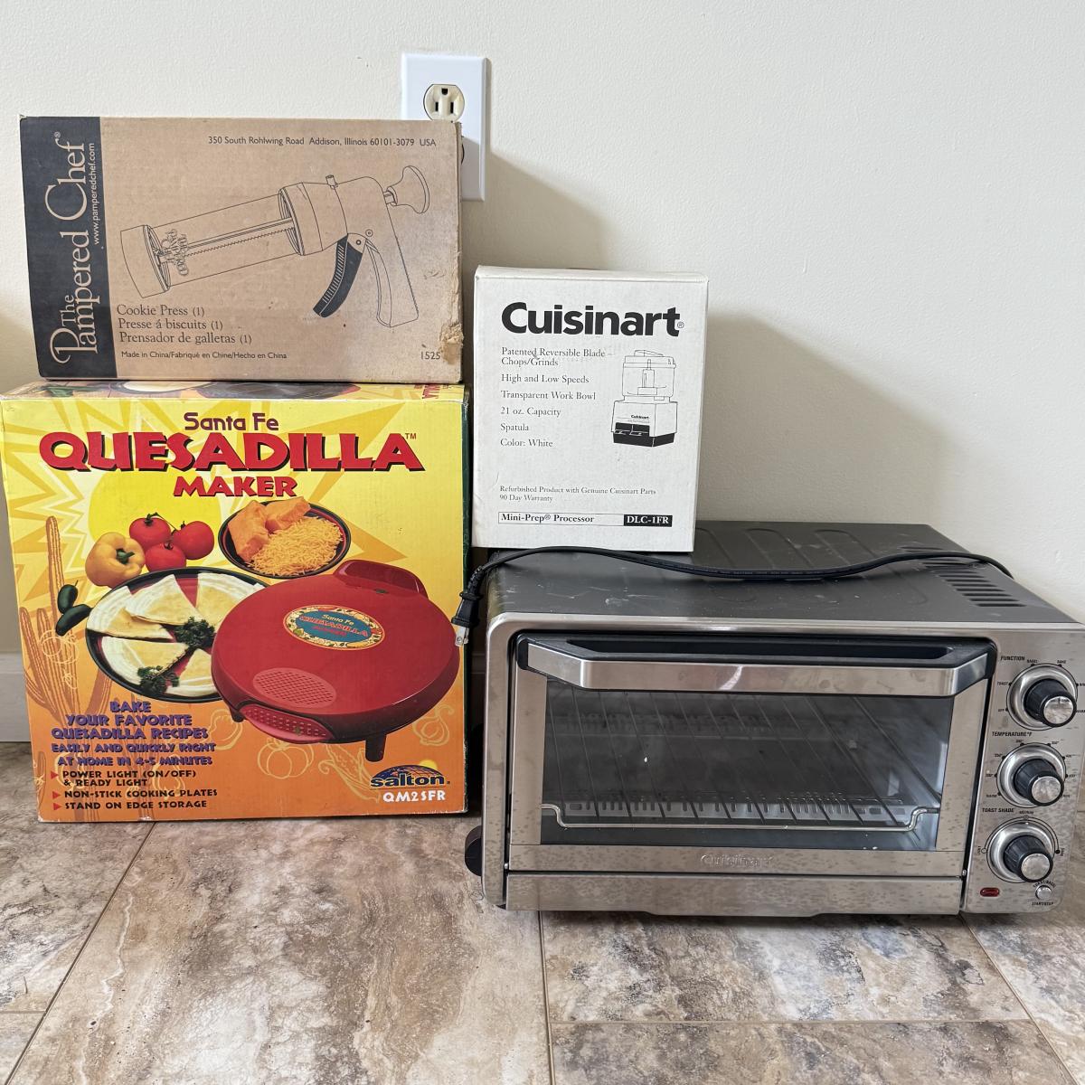 LOT 104K: Kitchen Collection: Santa Fe Quesadilla Maker, Pampered Chef Cookie Press, Cuisinart Toaster Oven Model TOB-40N (DL)