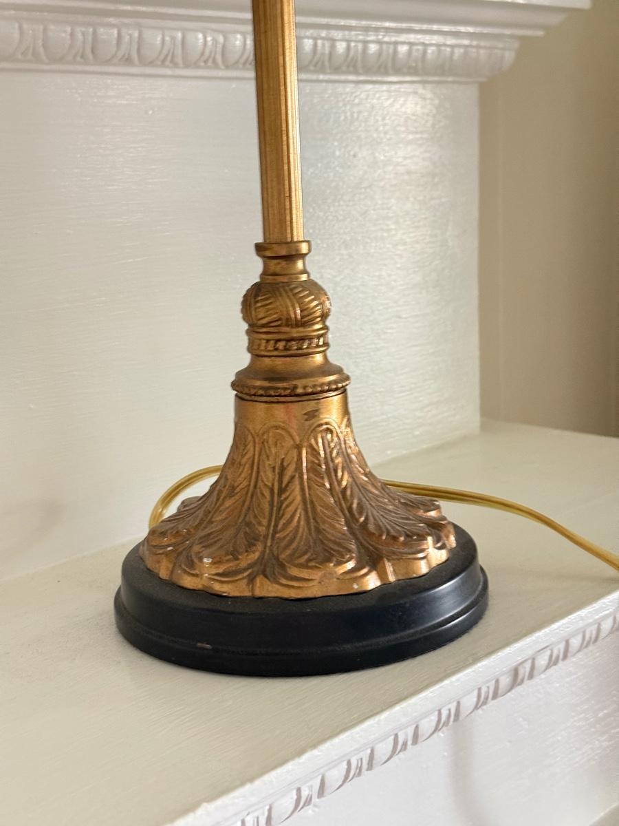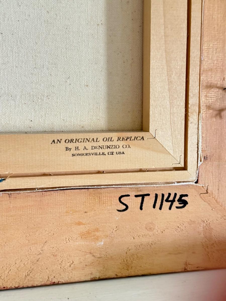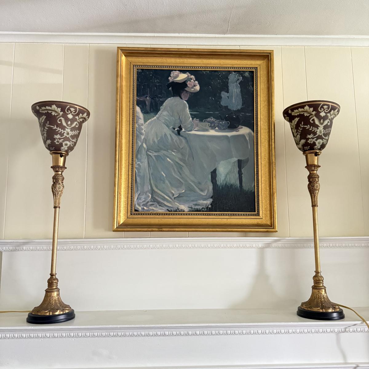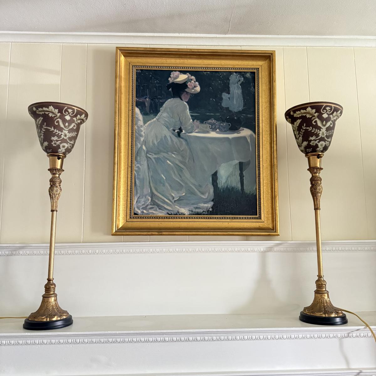 LOT 107L: Framed Original Oil Replica by H. A. DeNunzio Co. & 28" Glass Shade Lamps