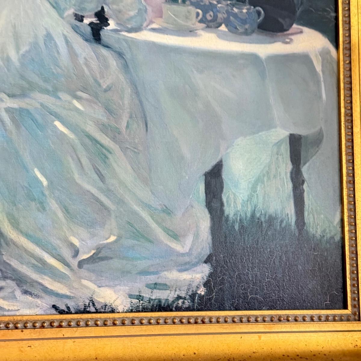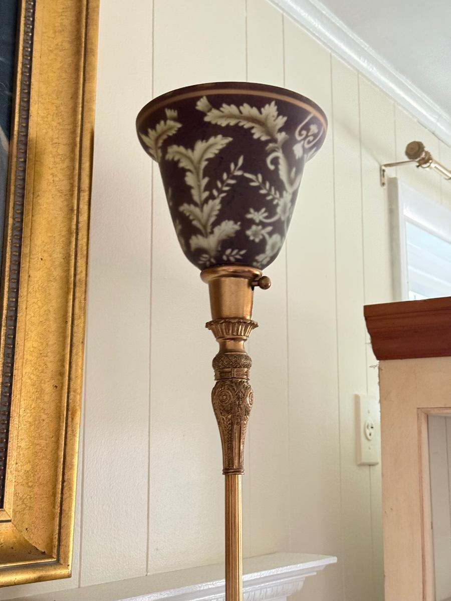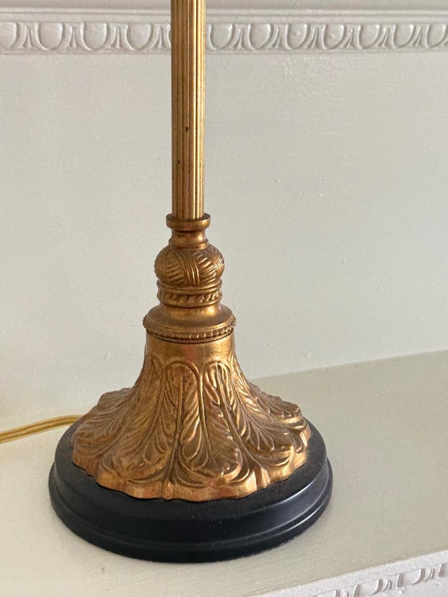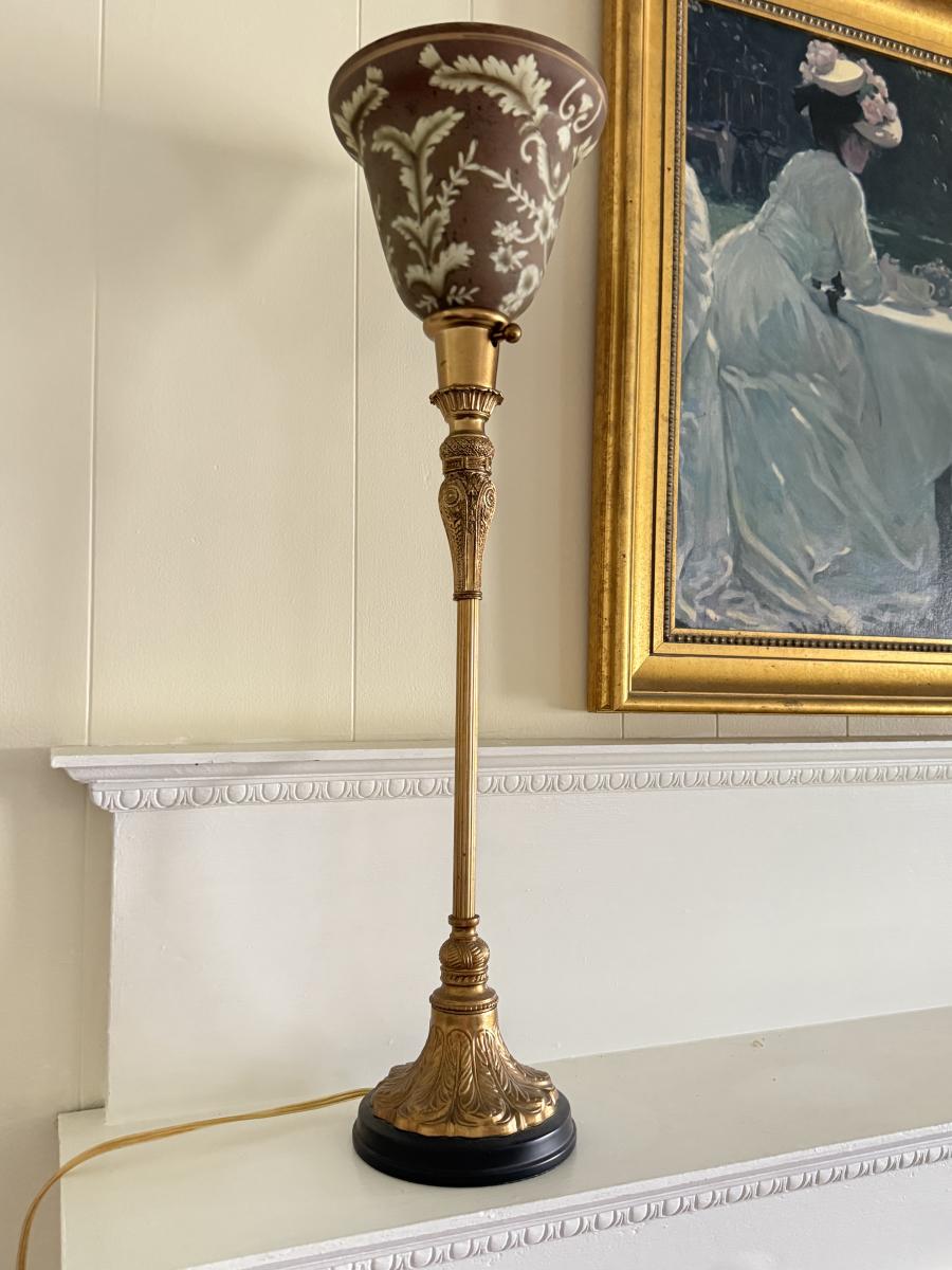 LOT 107L: Framed Original Oil Replica by H. A. DeNunzio Co. & 28" Glass Shade Lamps