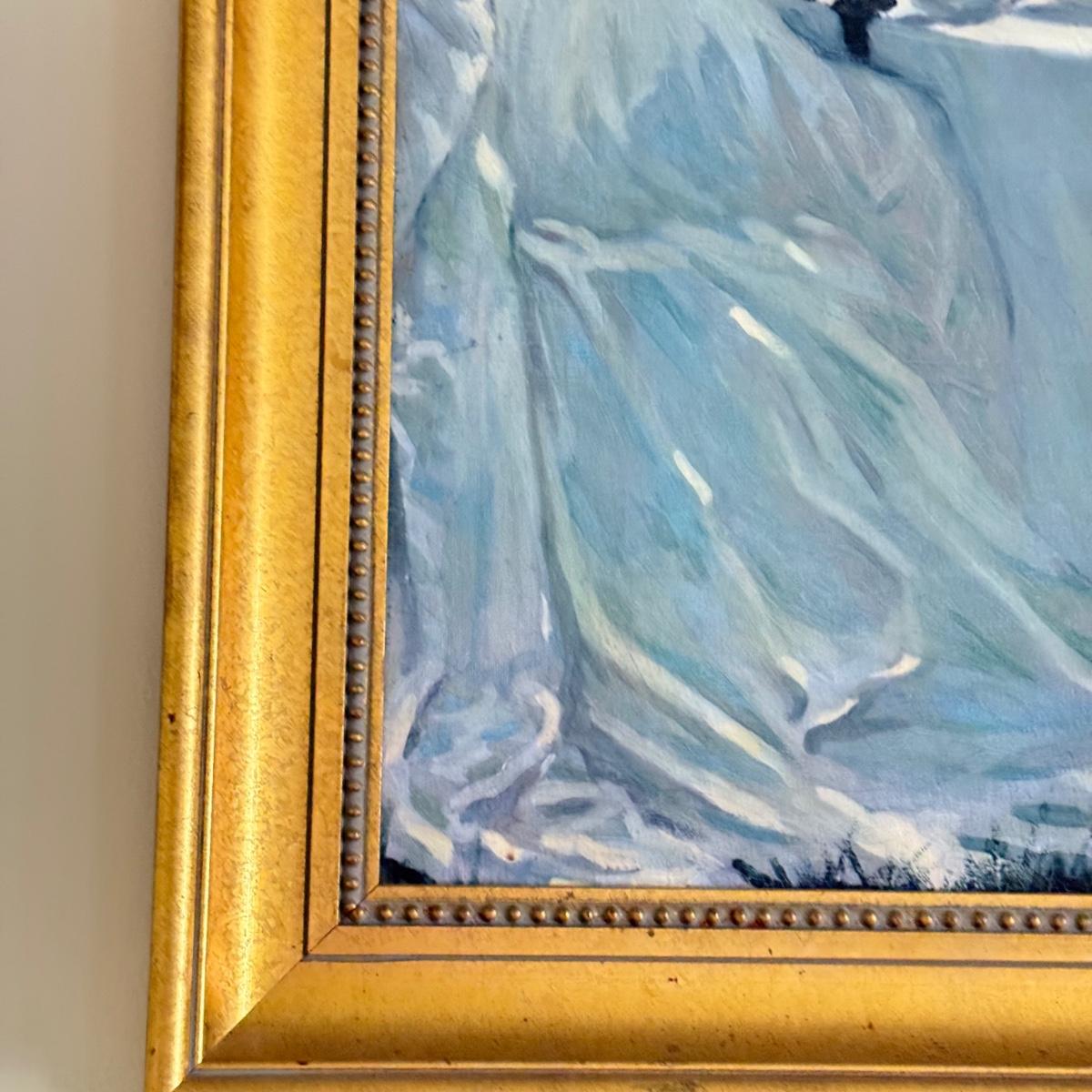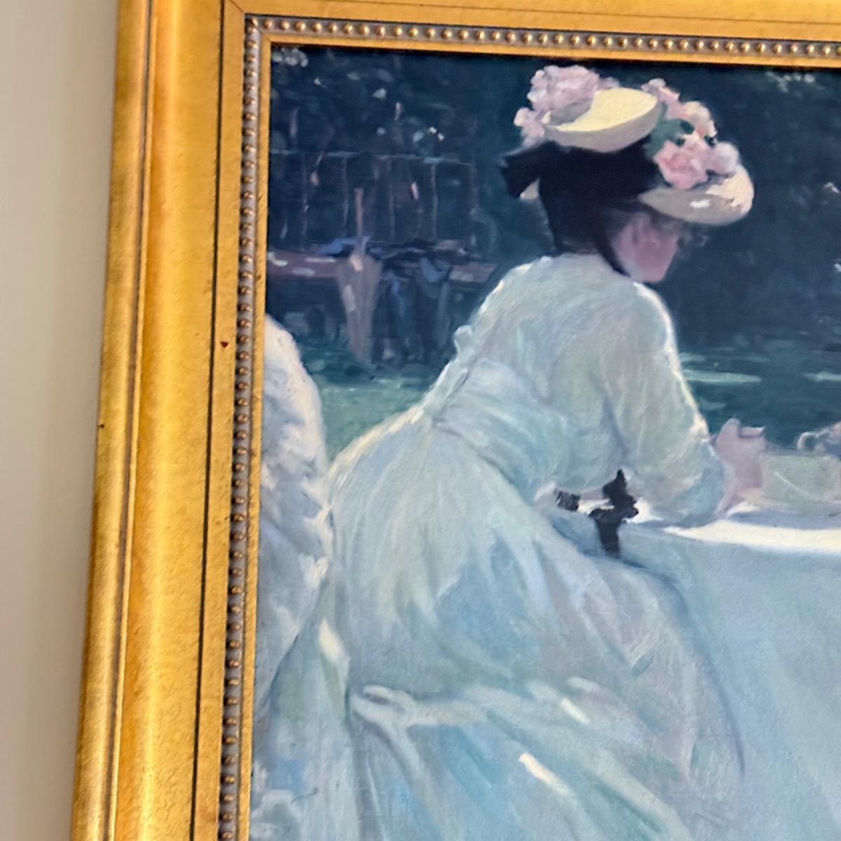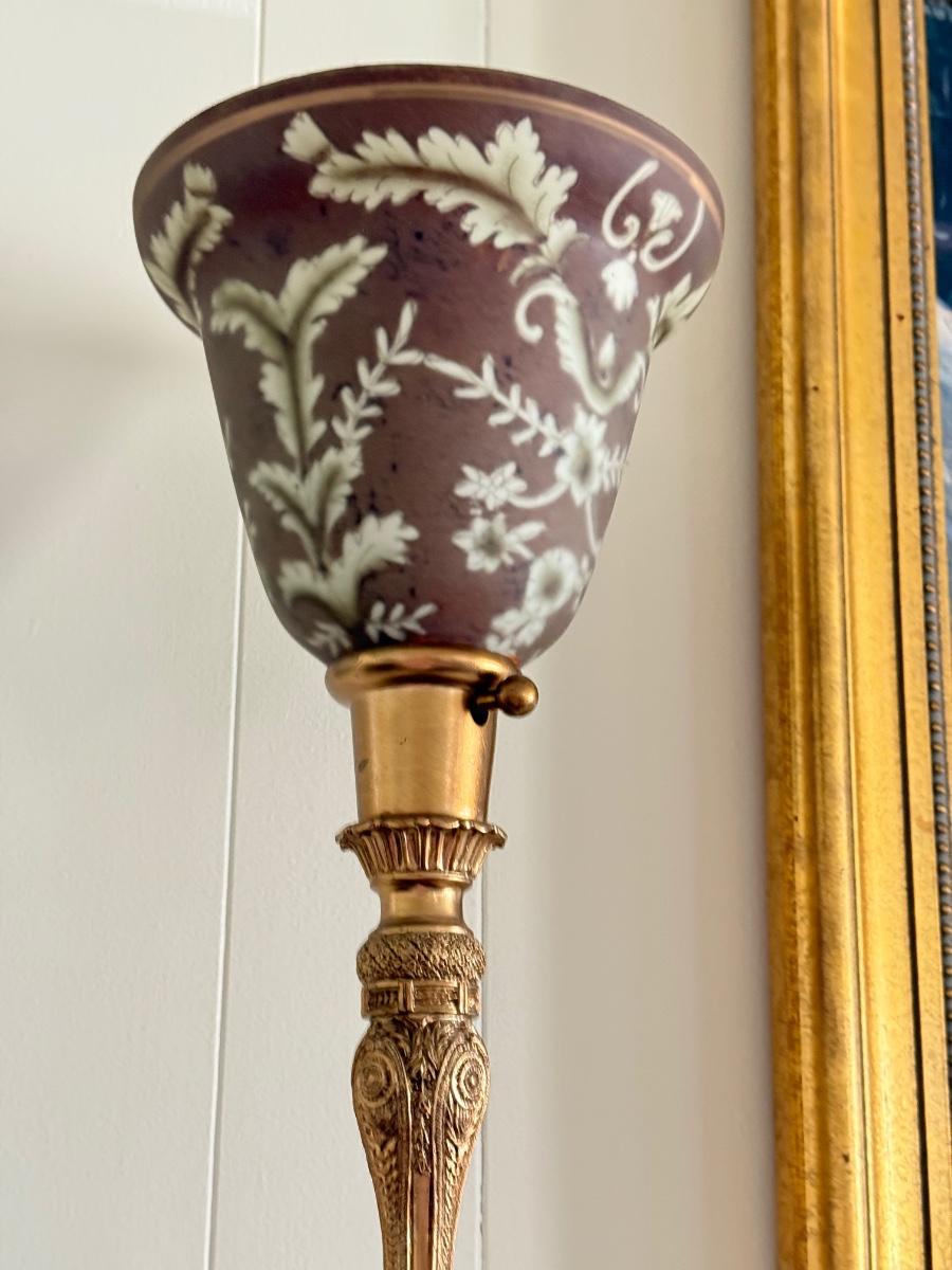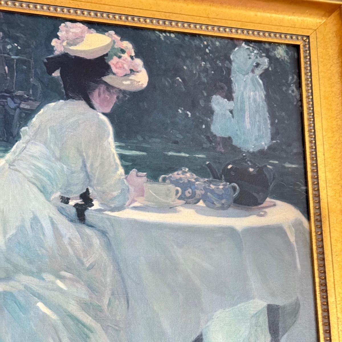 LOT 107L: Framed Original Oil Replica by H. A. DeNunzio Co. & 28" Glass Shade Lamps