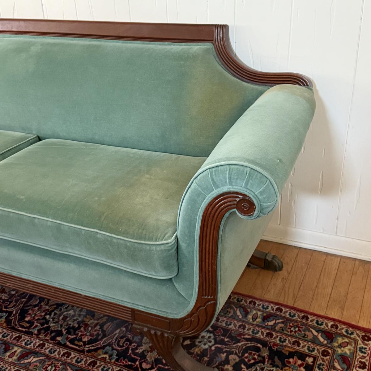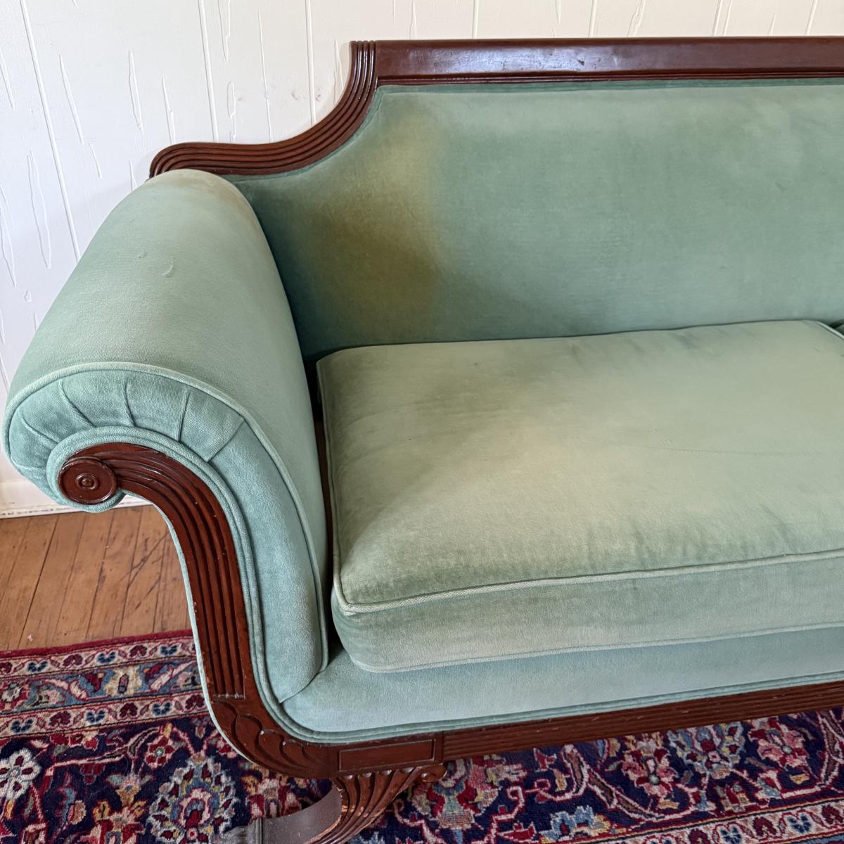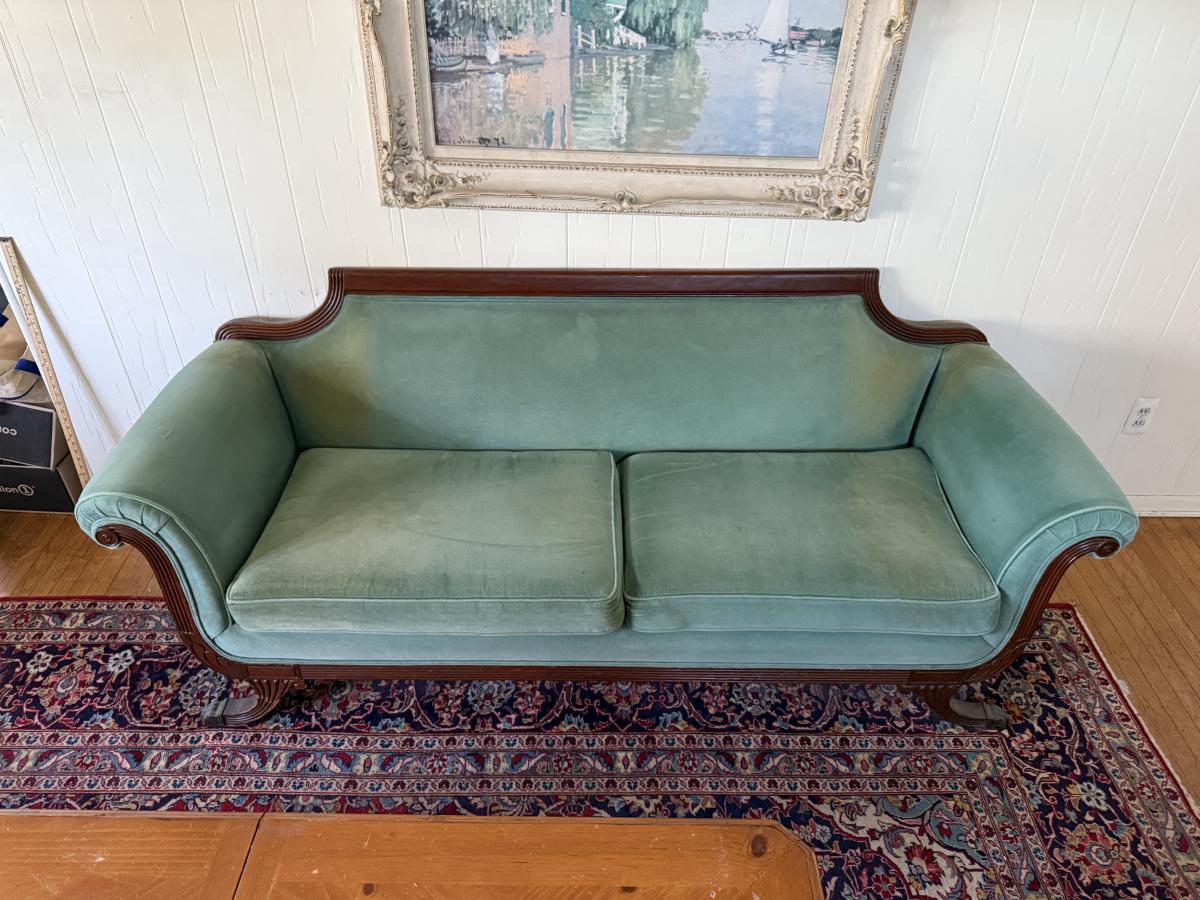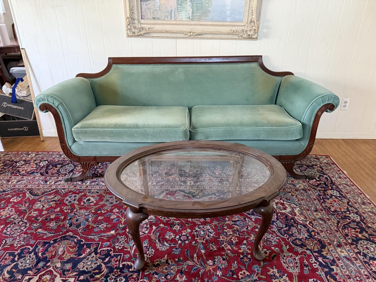 LOT 128L: Vintage Green Duncan Phyfe Style Sofa w/ Glass Top Coffee Table