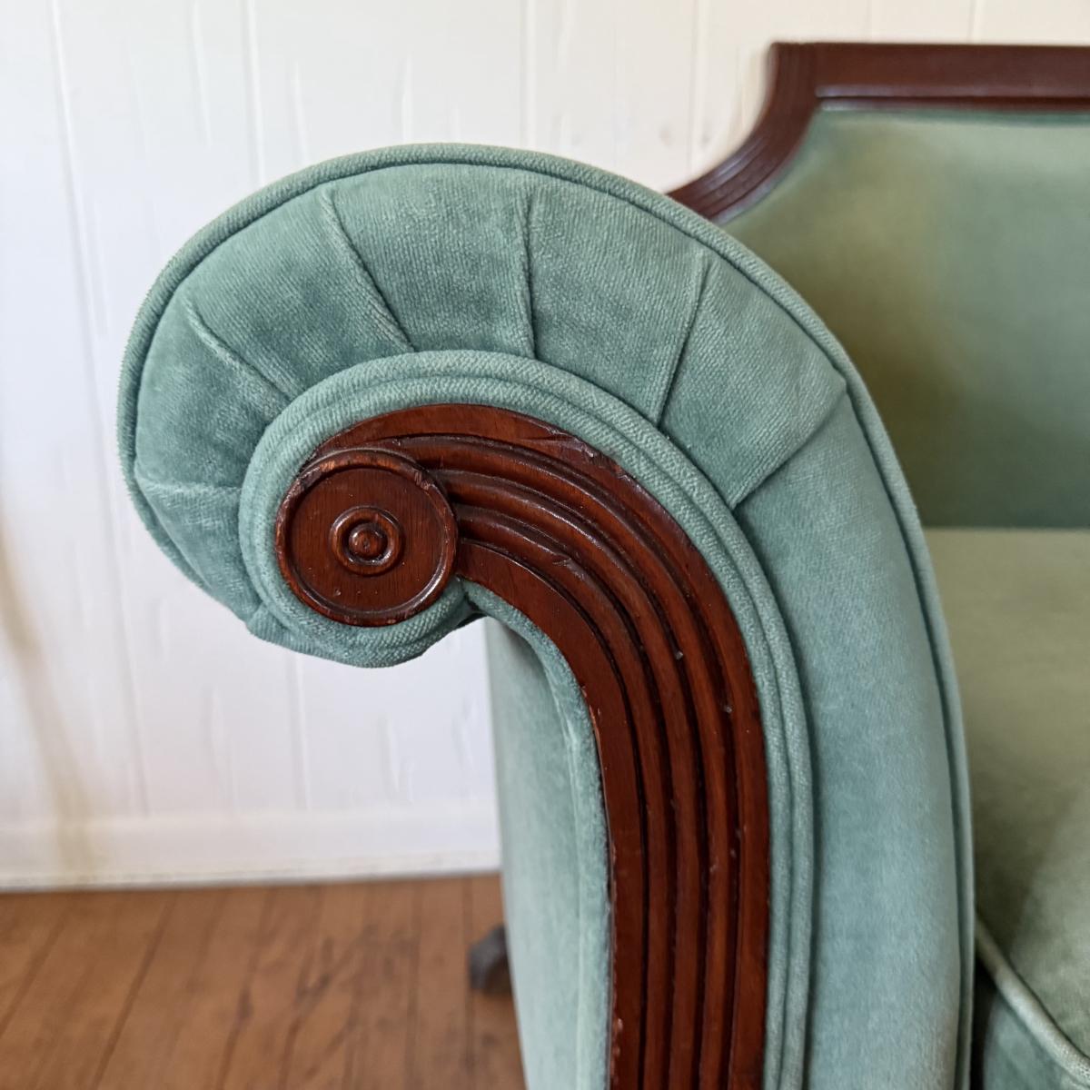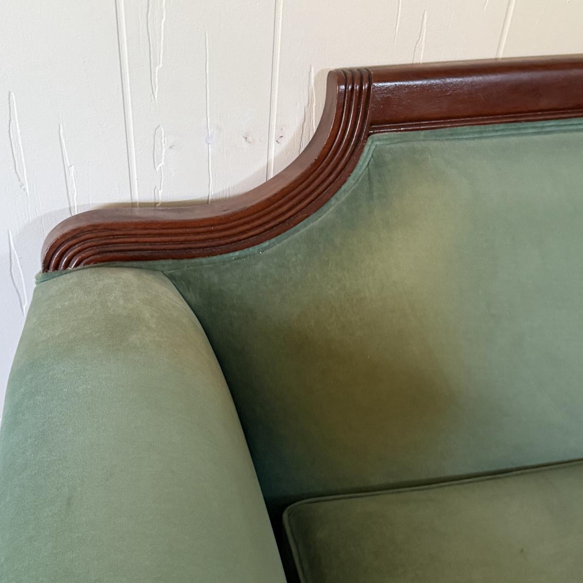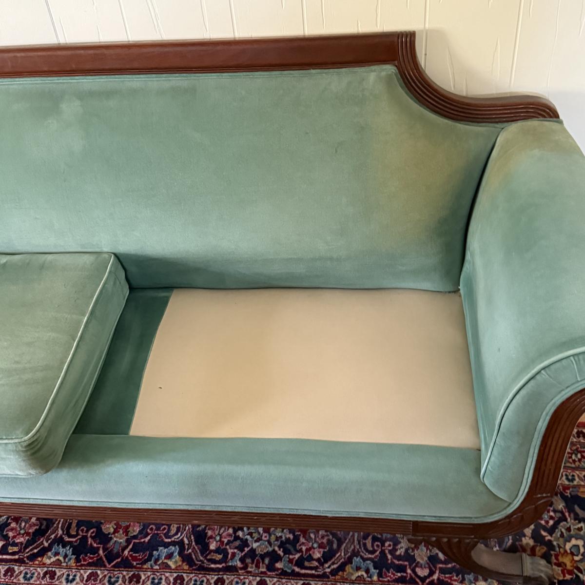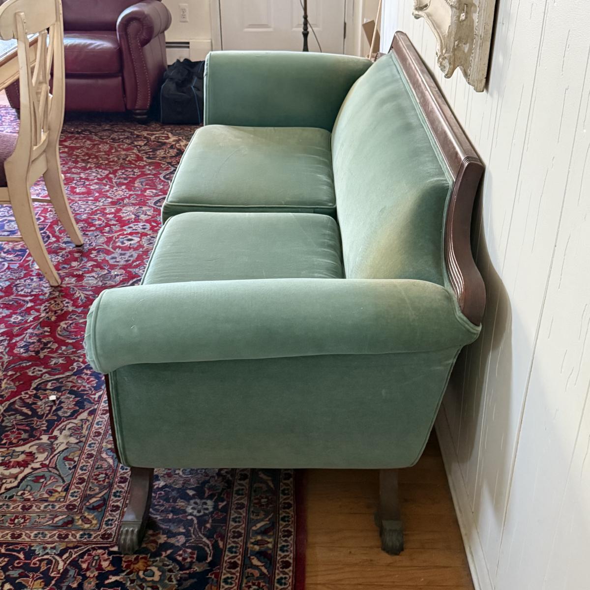 LOT 128L: Vintage Green Duncan Phyfe Style Sofa w/ Glass Top Coffee Table