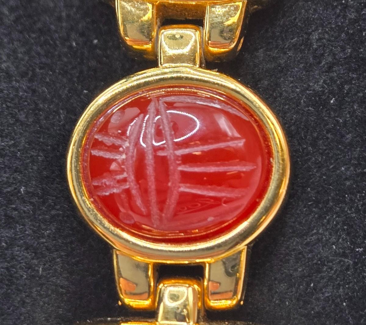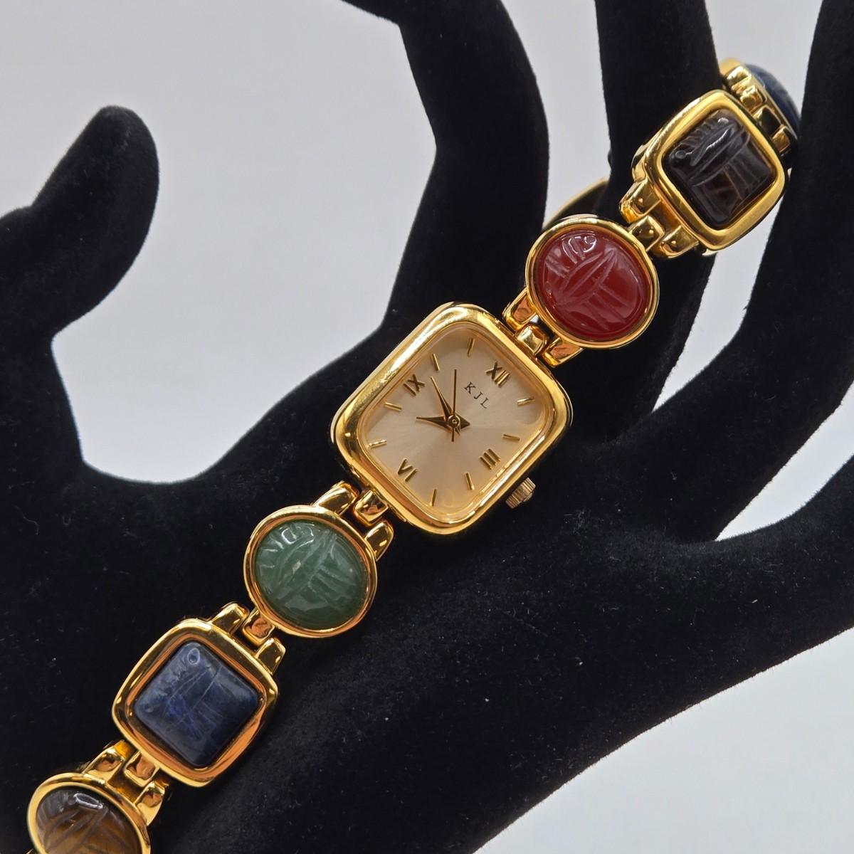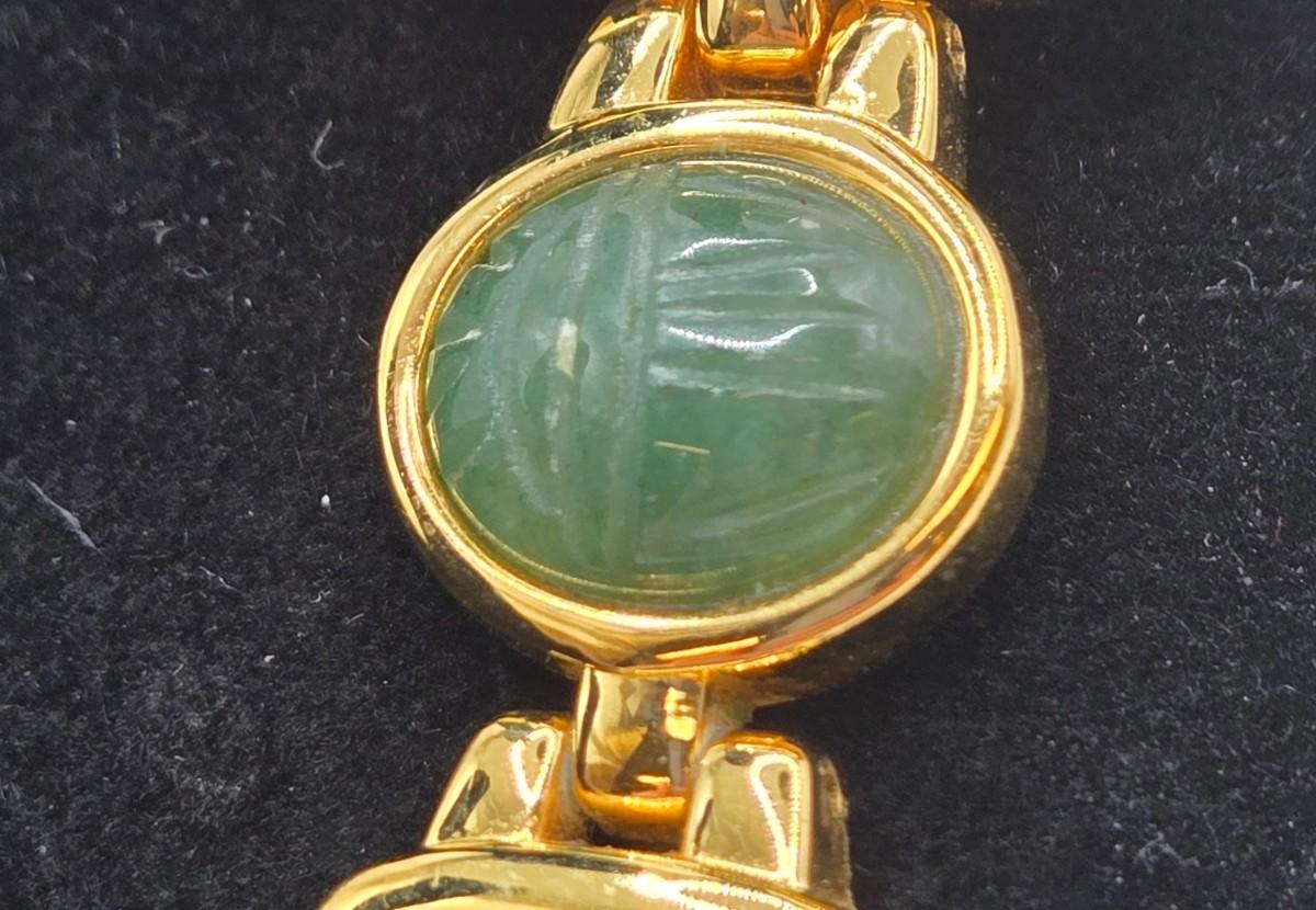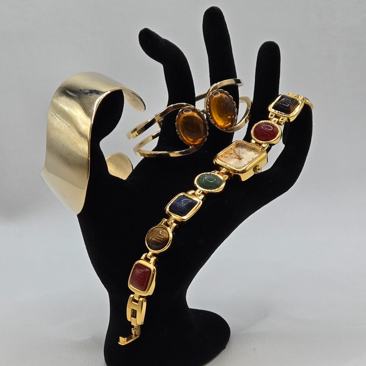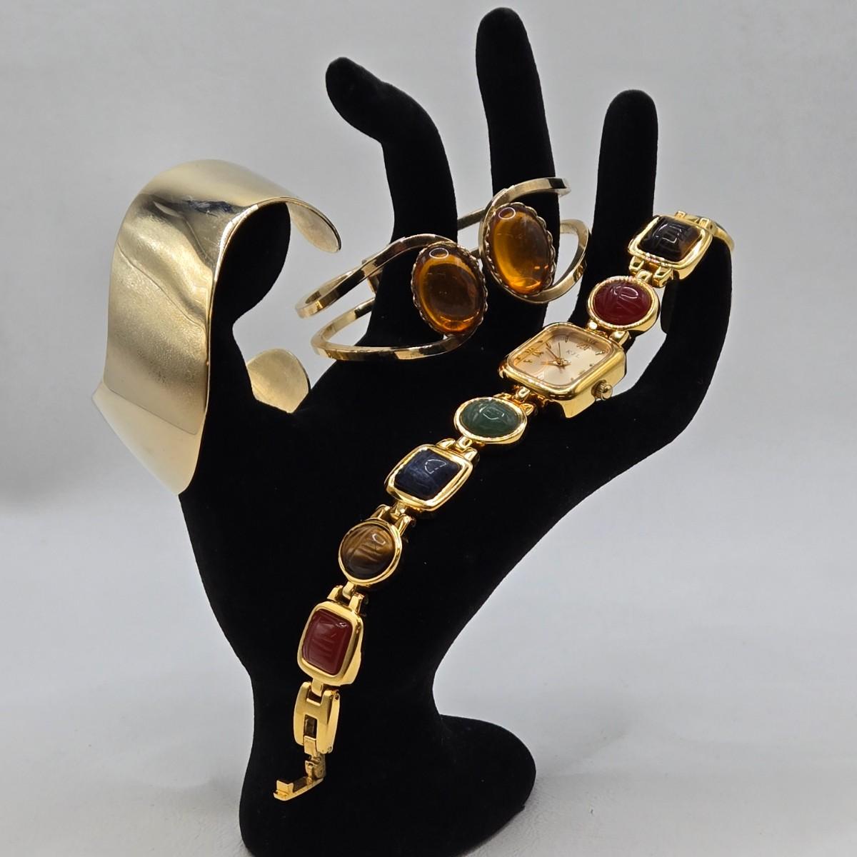 LOT 25: Gold-tone Cuff Bracelet, Gold-tone Spring Open Bracelet w/ Amber Colored Gems, and Kenneth Jay Lane Scarab Gemstone Watch