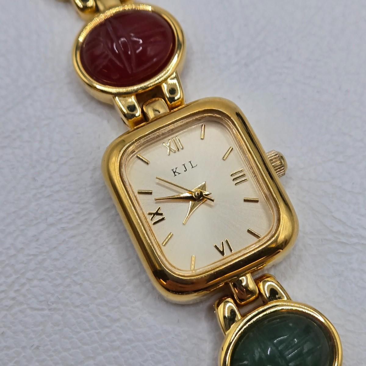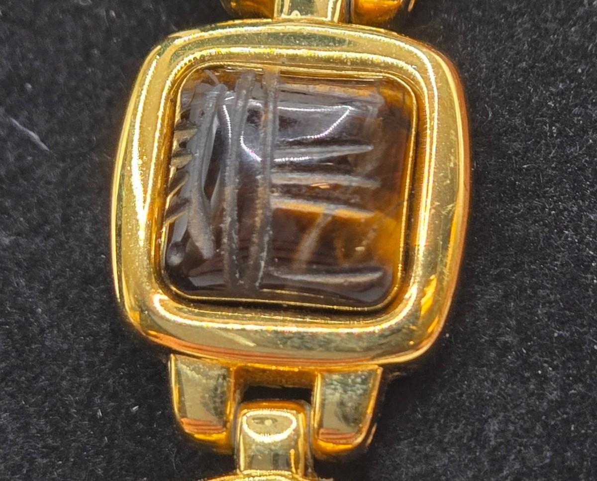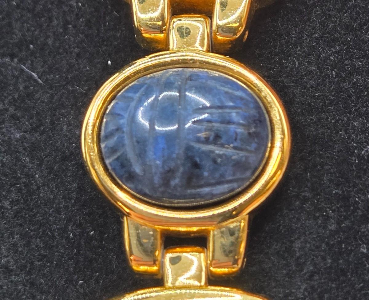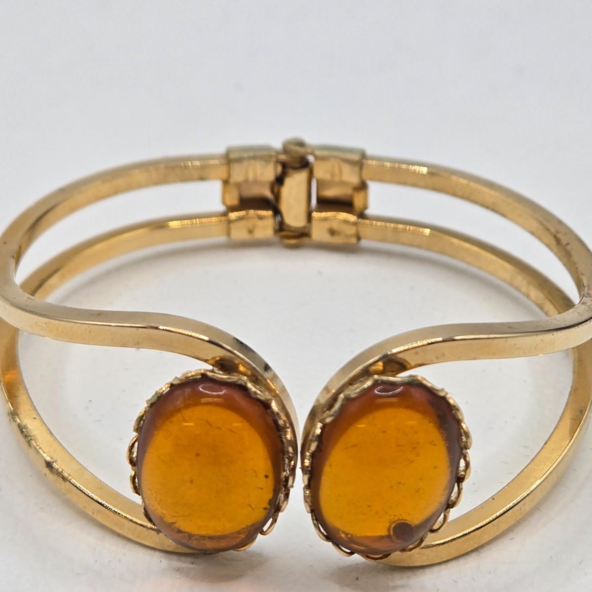 LOT 25: Gold-tone Cuff Bracelet, Gold-tone Spring Open Bracelet w/ Amber Colored Gems, and Kenneth Jay Lane Scarab Gemstone Watch