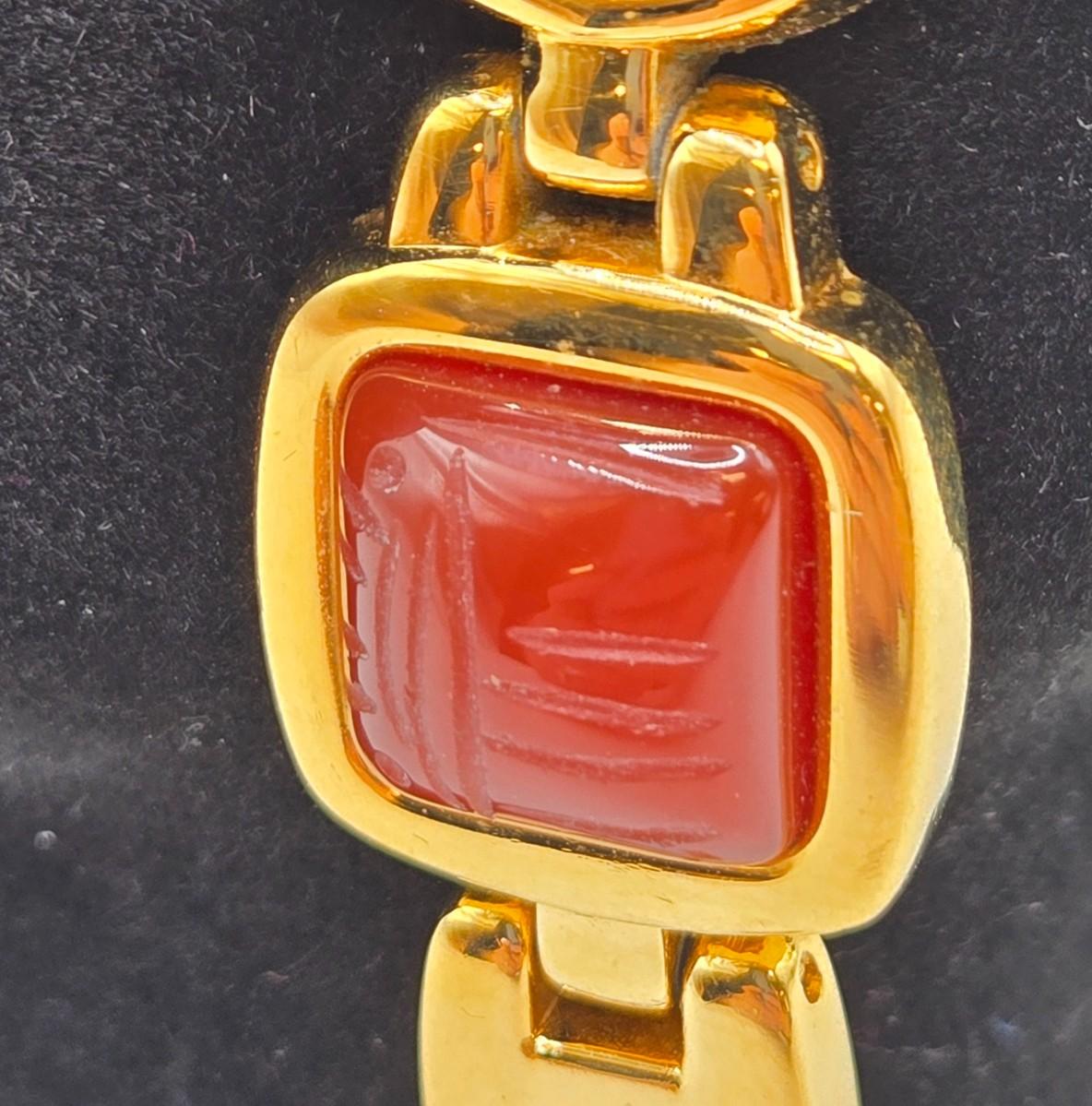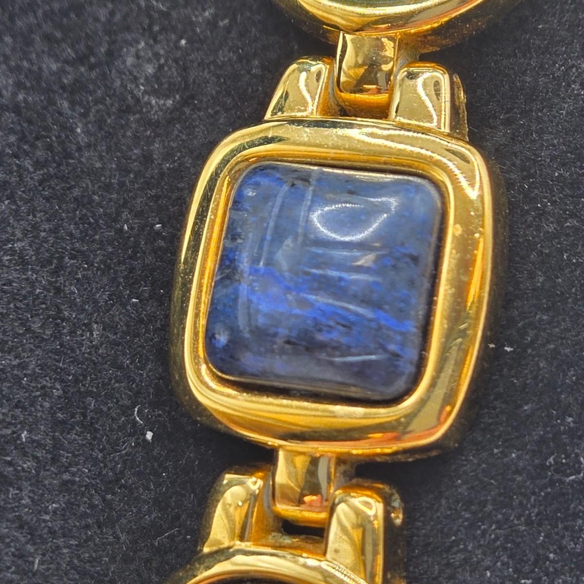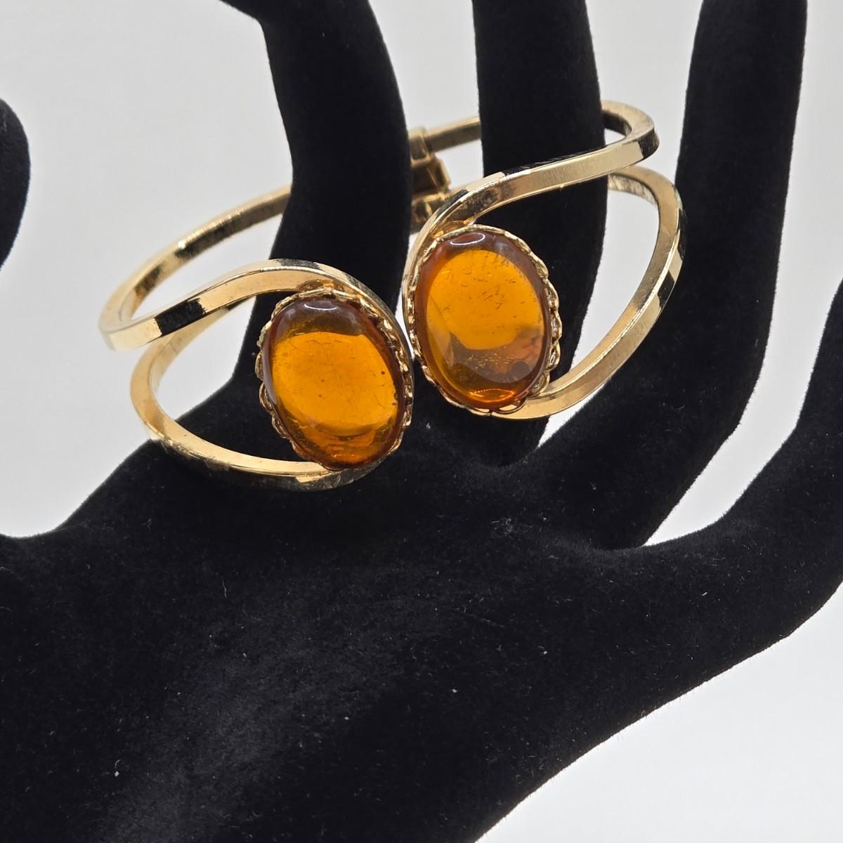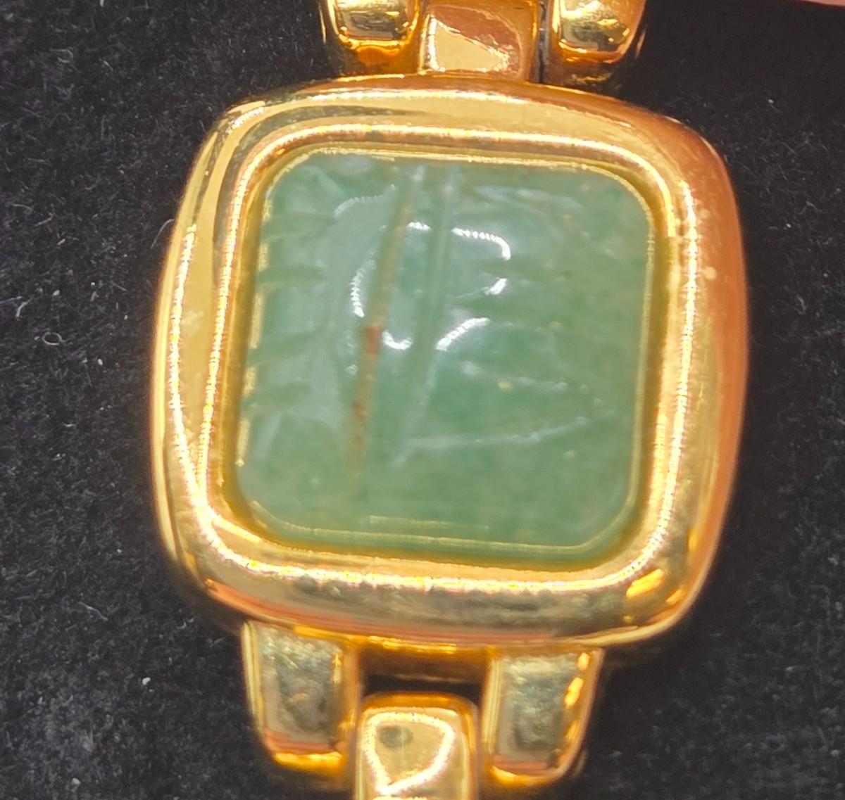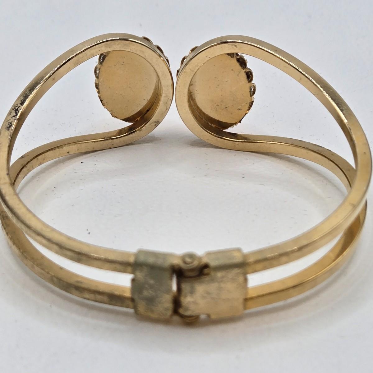 LOT 25: Gold-tone Cuff Bracelet, Gold-tone Spring Open Bracelet w/ Amber Colored Gems, and Kenneth Jay Lane Scarab Gemstone Watch