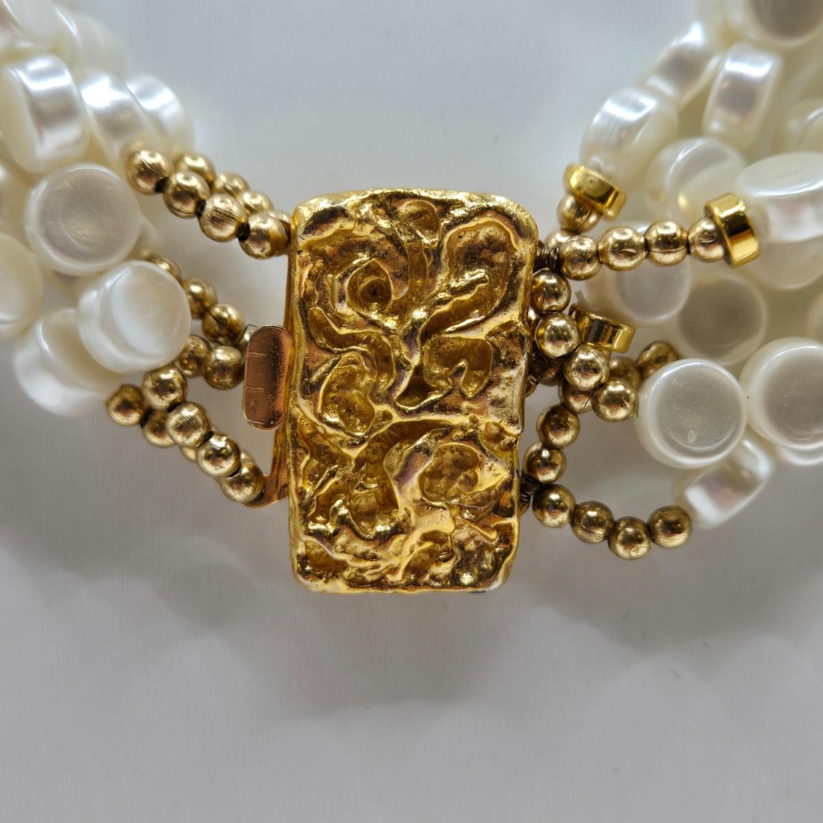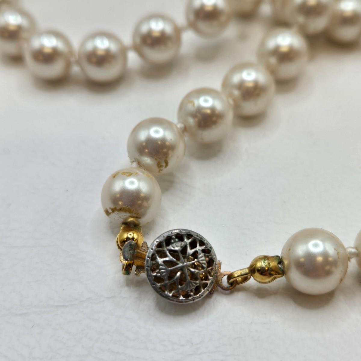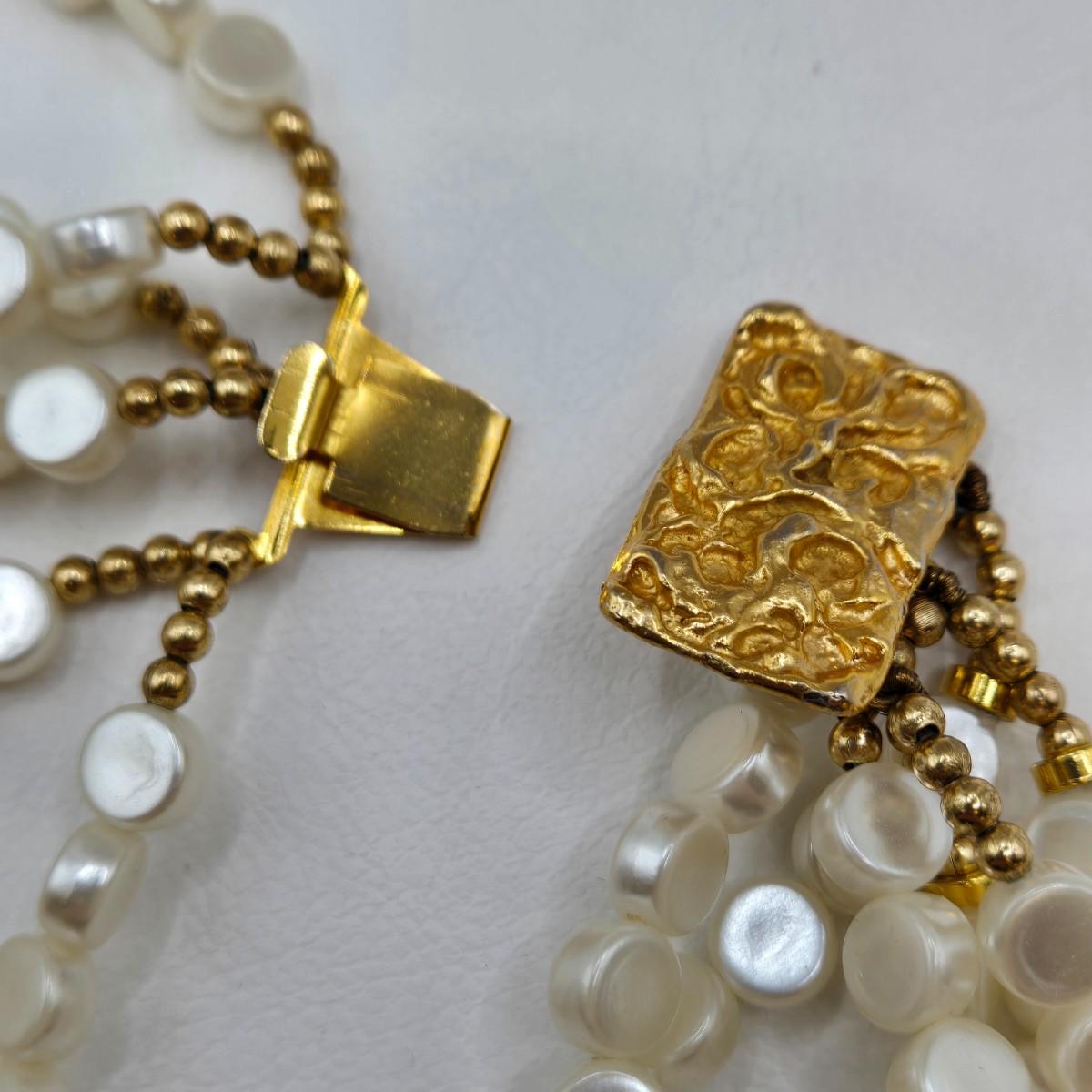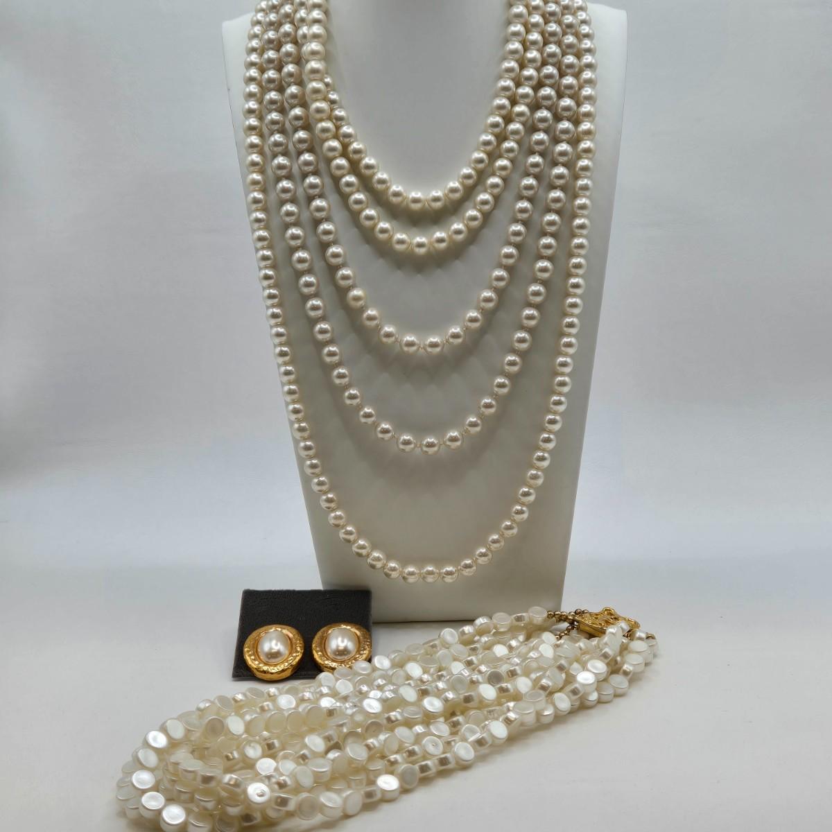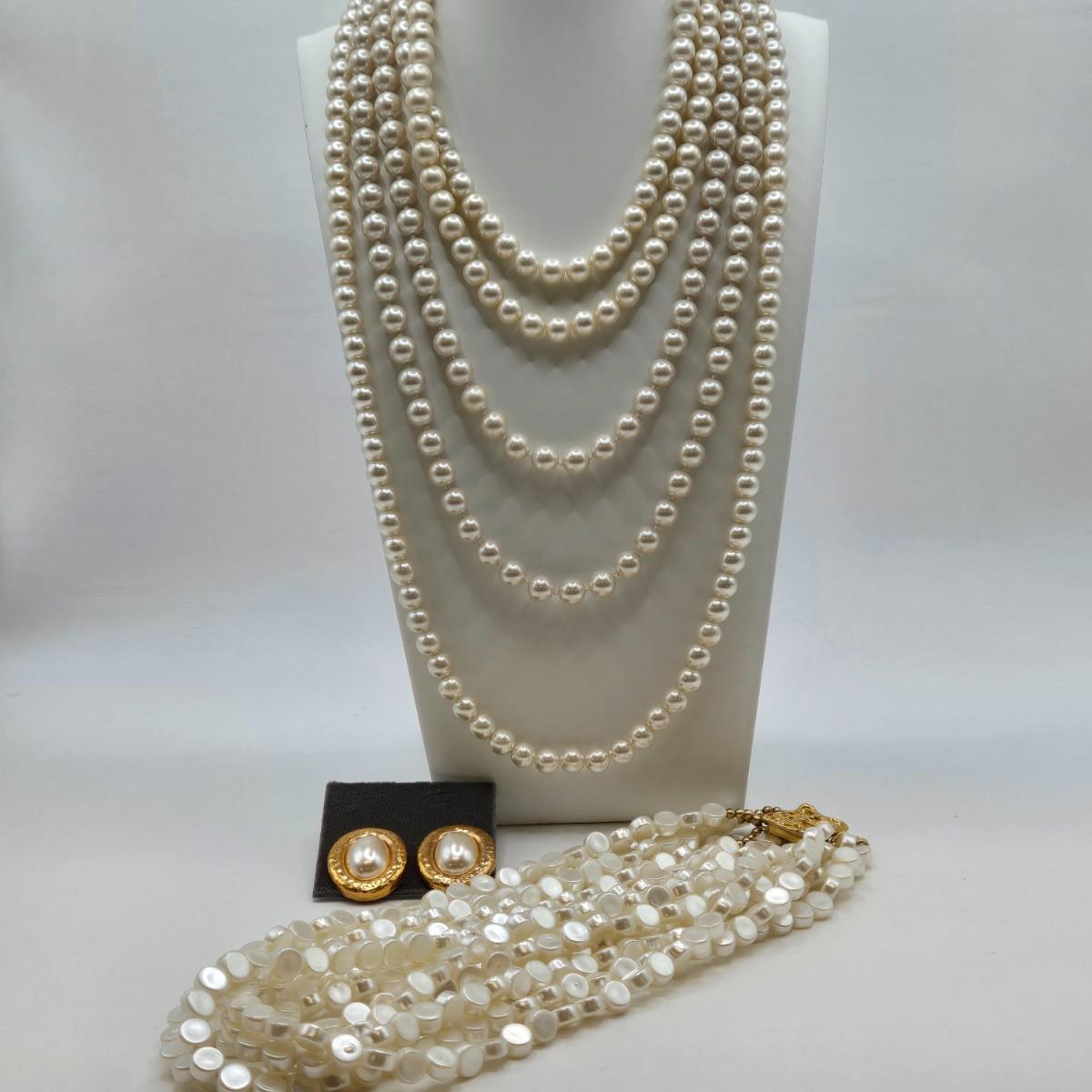 LOT 33: Three Faux Pearl Neclaces, Multiple Strand Pearl-like Necklace w/ Gold-tone Clasp, and Gold-tone and Pearl-like Clip Earrings