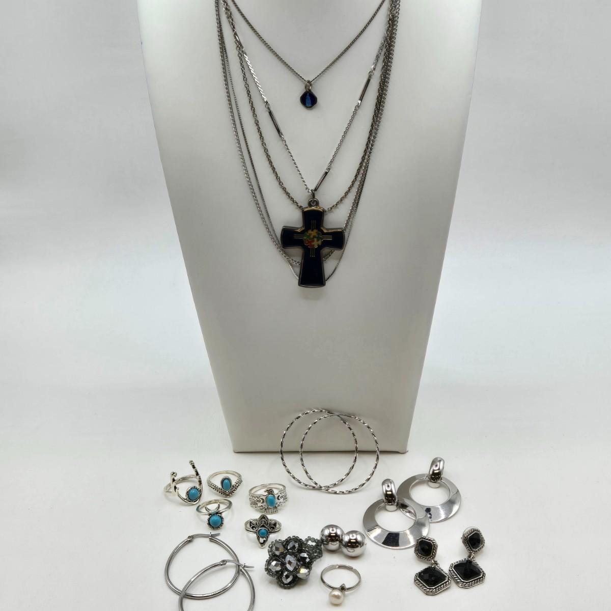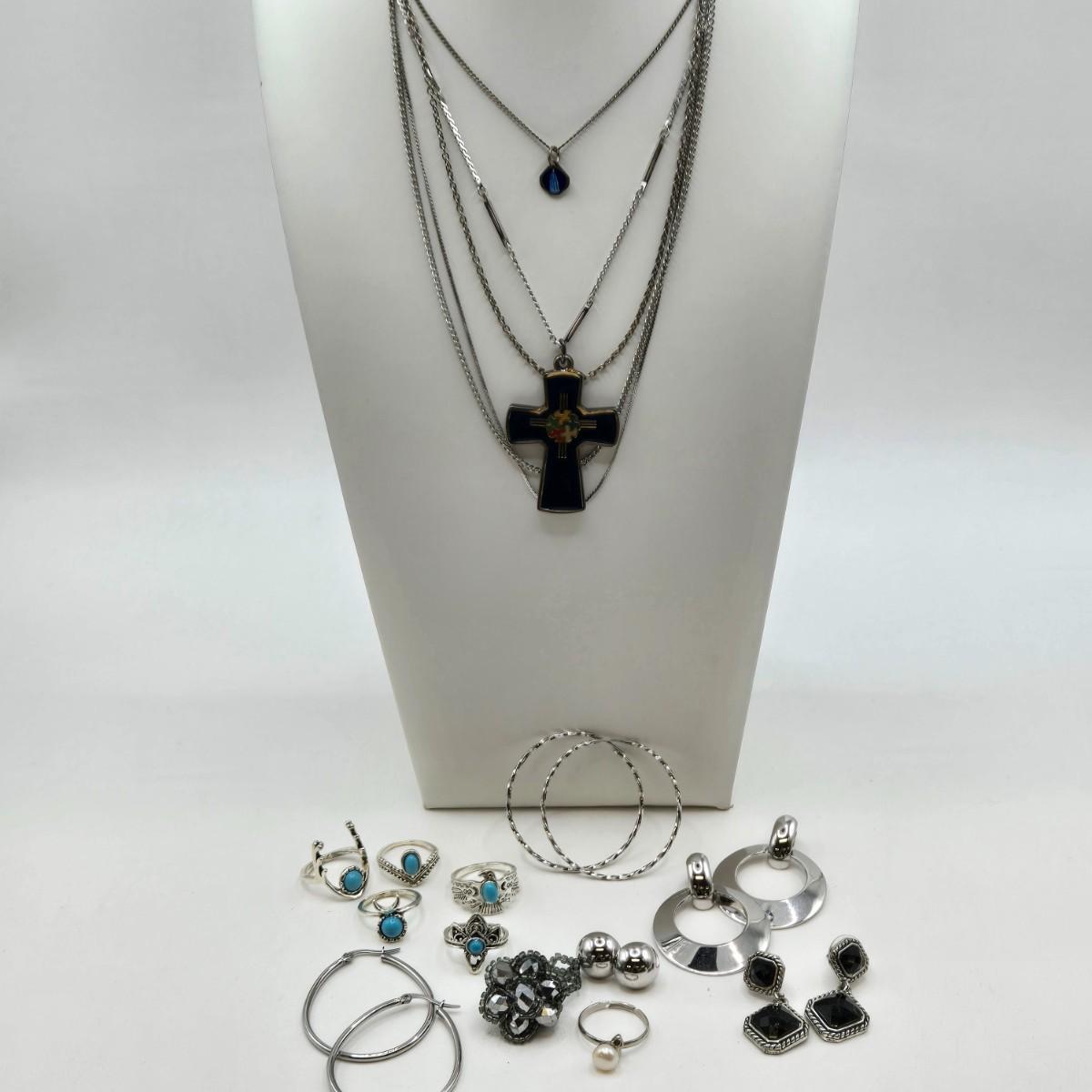 LOT 37: Jubilee Cross on 15 in. Trifari Chain, Religious Charm on 24 in. Silver Chain, Silver-tone and Turquoise Like Bead Rings, and More