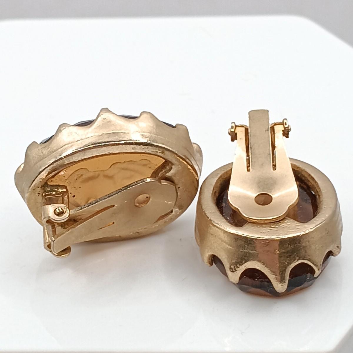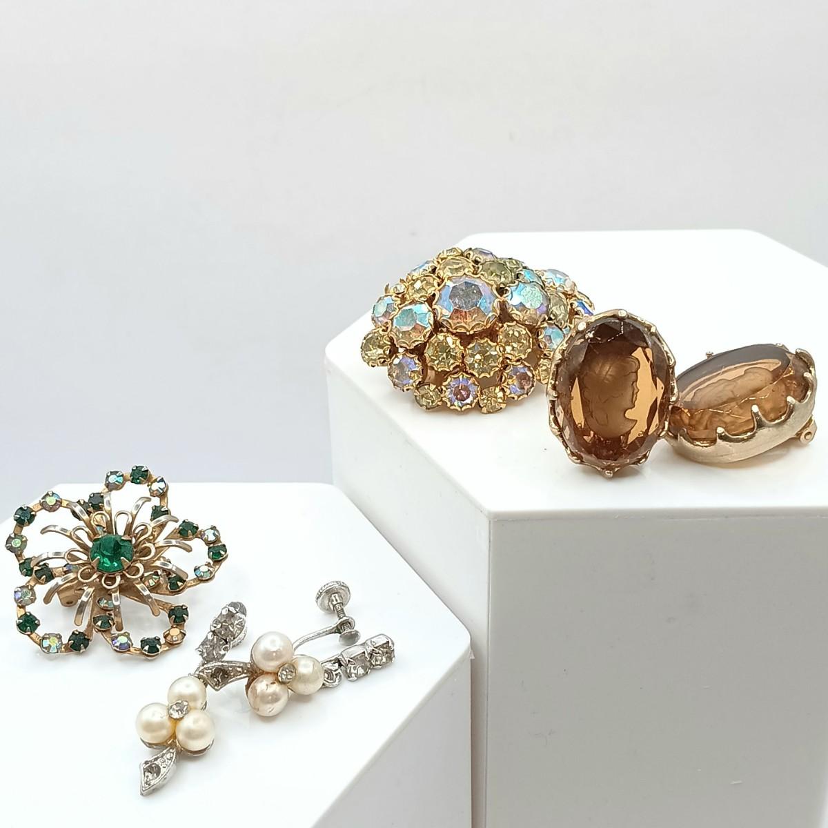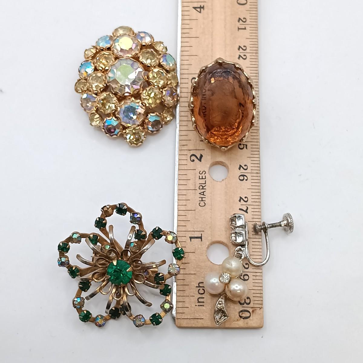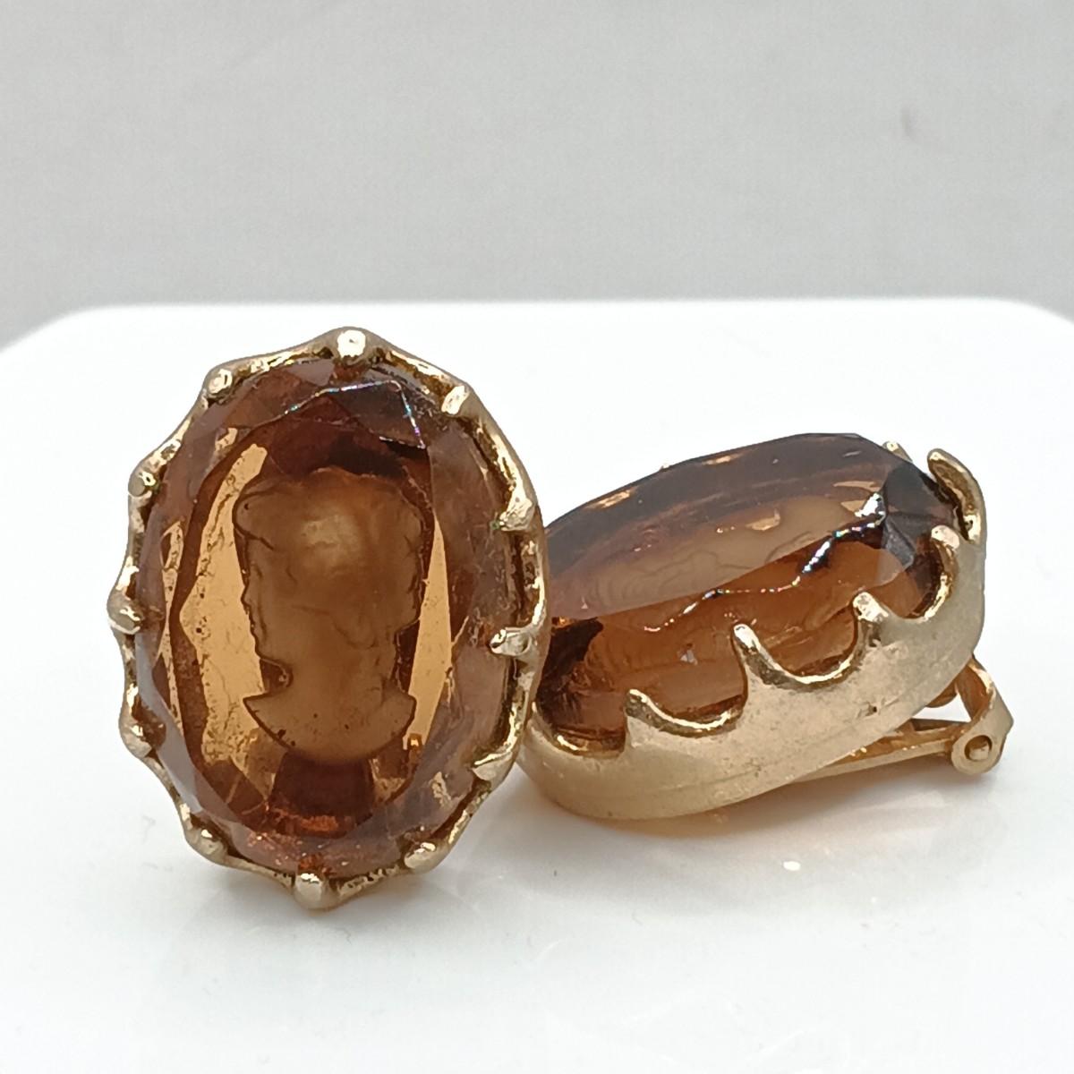 LOT 69: Vintage Smokey Topaz Cameo Glass Clip-Ons, Aurora Borealis Rhinestone Clip-Ons & More