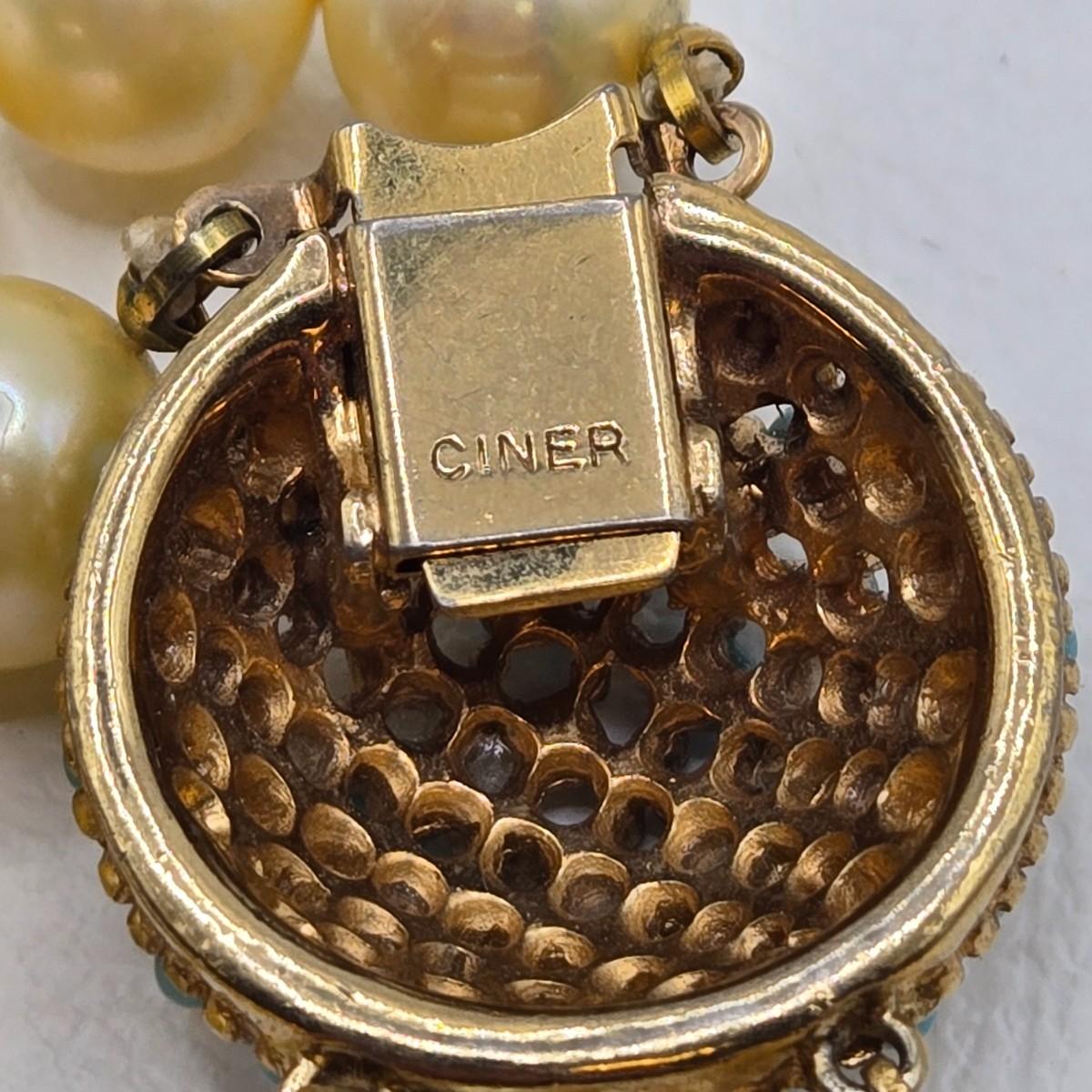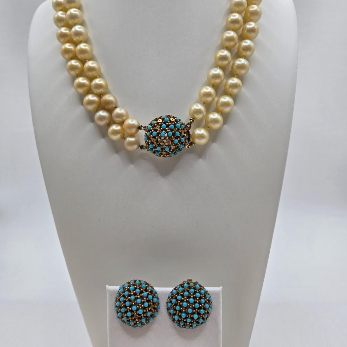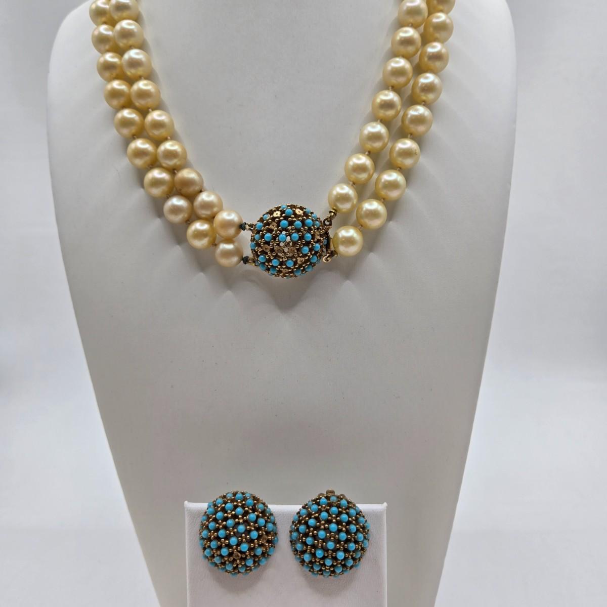 LOT 78: Ciner Glass Pearl Necklace with Faux Turquoise Clasp and Matching Clip Earrings