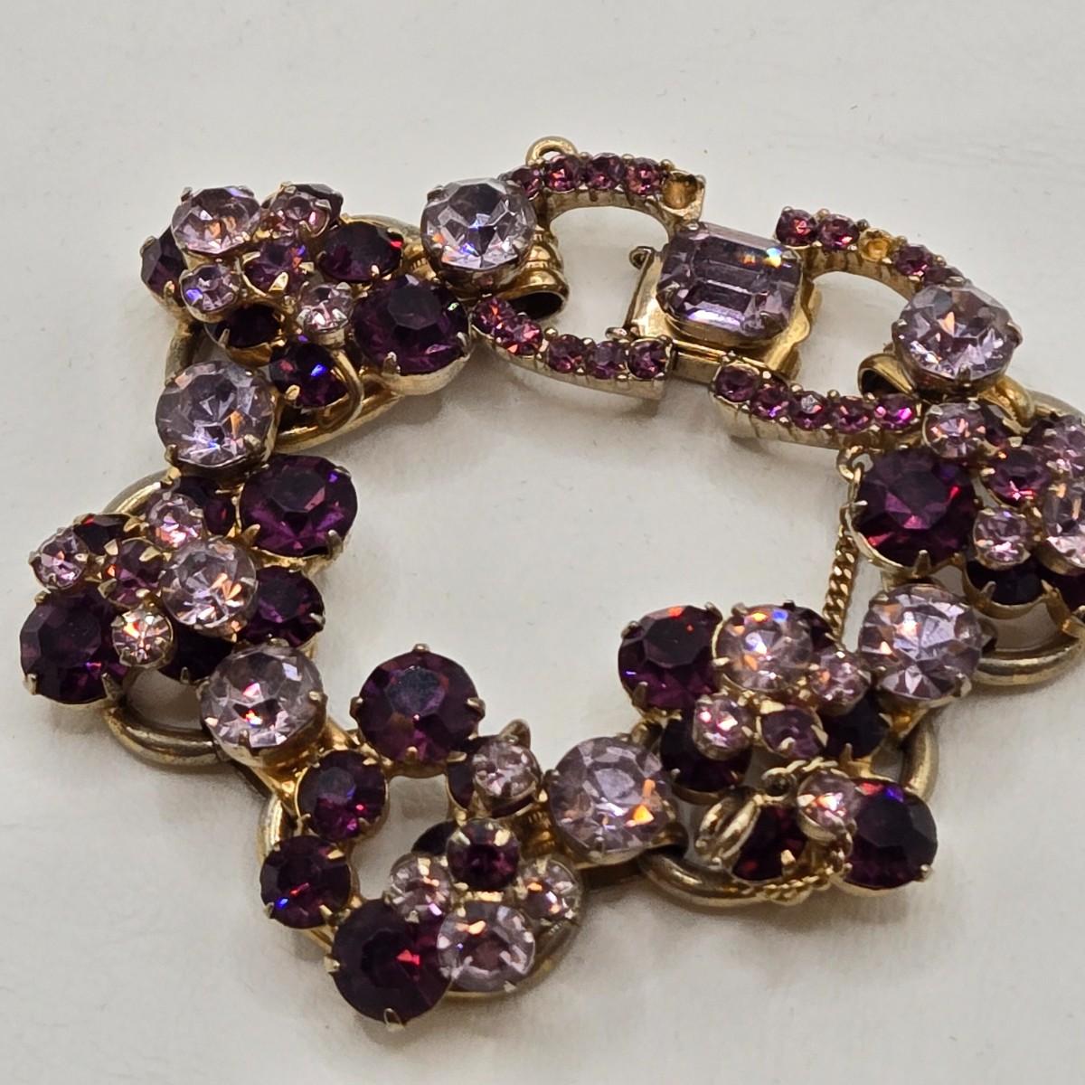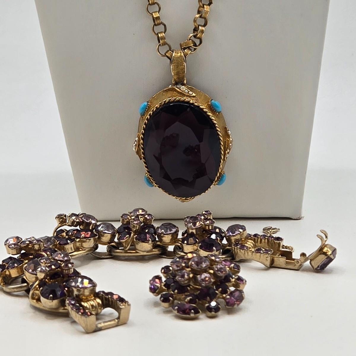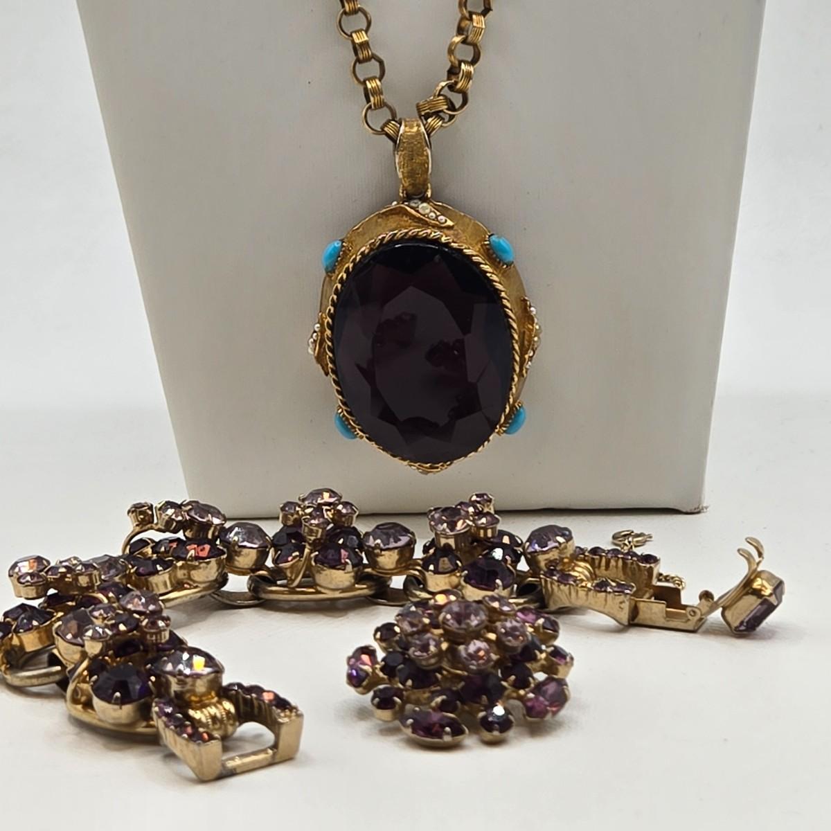 LOT 79: Capri Purple Art Glass Pendant Necklace, Two Tone Purple Rhinestone Bracelet w/ Safety Clasp, and One Matching Clip Earring
