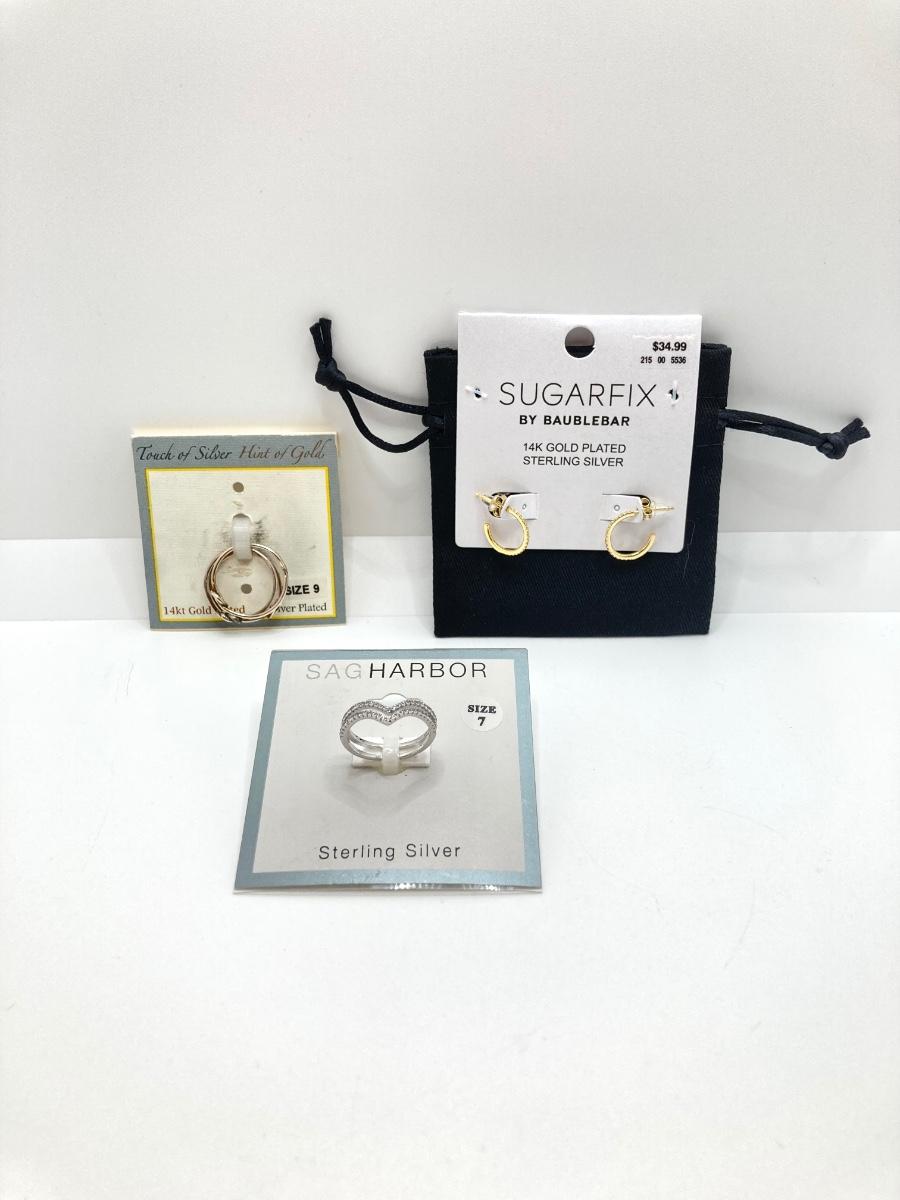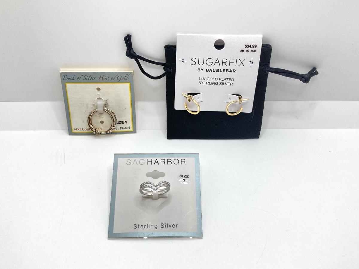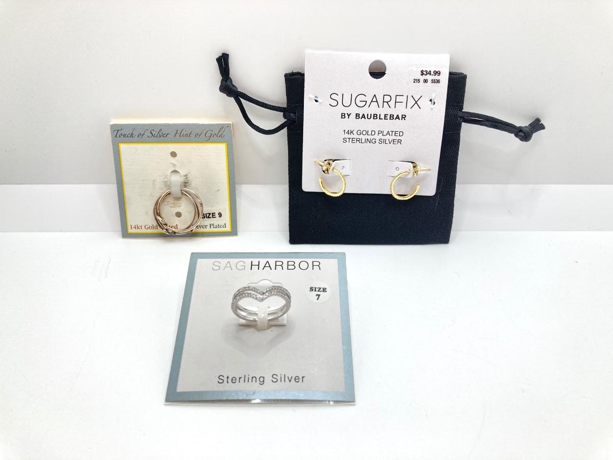 LOT 86: Sugarfix by Baublebar 14k Gold Plated / Sterling Silver Earrings, SAG Harbor Sterling Ring and Touch of Silver Hint of Gold Rings in Original Packaging