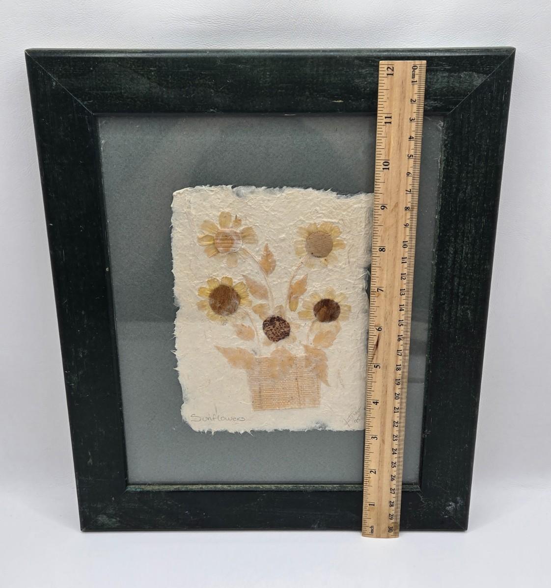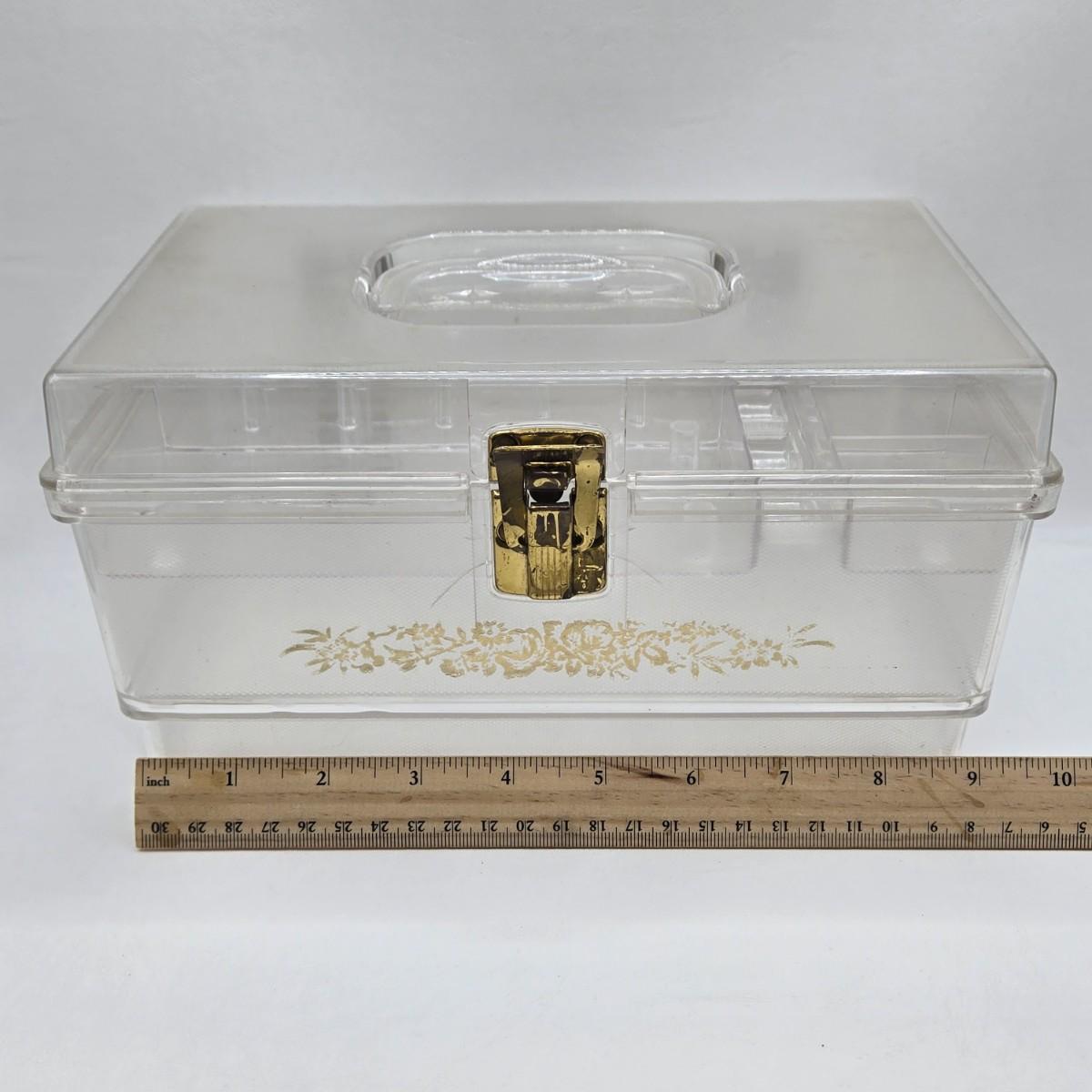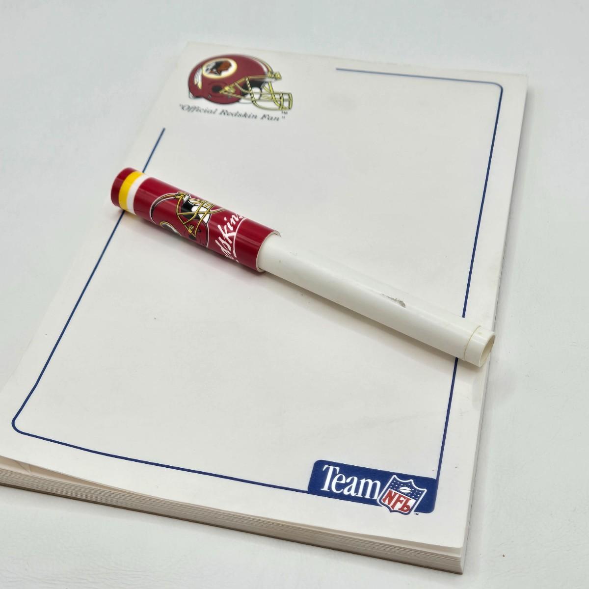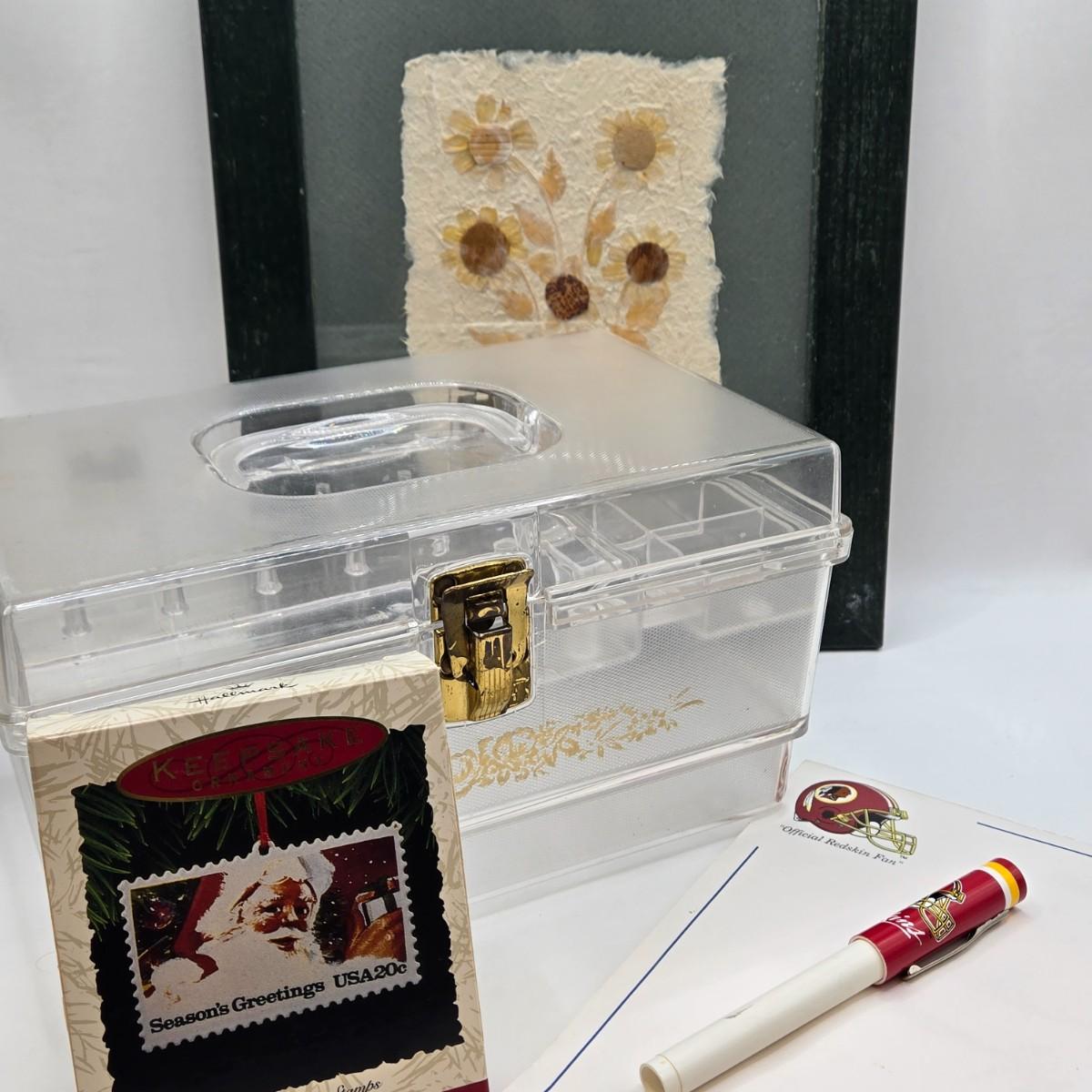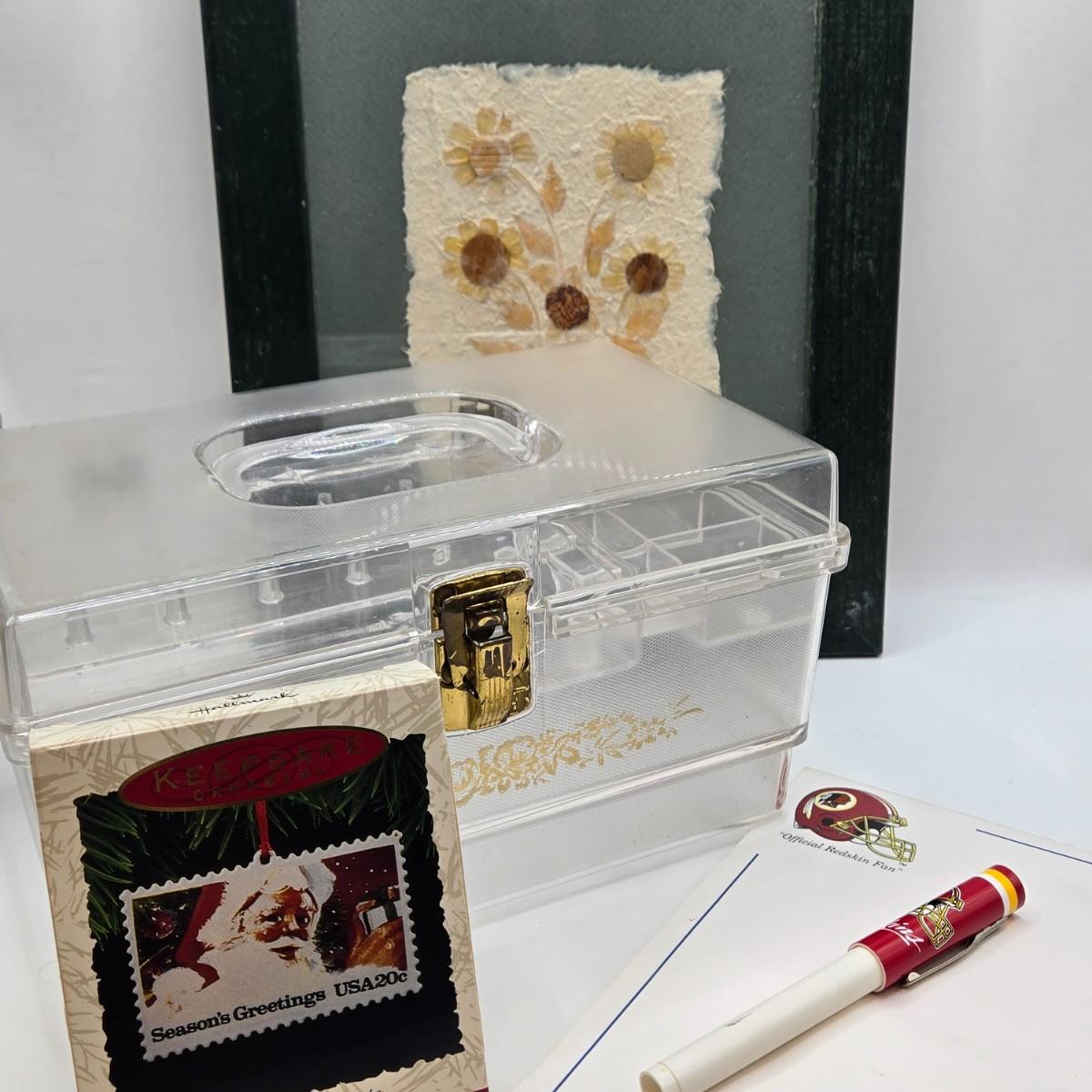 LOT 97: Vintage MCM Sewing Box w/ Removable Tray, Pressed Flower Framed Artwork, 1993 Hallmark Ornament in Original Box, NFL Redskins Pen and Note Pad