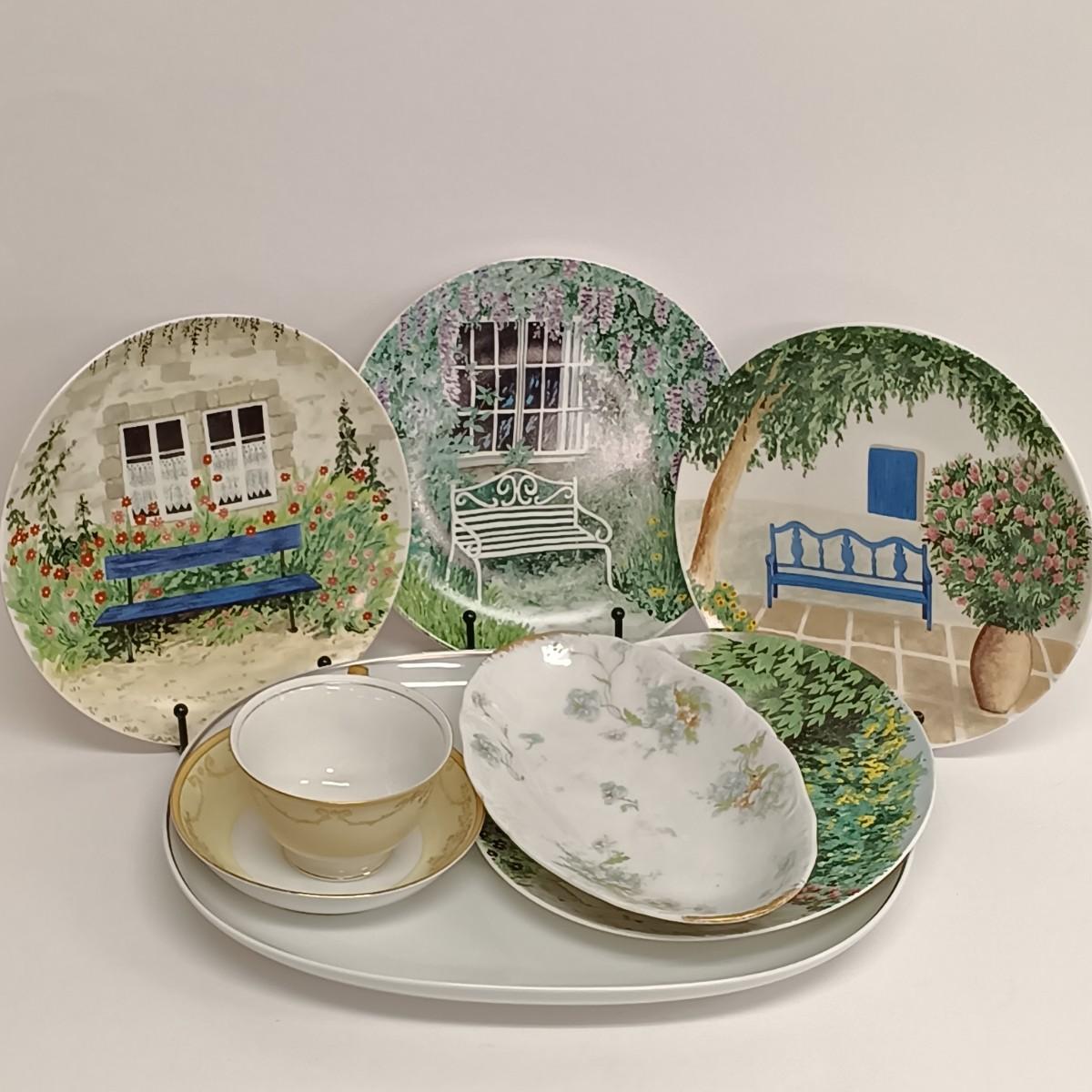 LOT 104: Limoges France Serving Platter with Formalities Garden Bench Plates, Rosenthal Platter & Japan Made Teacup and Saucer