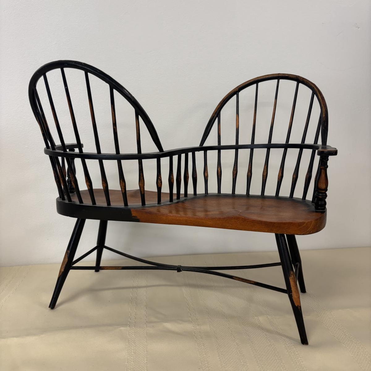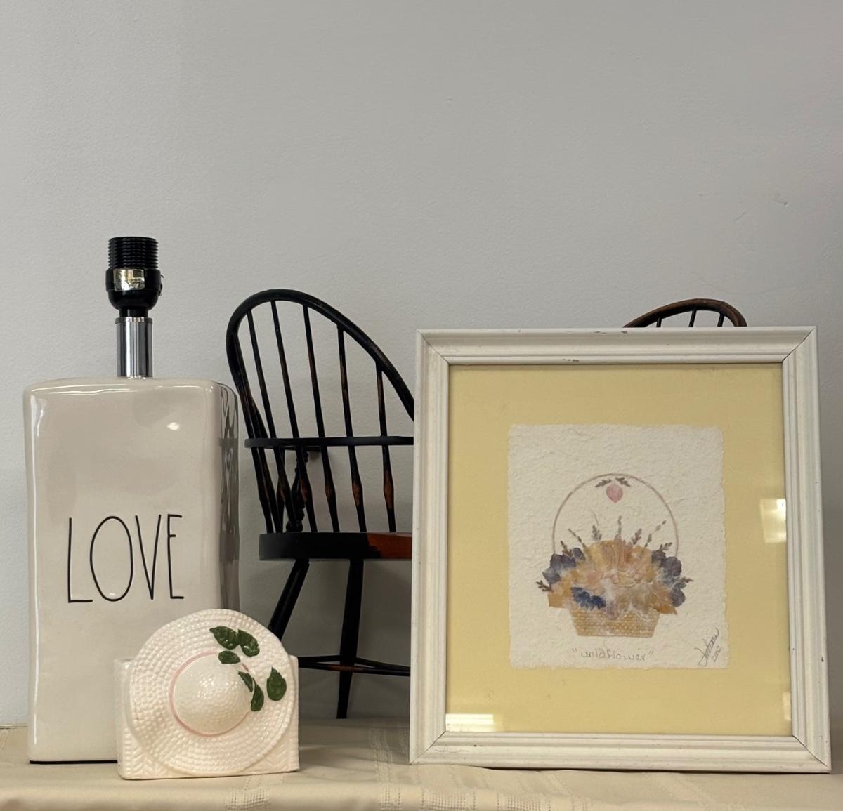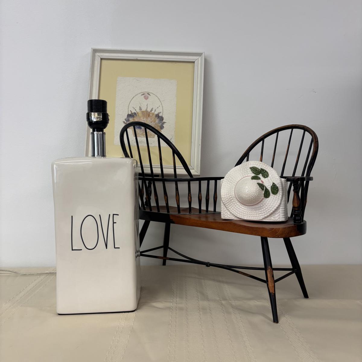 LOT 113: Rae Dunn Artisan Collection "Love" Lamp, Windsor Style Doll Gossip Bench, Signed & Dated Pressed Flower Wall Art & More