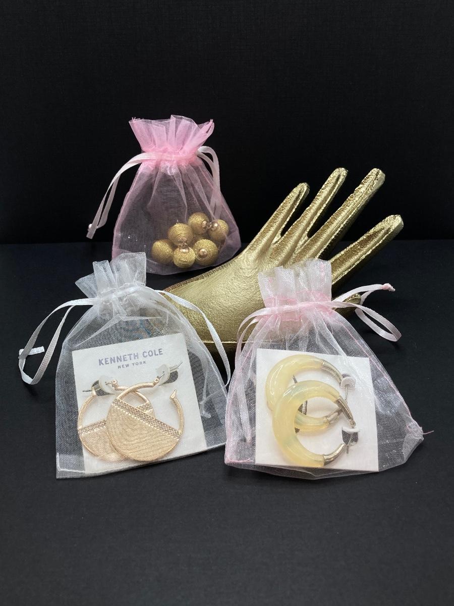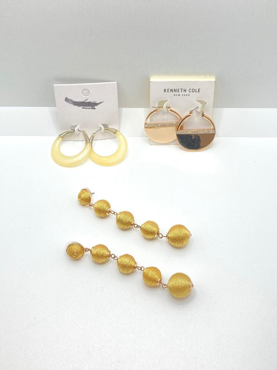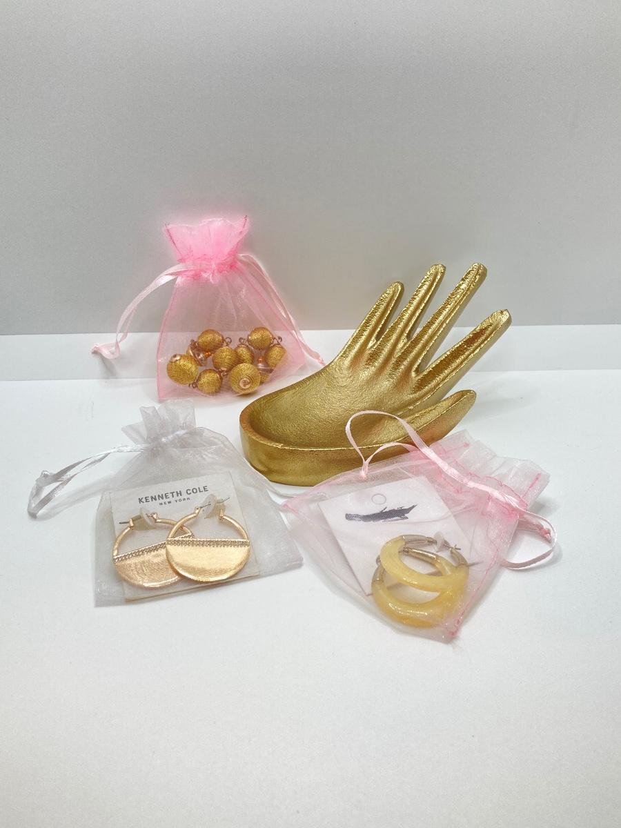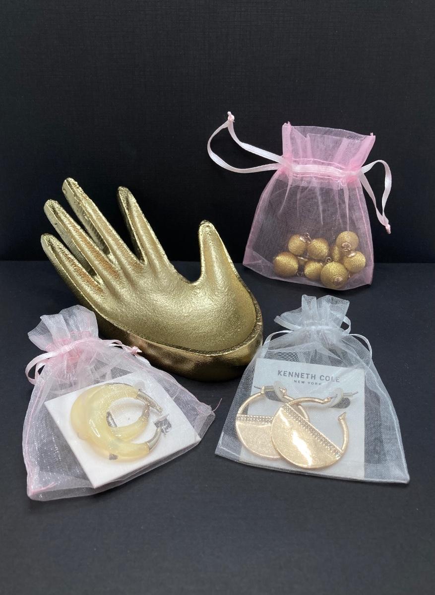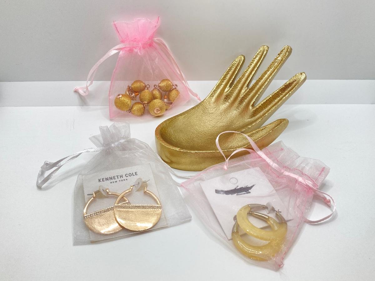 LOT 120: Gold Tone Hand Jewelry / Ring Holder with Collection of Earrings - Kenneth Cole, Baublebar and More