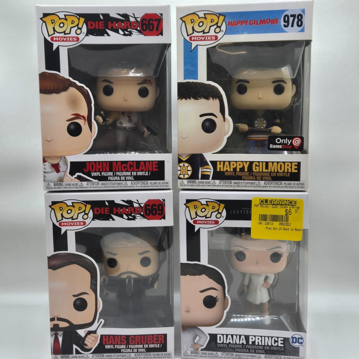 LOT 45: NIB Funko Pops Die Hard's John McClane and Hans Gruber, & Happy Gilmore, and Diana Prince