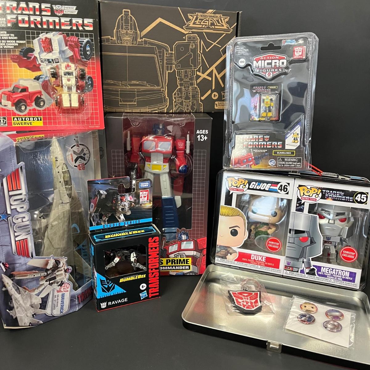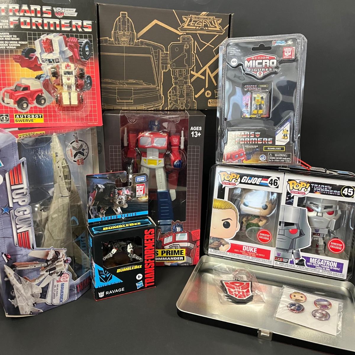 LOT 190: Big Lot of Transformers Toys and Collectibles, Top Gun Maverick, Funko GI Joe Crossover Lunchbox Set and More