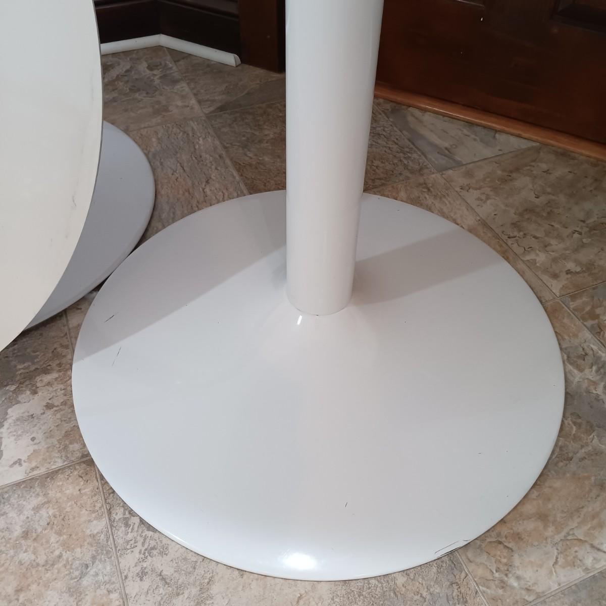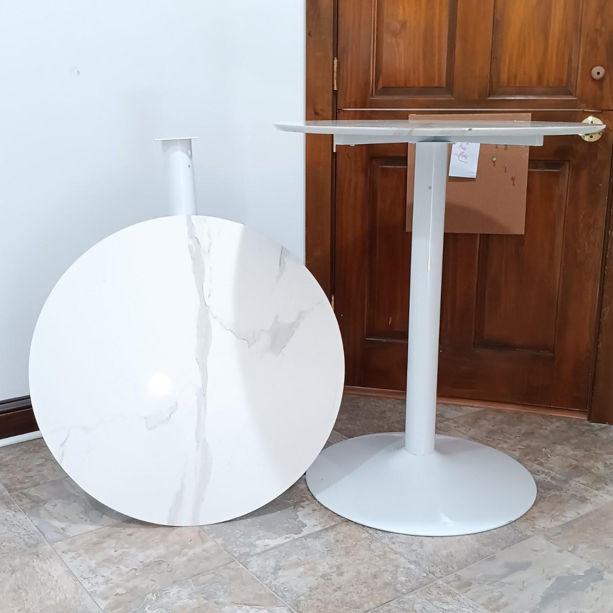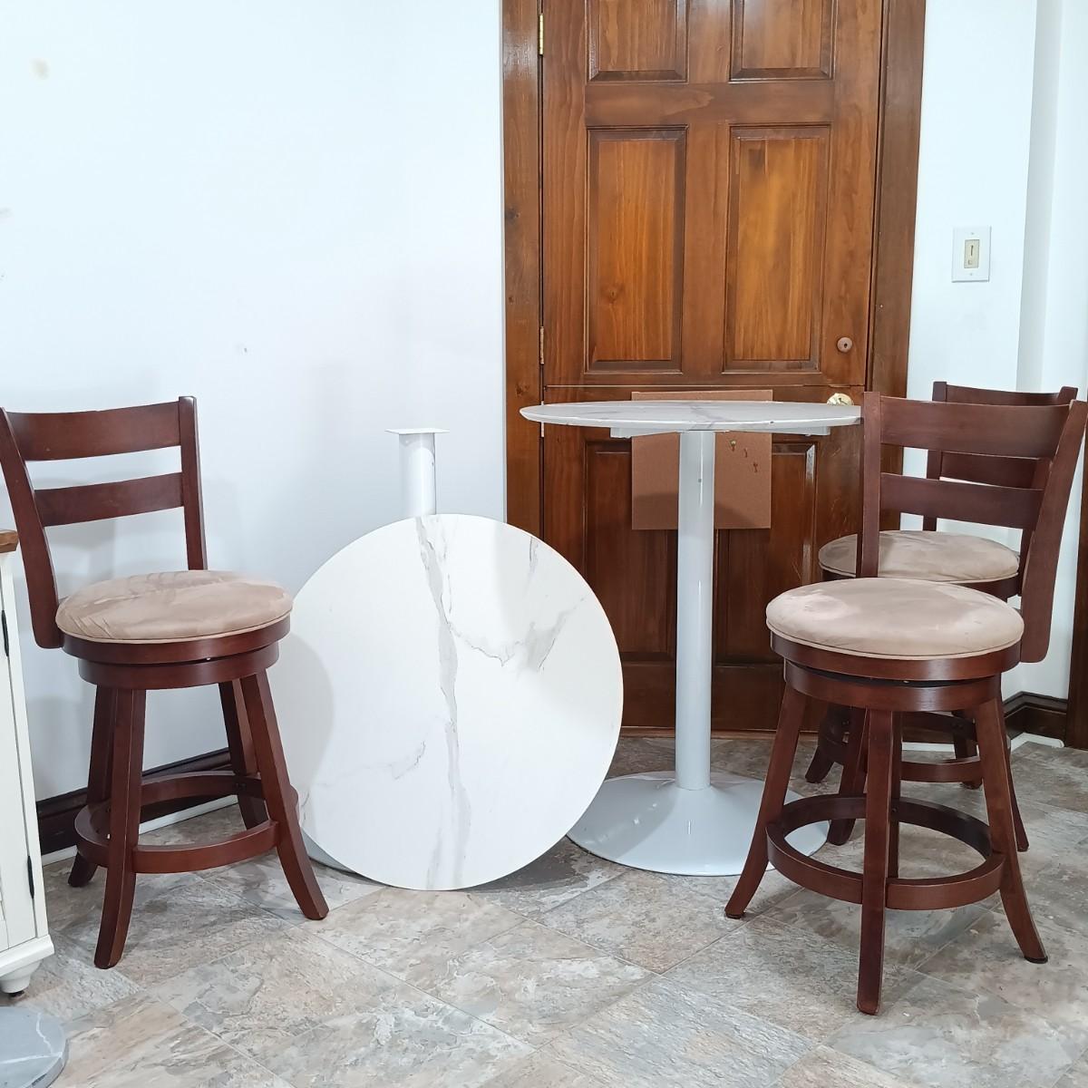 LOT 7: Bistro Set with Two (2) White Feaux Marble Topped Tables and Three Wooden Stools