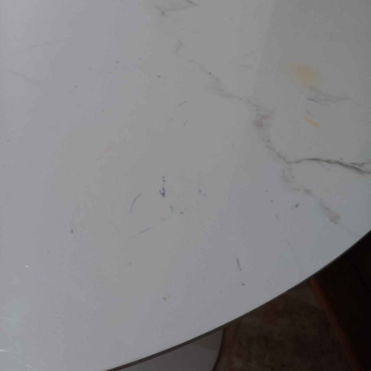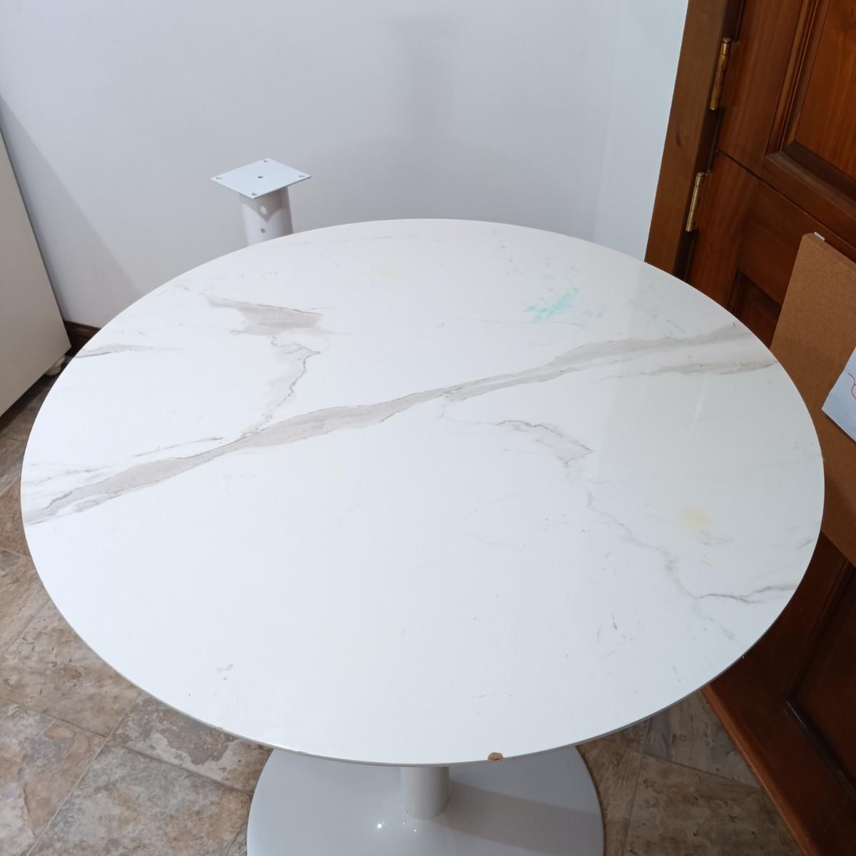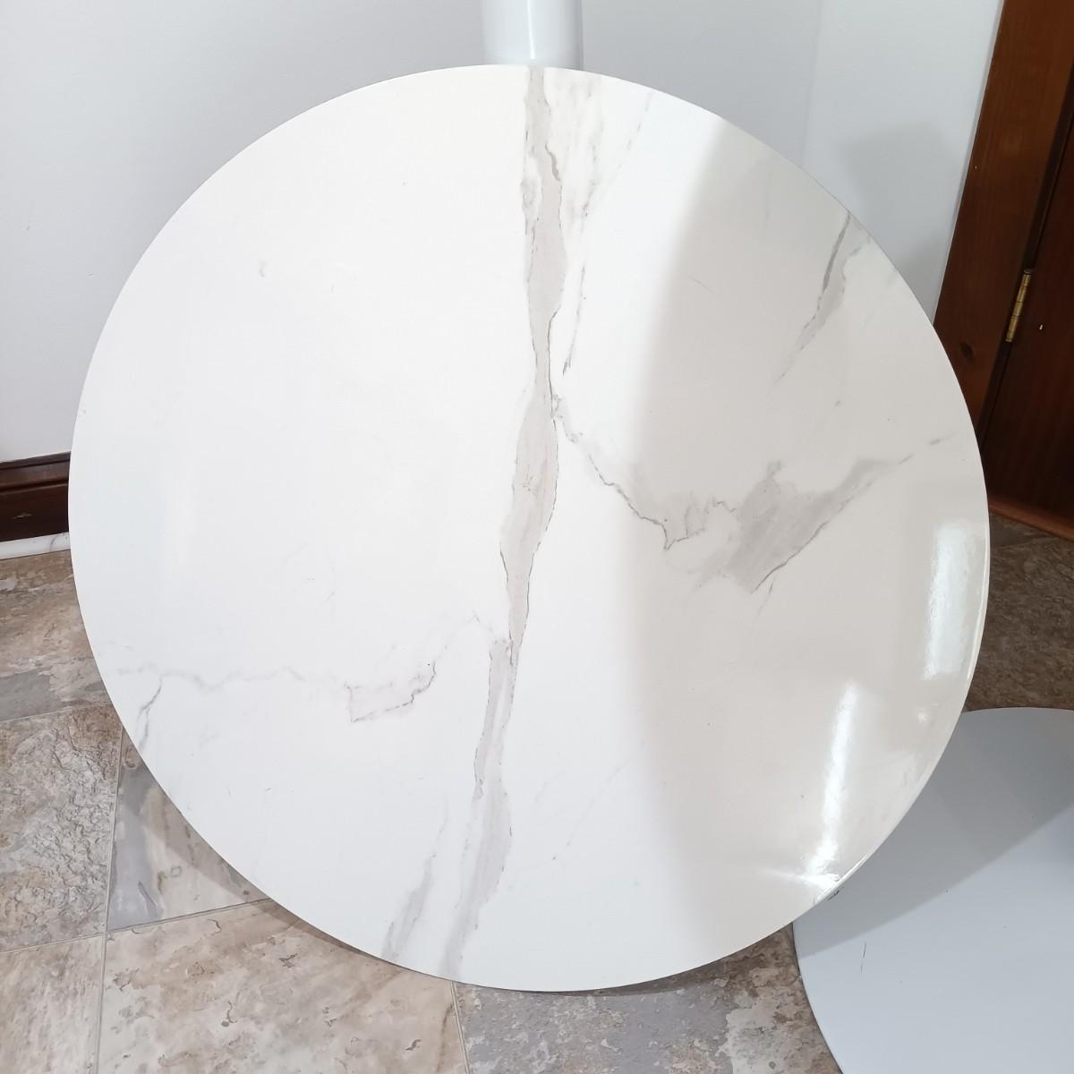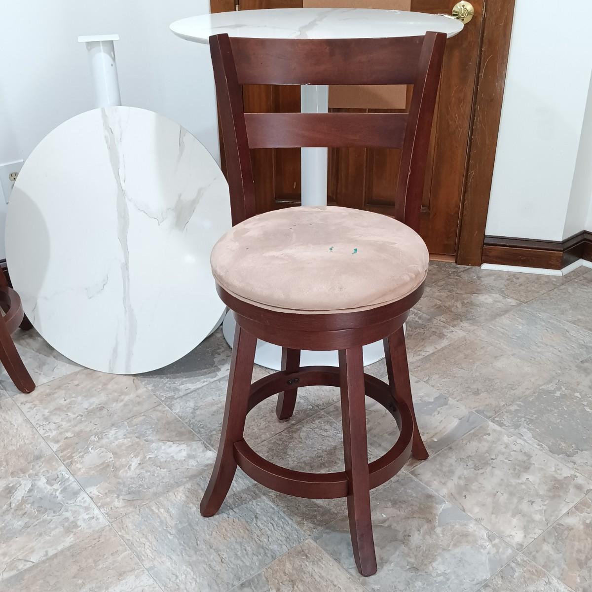 LOT 7: Bistro Set with Two (2) White Feaux Marble Topped Tables and Three Wooden Stools