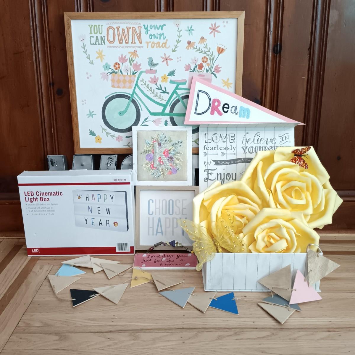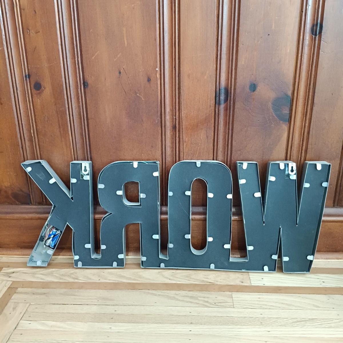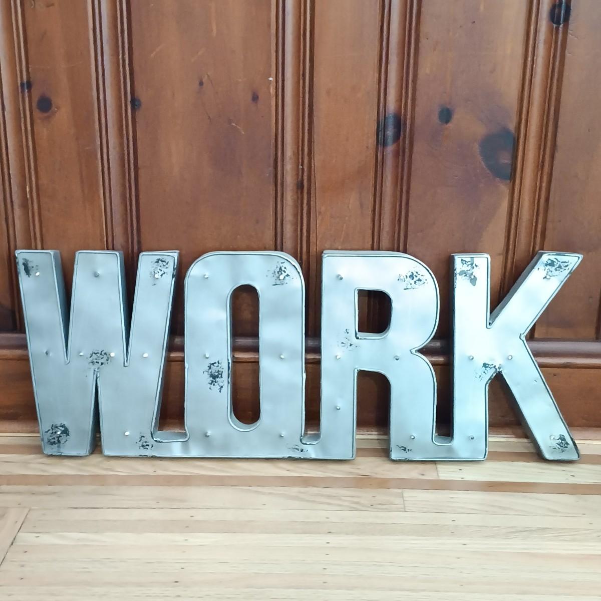 LOT 22: Inspirational Pastel Spring Decor Including LED Cinematic Light Box. Plaques, a Metal “WORK” Sign and More