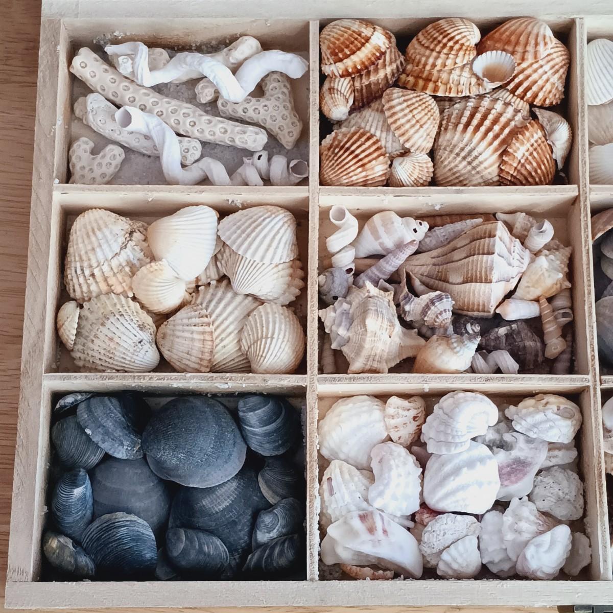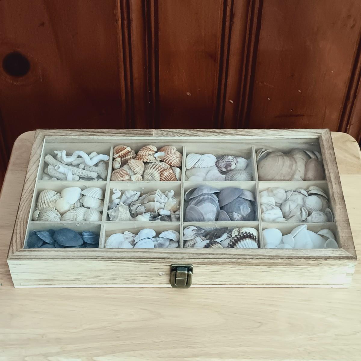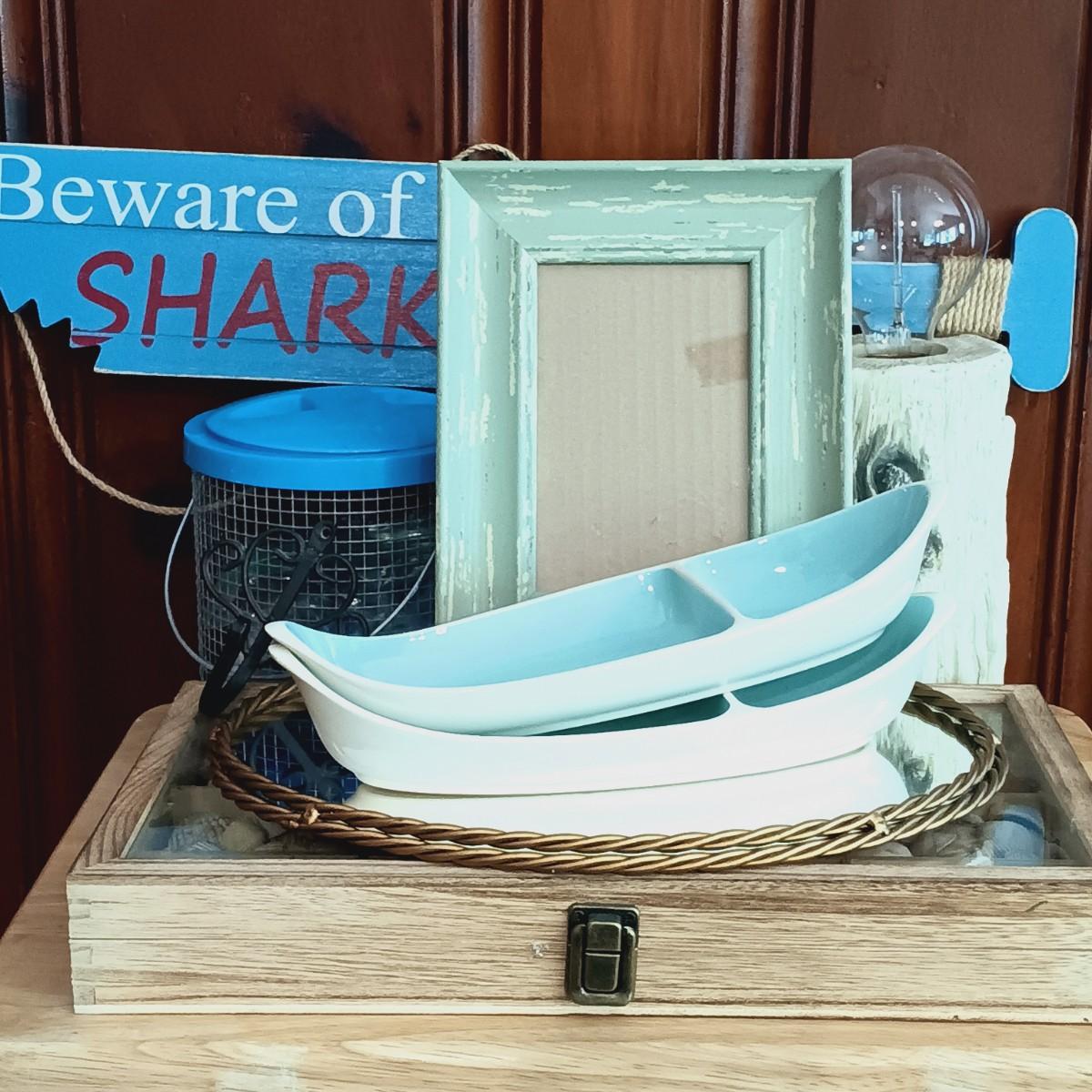 LOT 24: Nautical Collection: Framed Seashells, Boat Shaped Ceramic Dishes, Faux Log Lamp, Crab Trap and Wall Decor