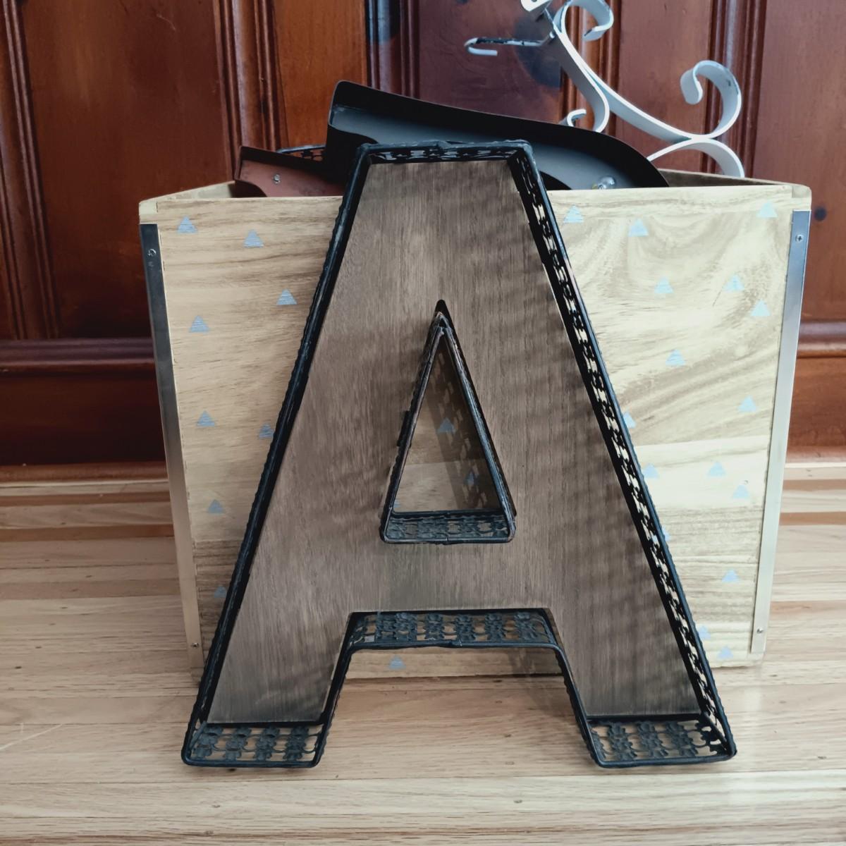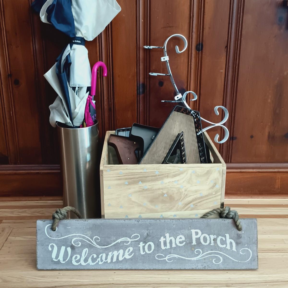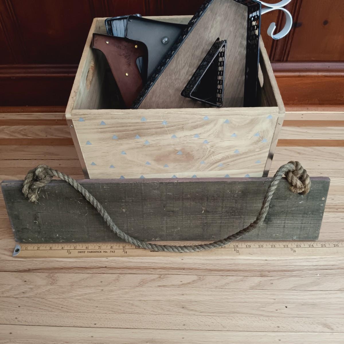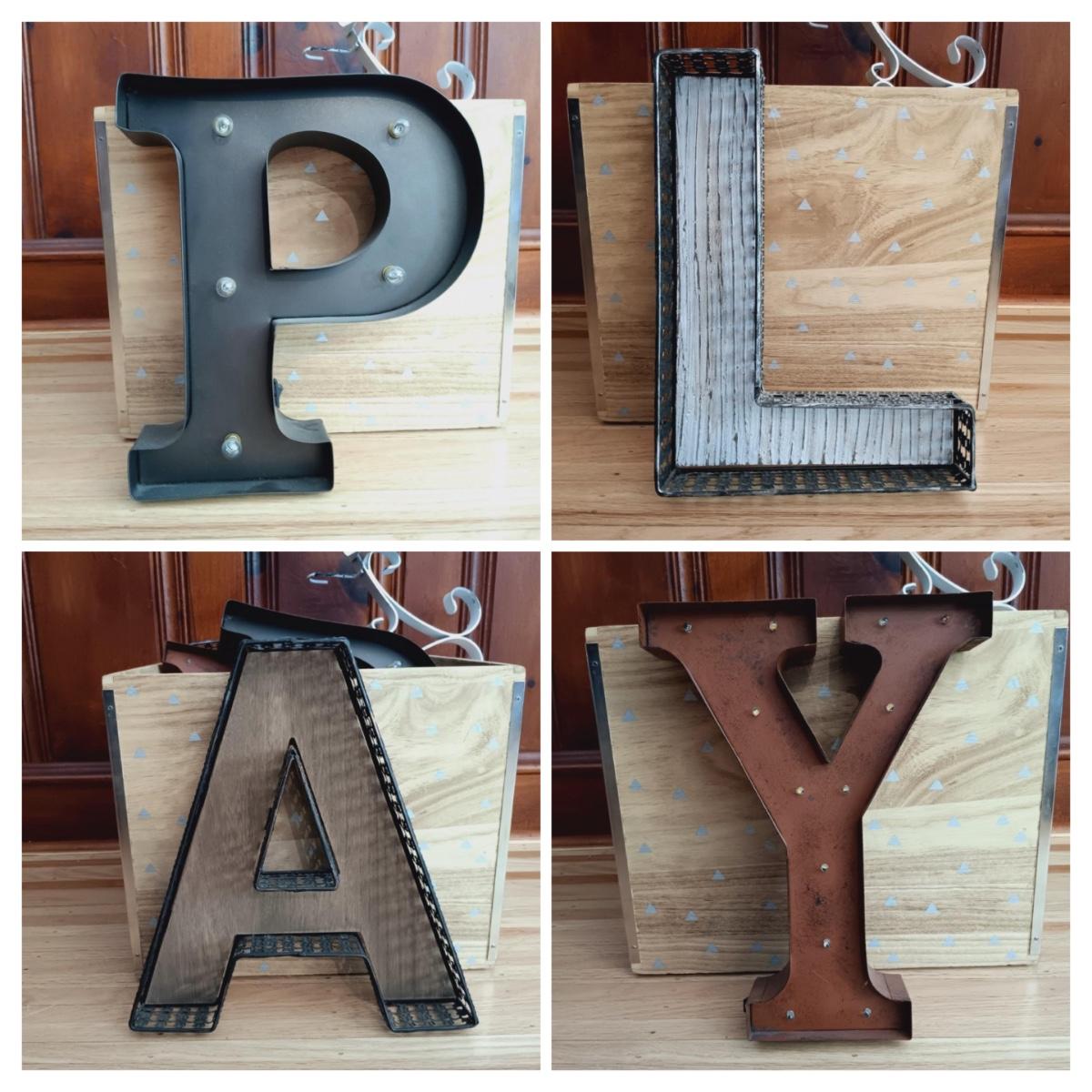 LOT 38: Bin Full of Porch Decor and More Featuring Stainless Steel Umbrella Holder and Umbrellas, Metal Letters that Spell PLAY, Wooden Bin and More