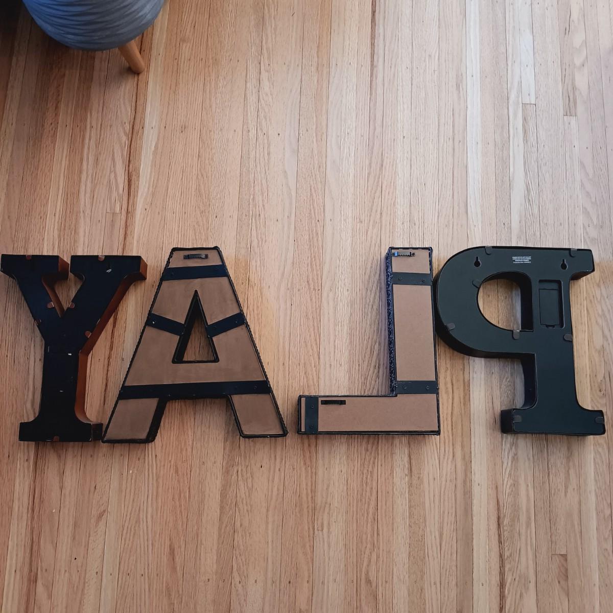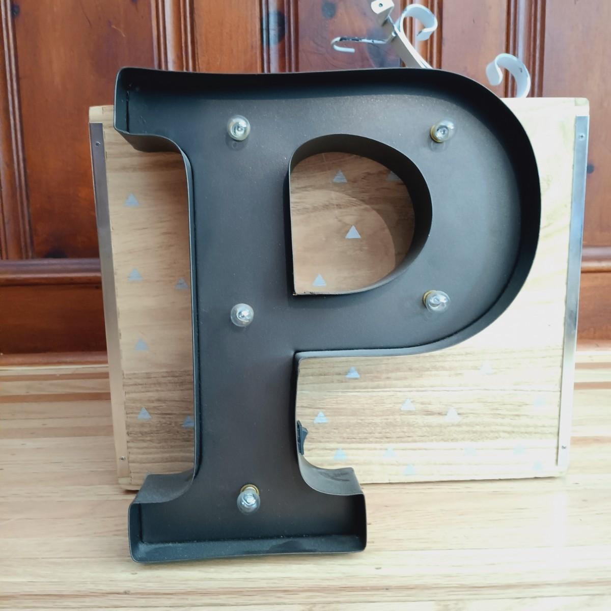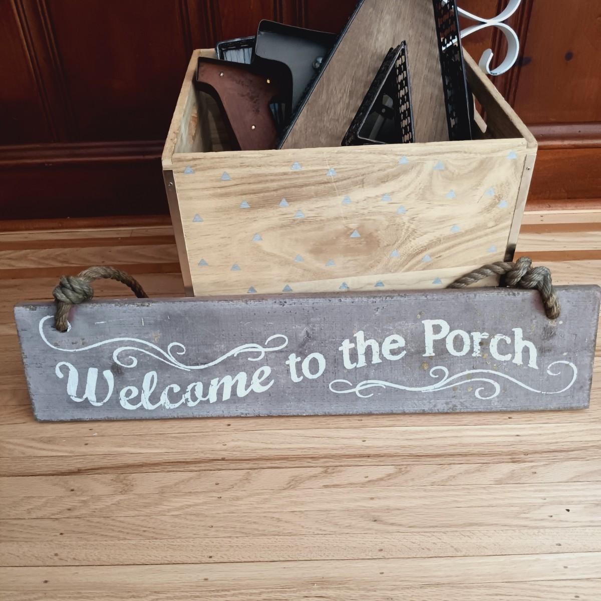 LOT 38: Bin Full of Porch Decor and More Featuring Stainless Steel Umbrella Holder and Umbrellas, Metal Letters that Spell PLAY, Wooden Bin and More