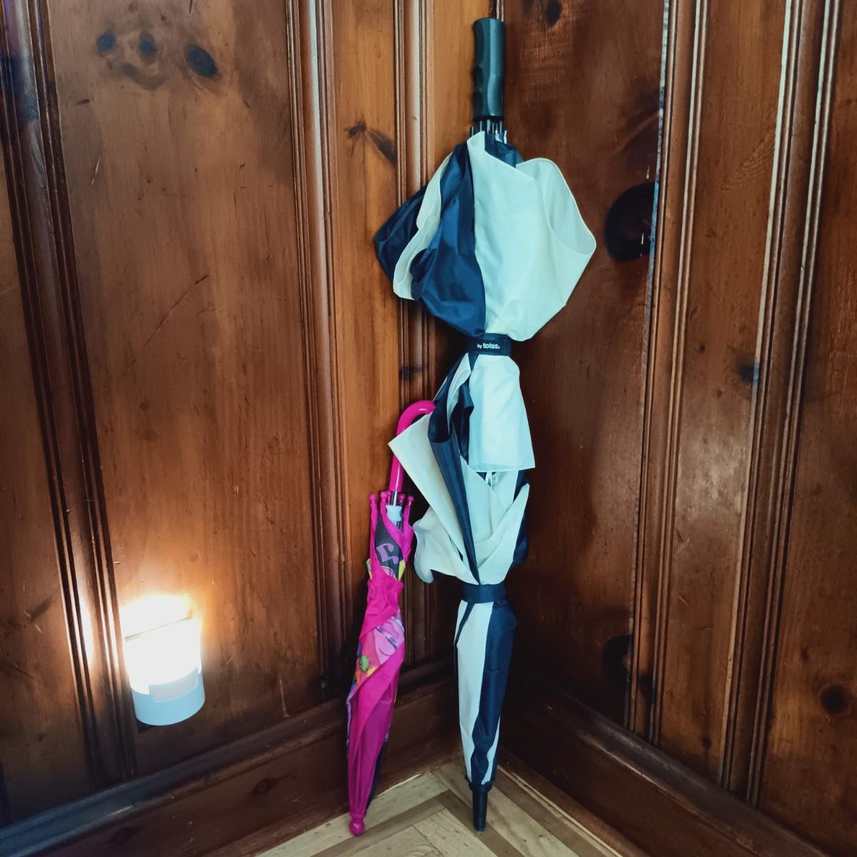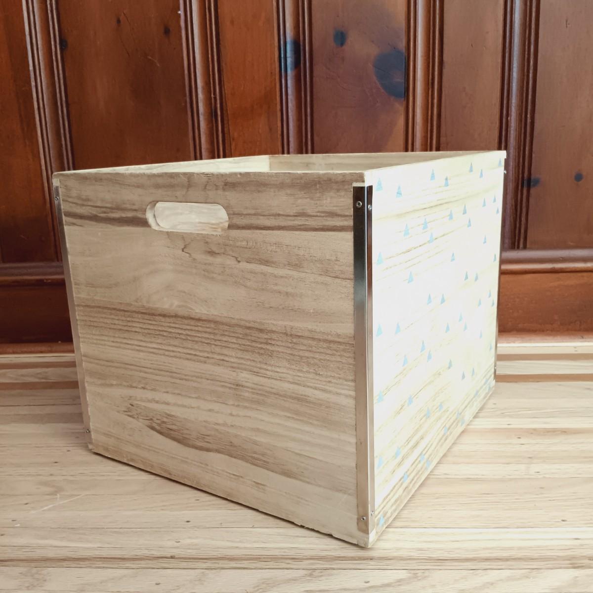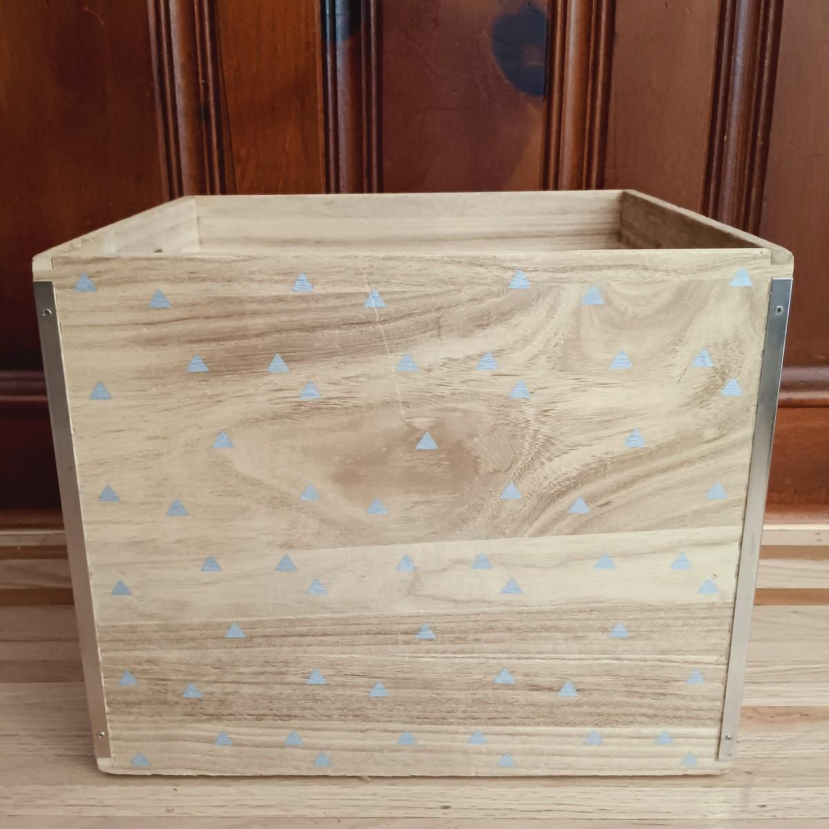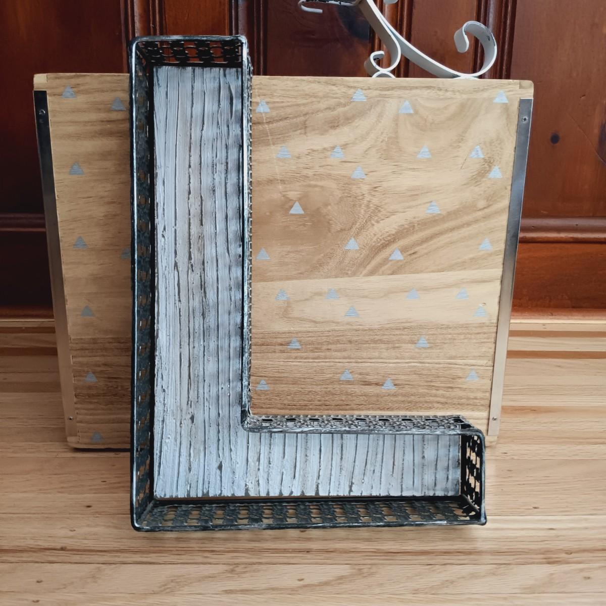 LOT 38: Bin Full of Porch Decor and More Featuring Stainless Steel Umbrella Holder and Umbrellas, Metal Letters that Spell PLAY, Wooden Bin and More