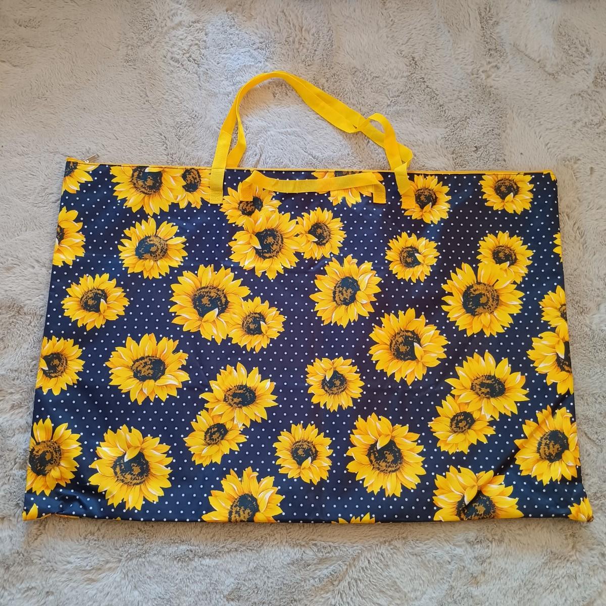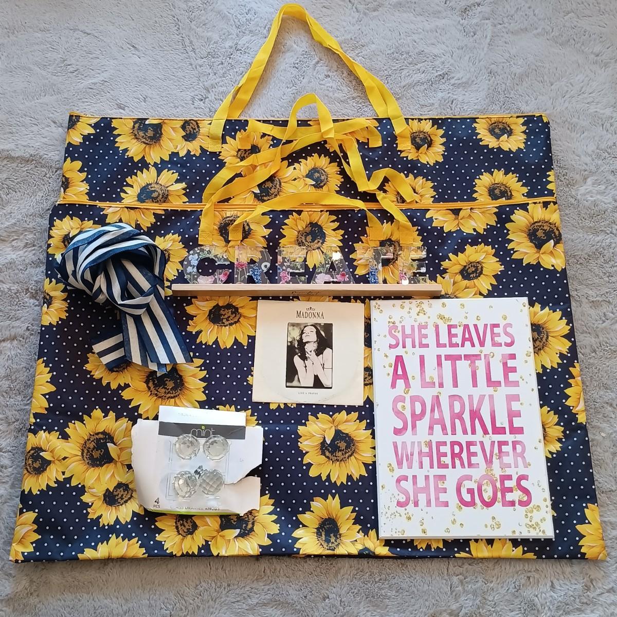 LOT 46: For the Girls - Sunflower Art Portfolio Bags/Cases, Penmore Brooke Acrylic “GREAT” Sign, Madonna Vinyl 45 , Inspirational Plaque and More