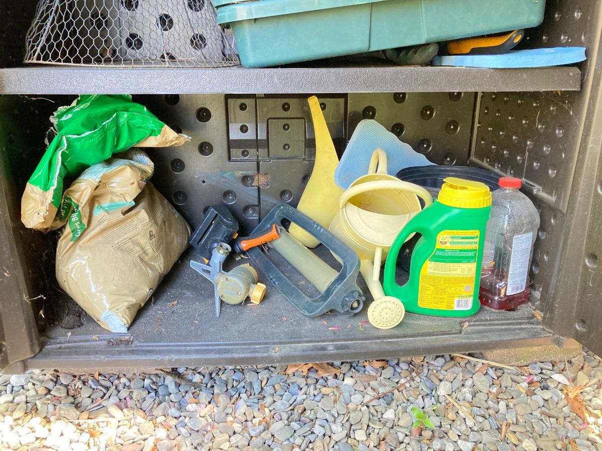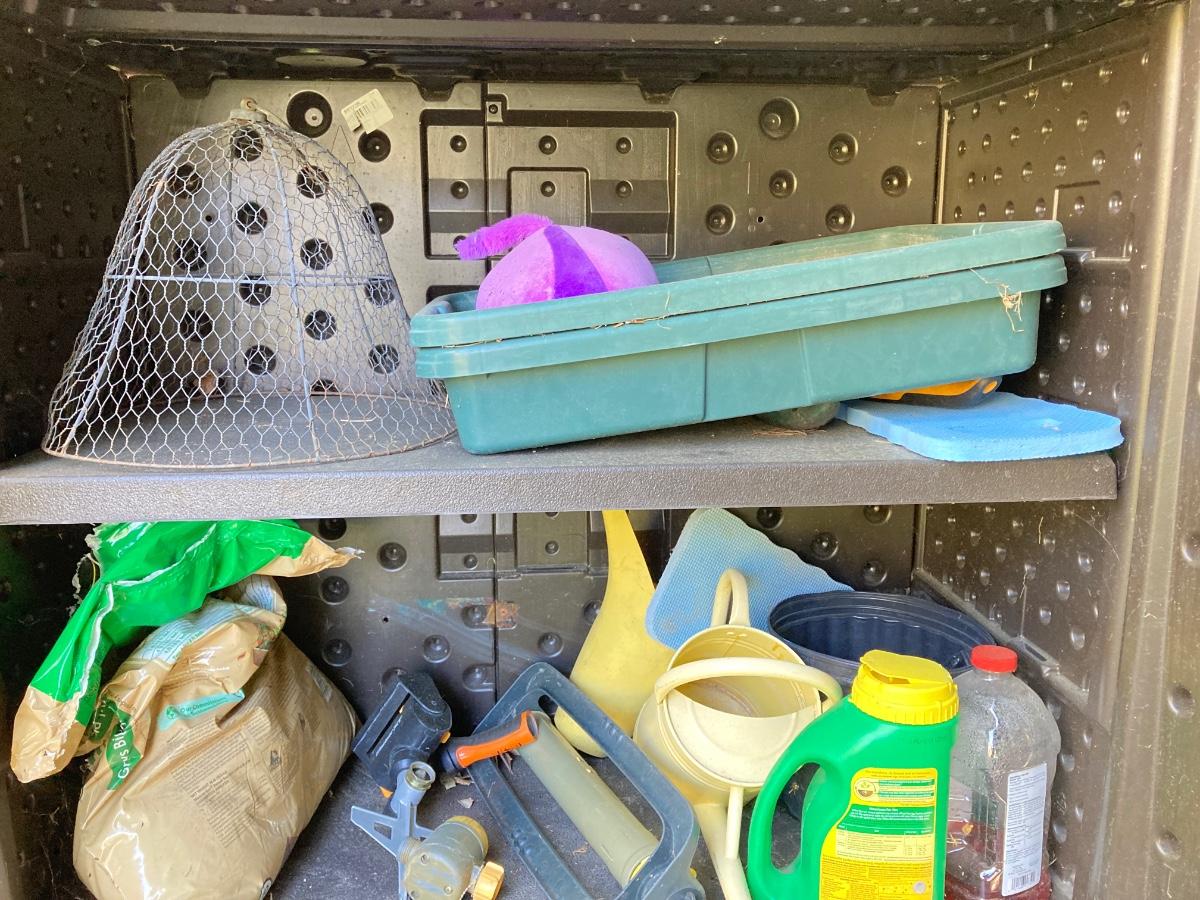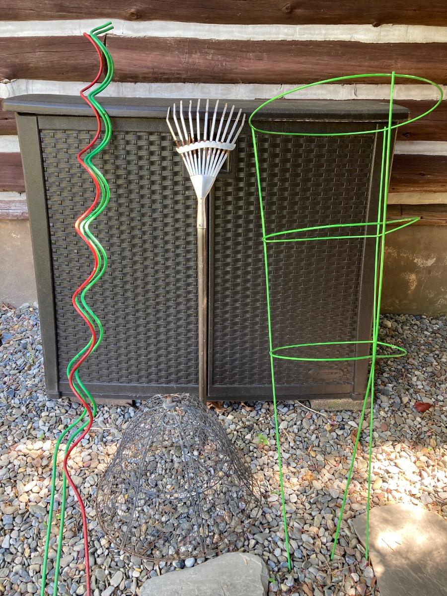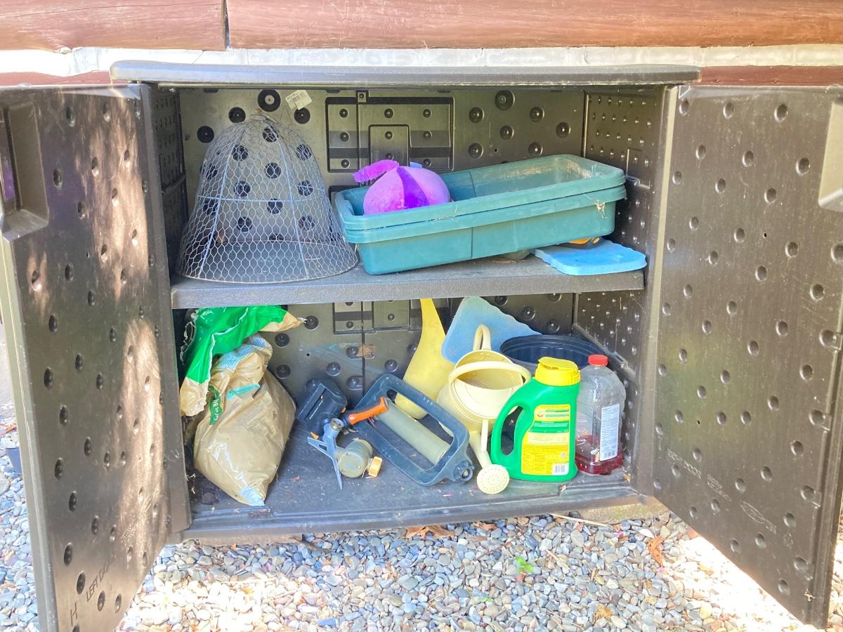 LOT 58: Outdoor Garden Storage Cabinet and Gardening Tool Supplies and Tomato Cages