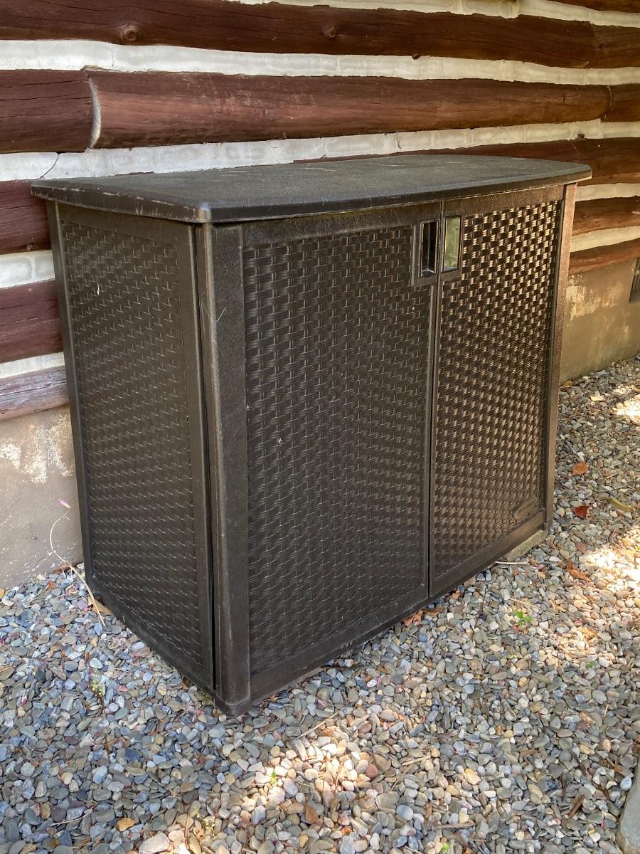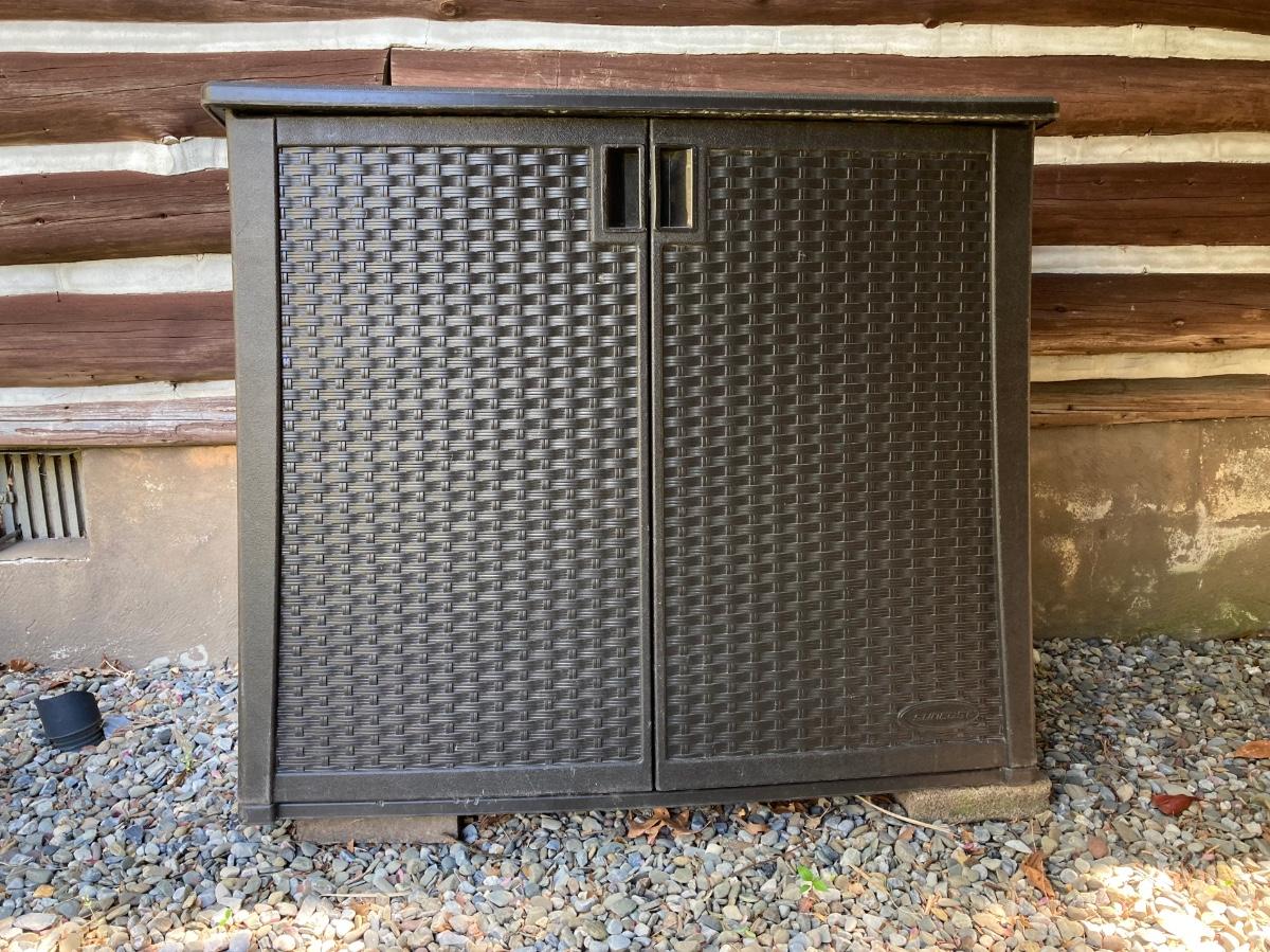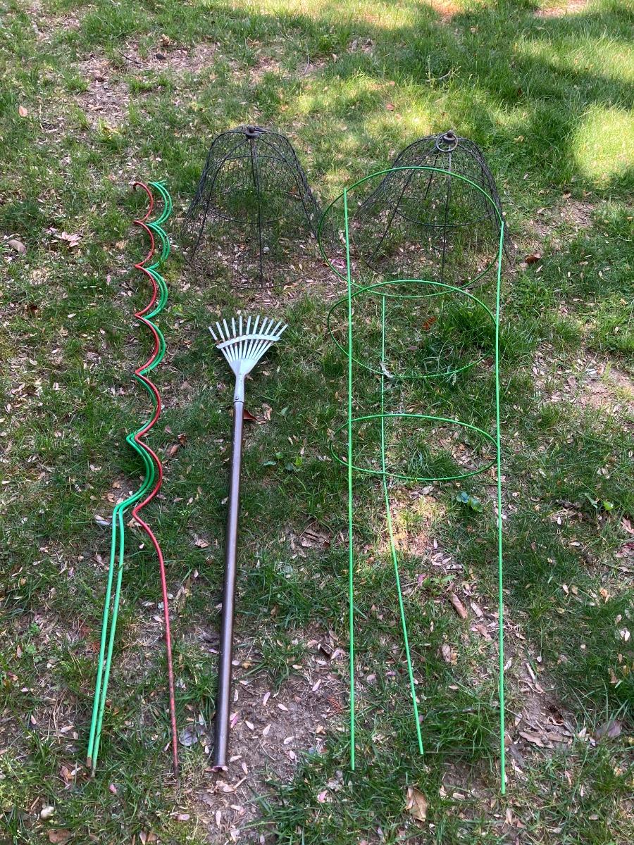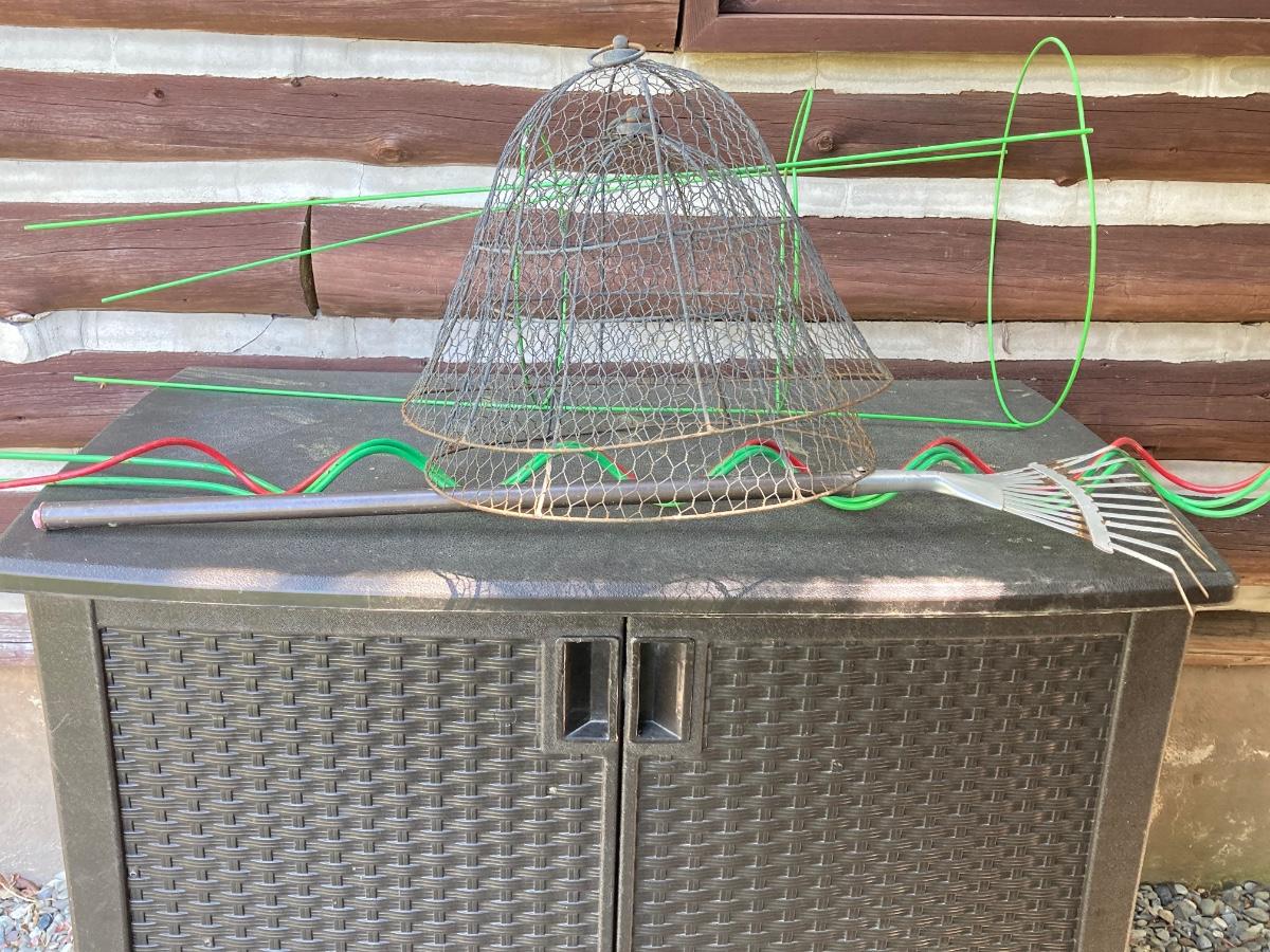 LOT 58: Outdoor Garden Storage Cabinet and Gardening Tool Supplies and Tomato Cages