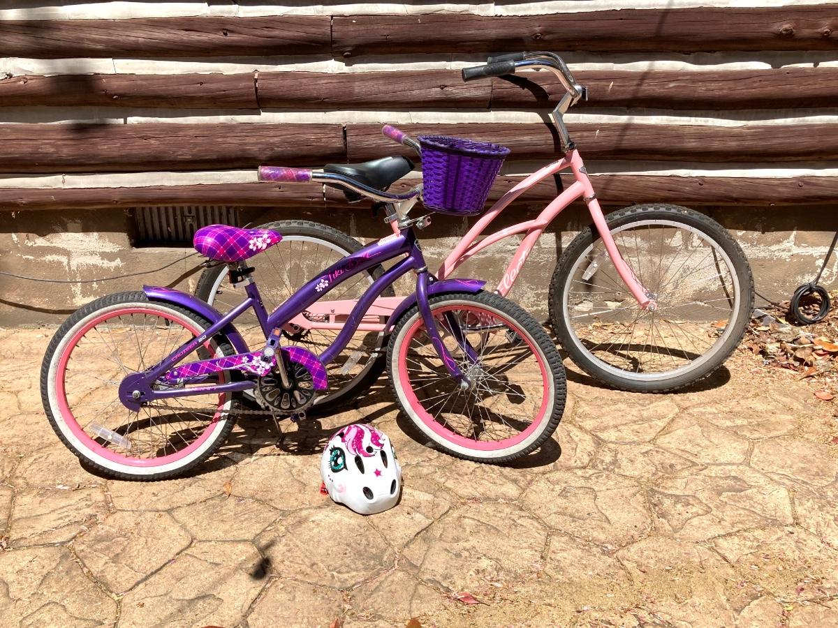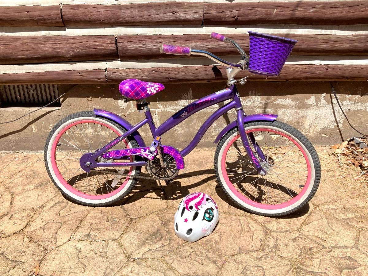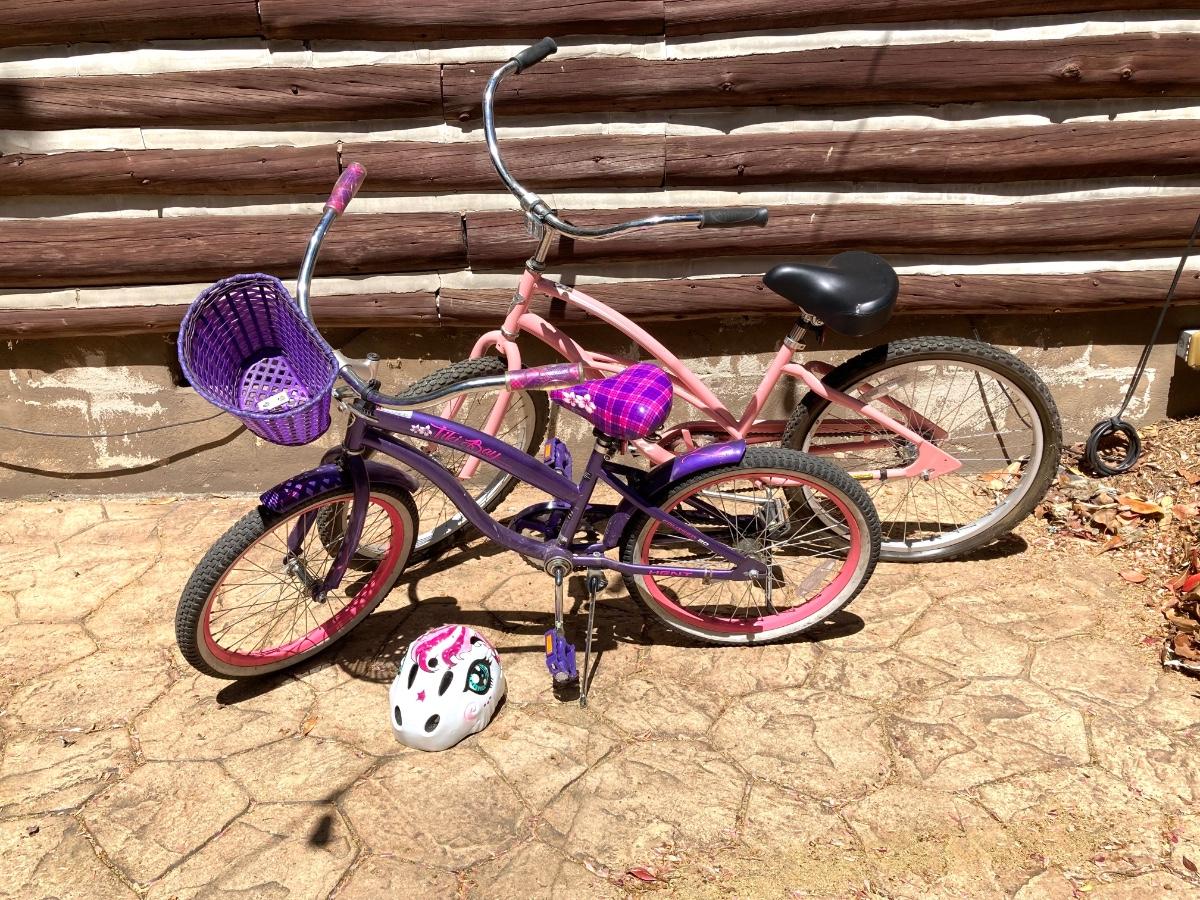 LOT 61: Women’s Pink Electra Bicycle, Girls Purple Kent Tiki Bay Bicycles and Child’s Helmet