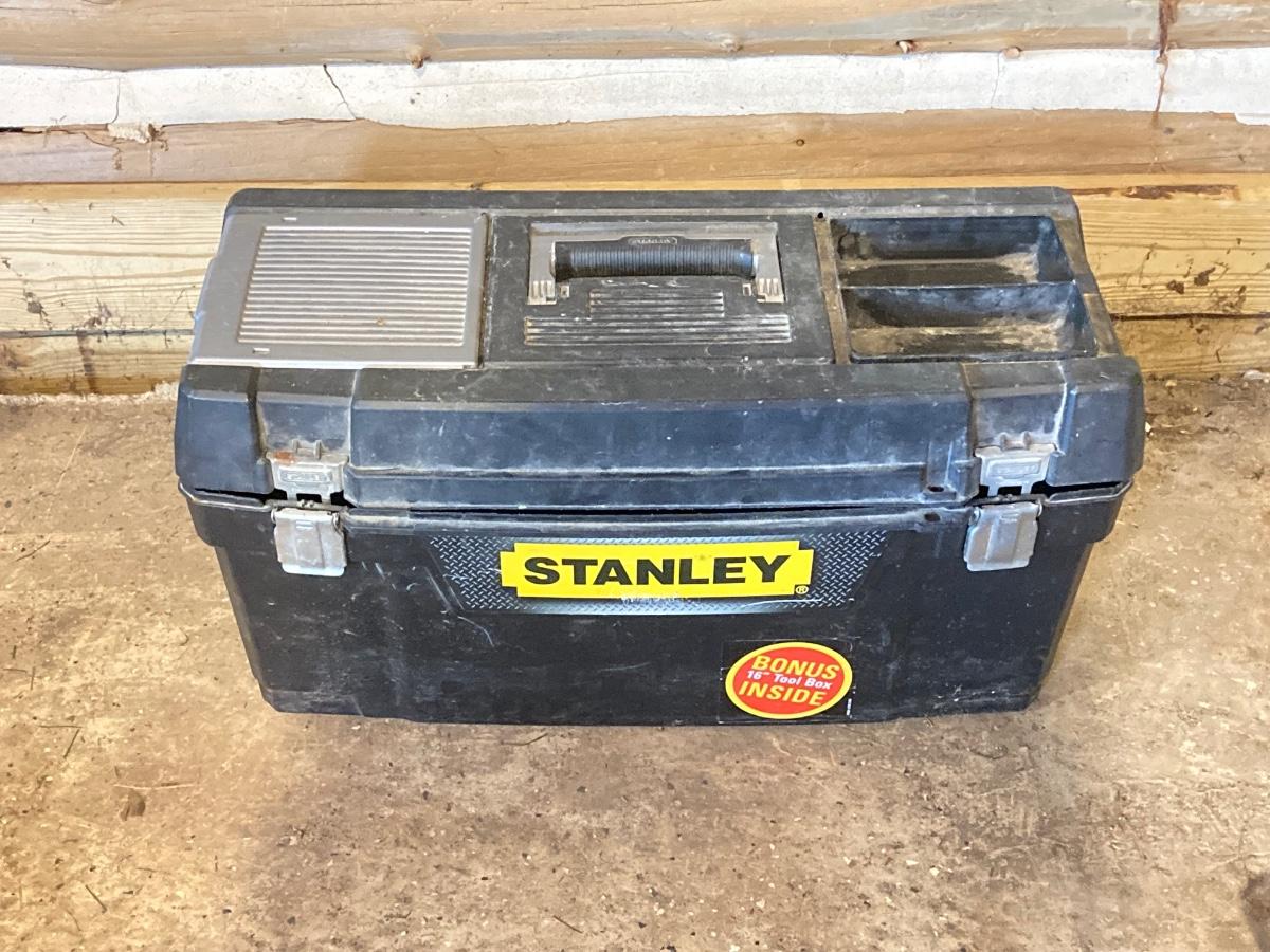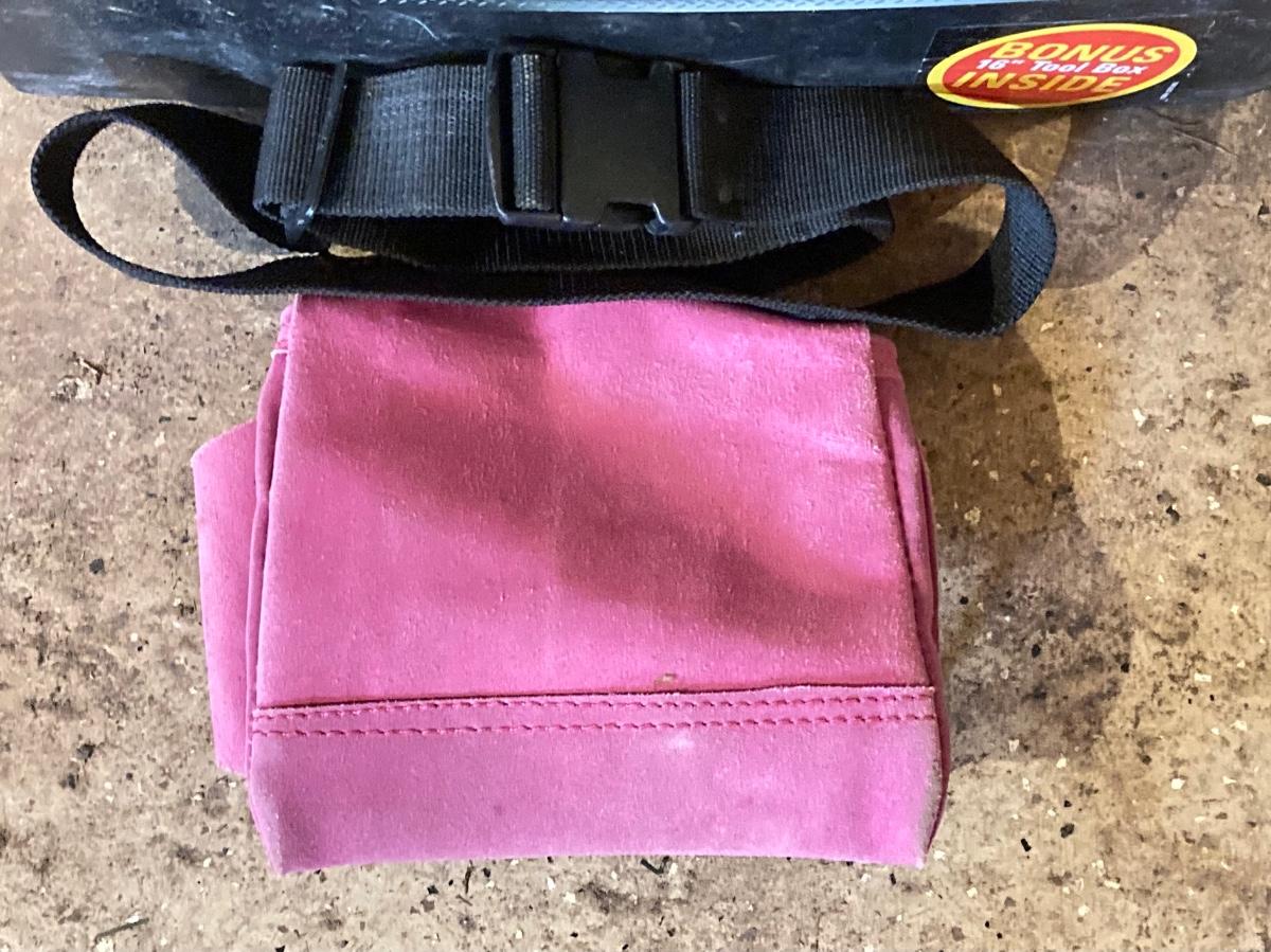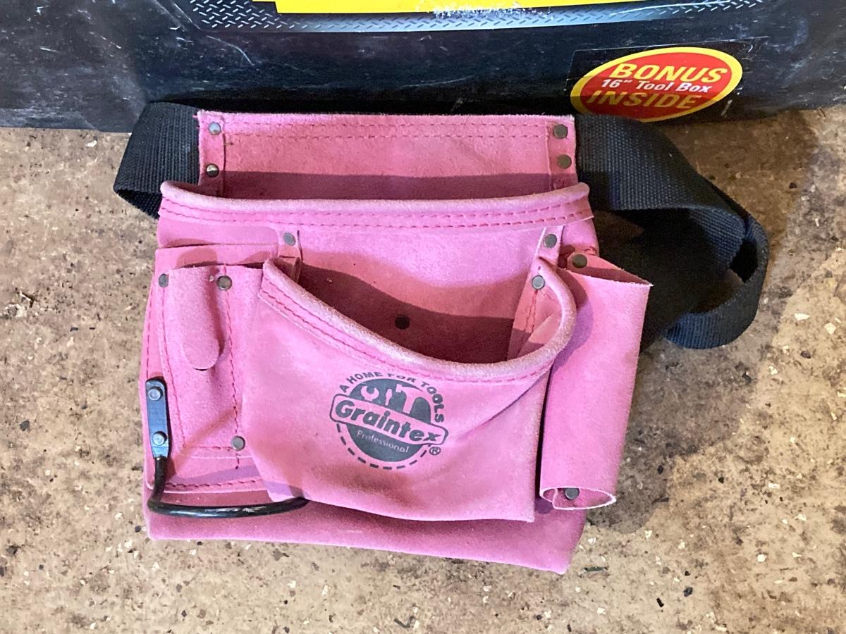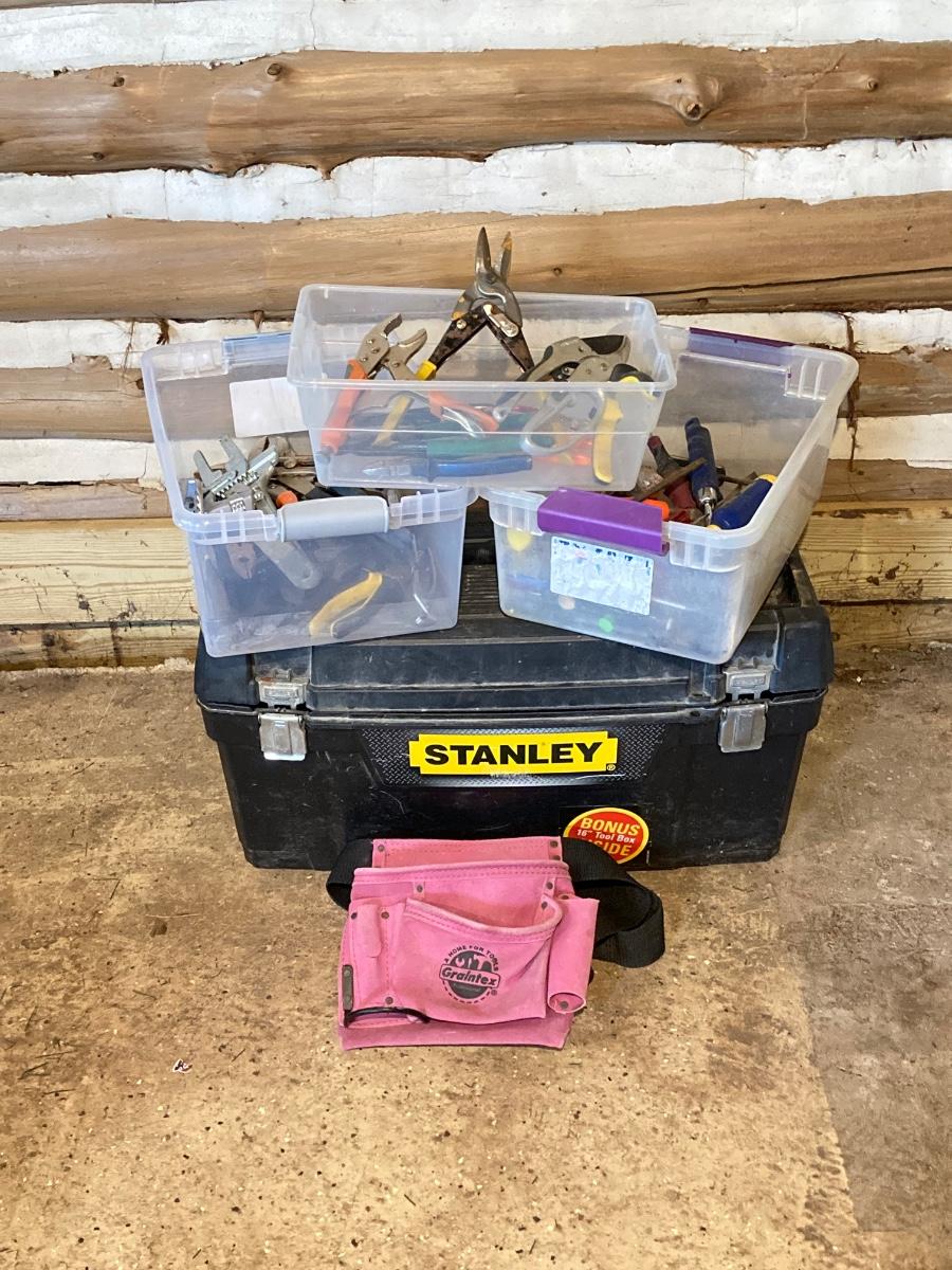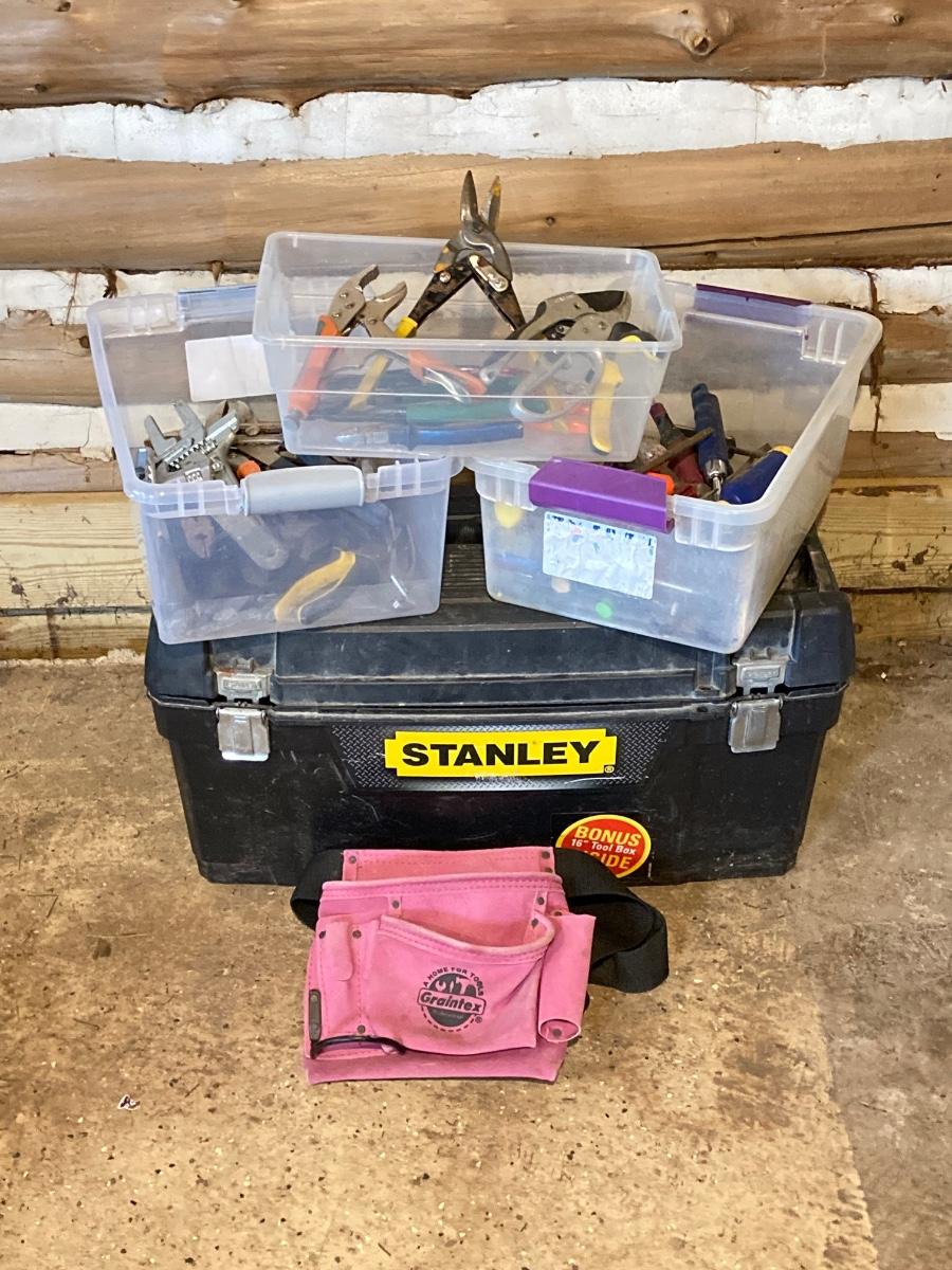 LOT 80: Stanley Tool Box, Pink Tool Belt and Assorted Tools