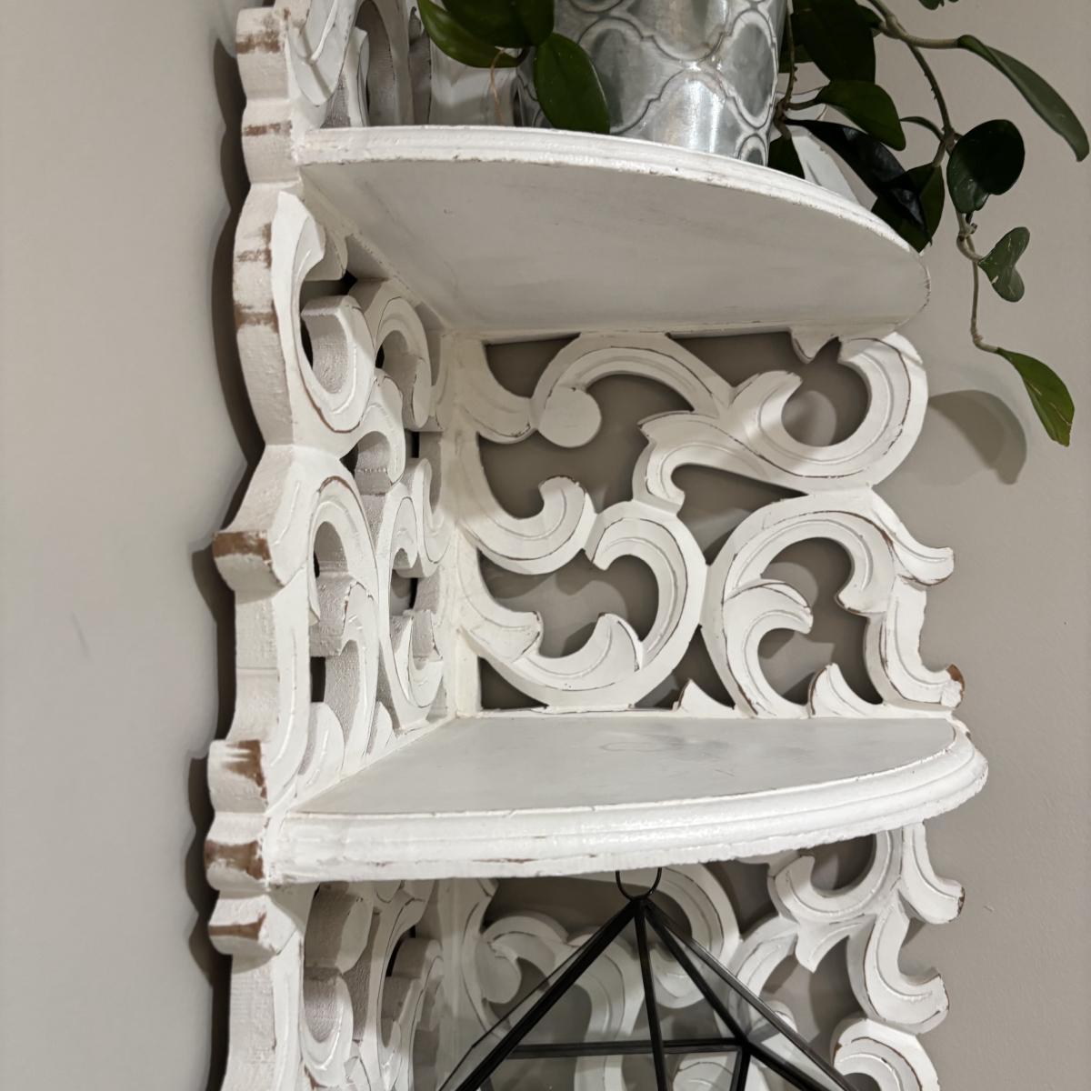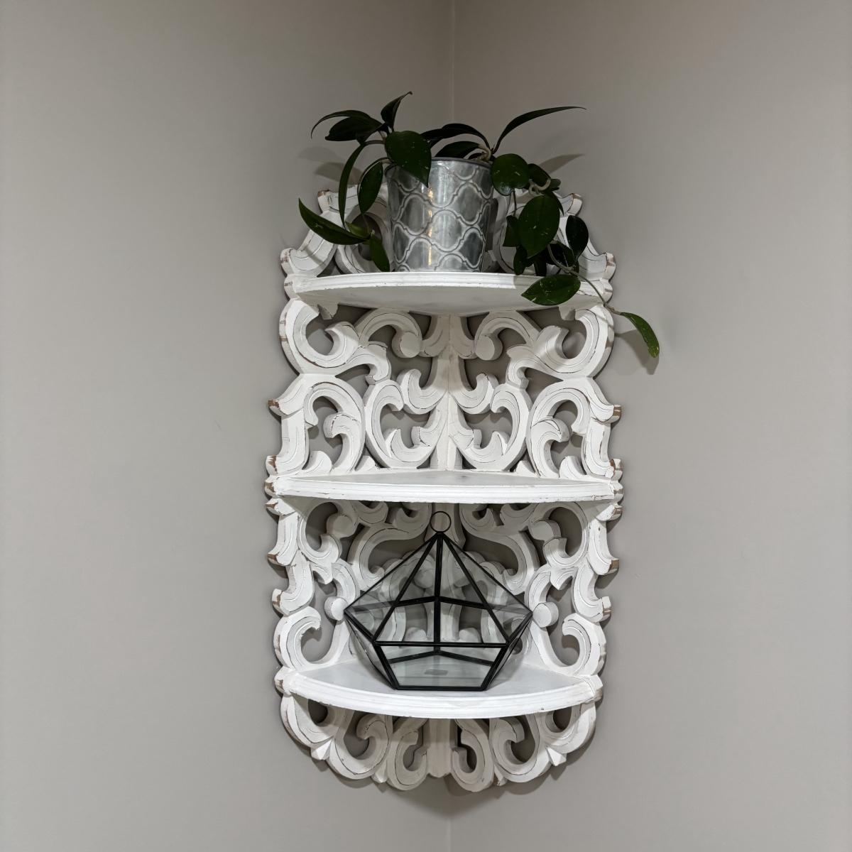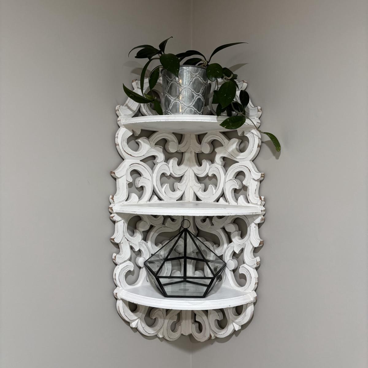LOT 107: White Wall Mounted Three (3) Tier Corner Shelf with Plant and Terrarium