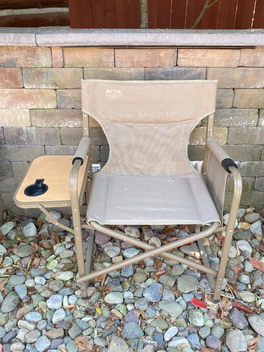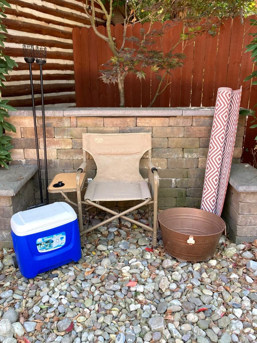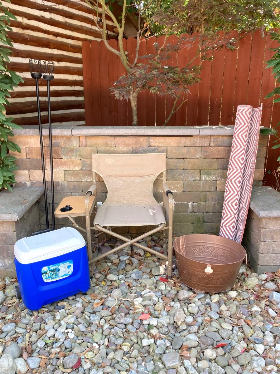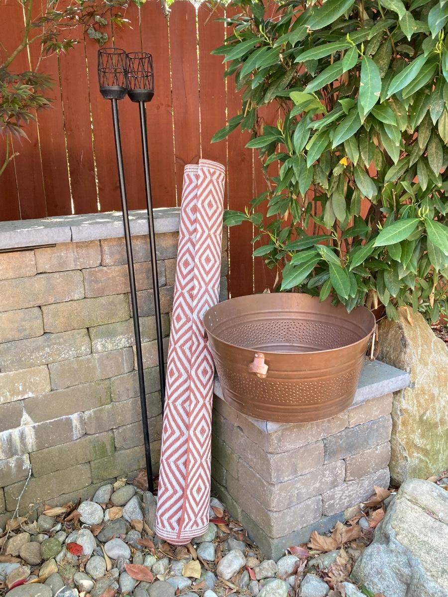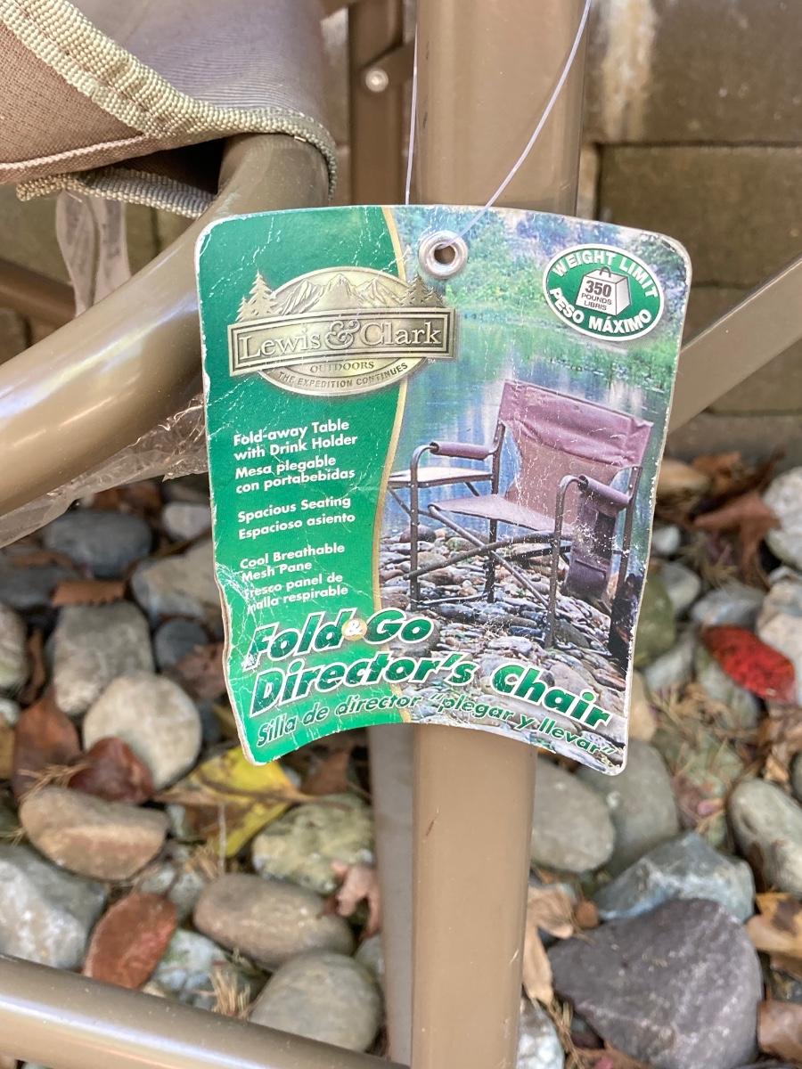 LOT 115: Outdoor Livin’ Includes and Lewis & Clark Fold & Go Directors Chair, Tiki Torches, Cooler, Copper Plated Bottle Holder Ice-bucket Indoor/Outdoor Rug and Rolling Cooler