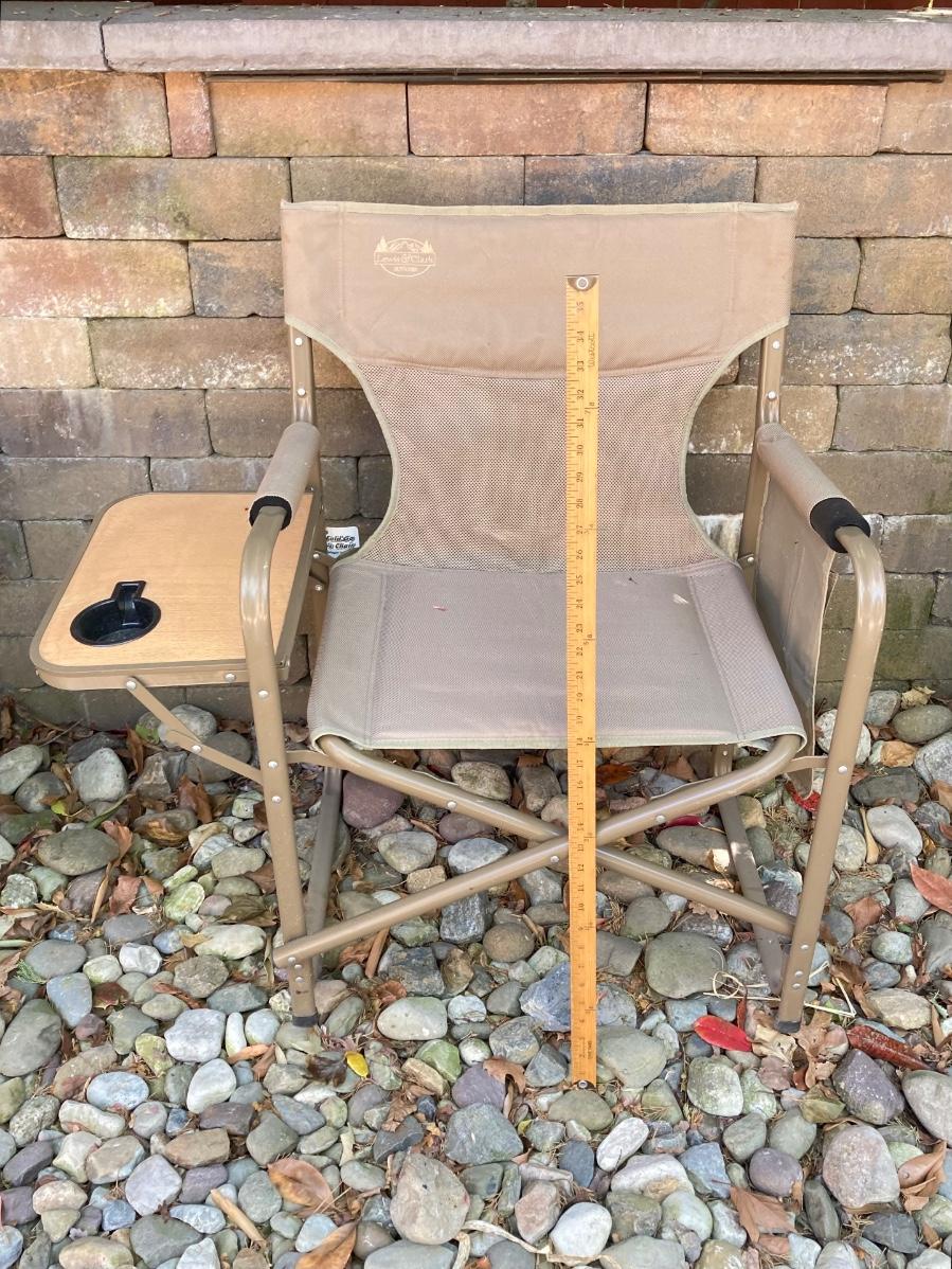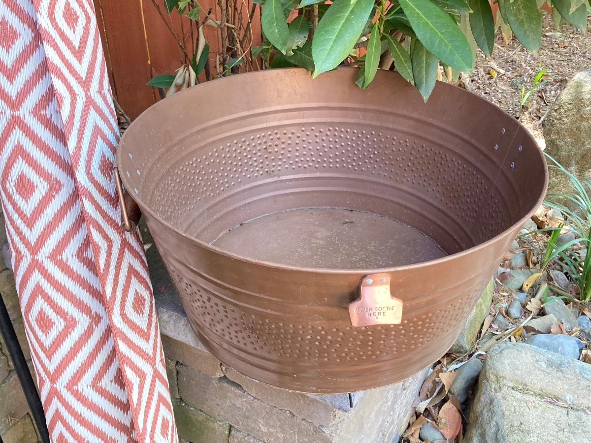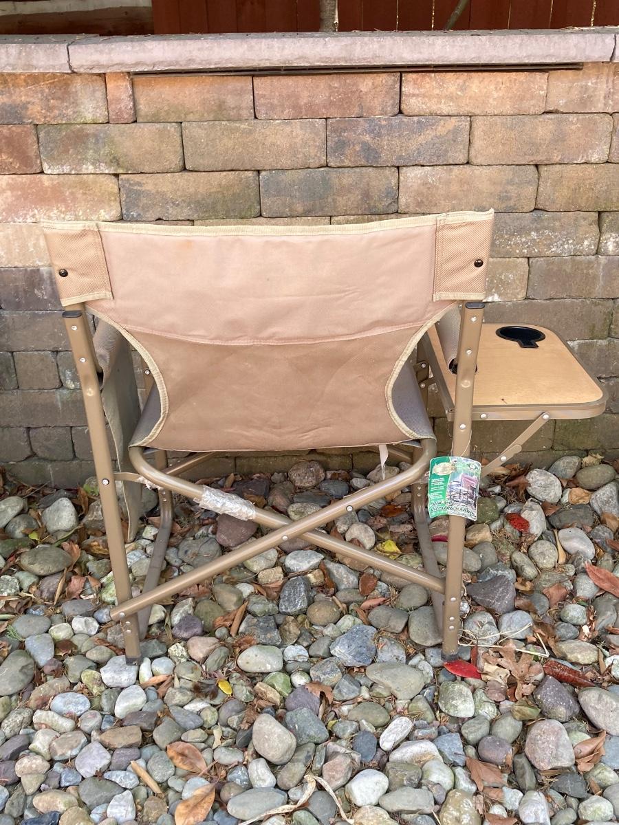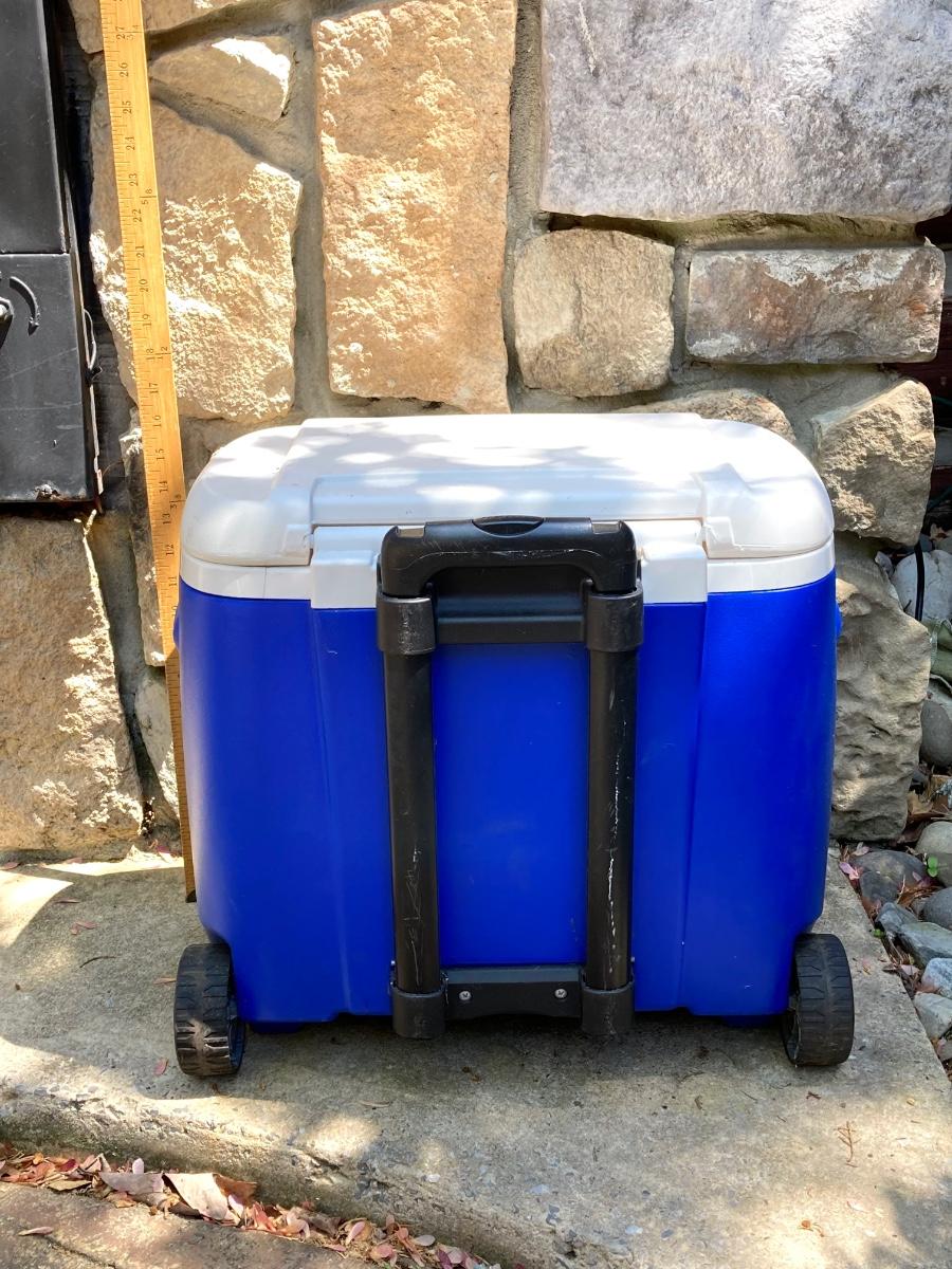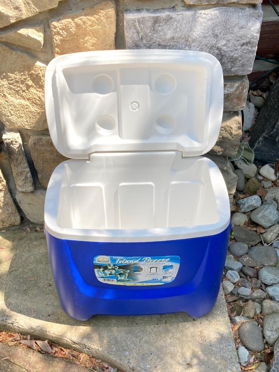 LOT 115: Outdoor Livin’ Includes and Lewis & Clark Fold & Go Directors Chair, Tiki Torches, Cooler, Copper Plated Bottle Holder Ice-bucket Indoor/Outdoor Rug and Rolling Cooler