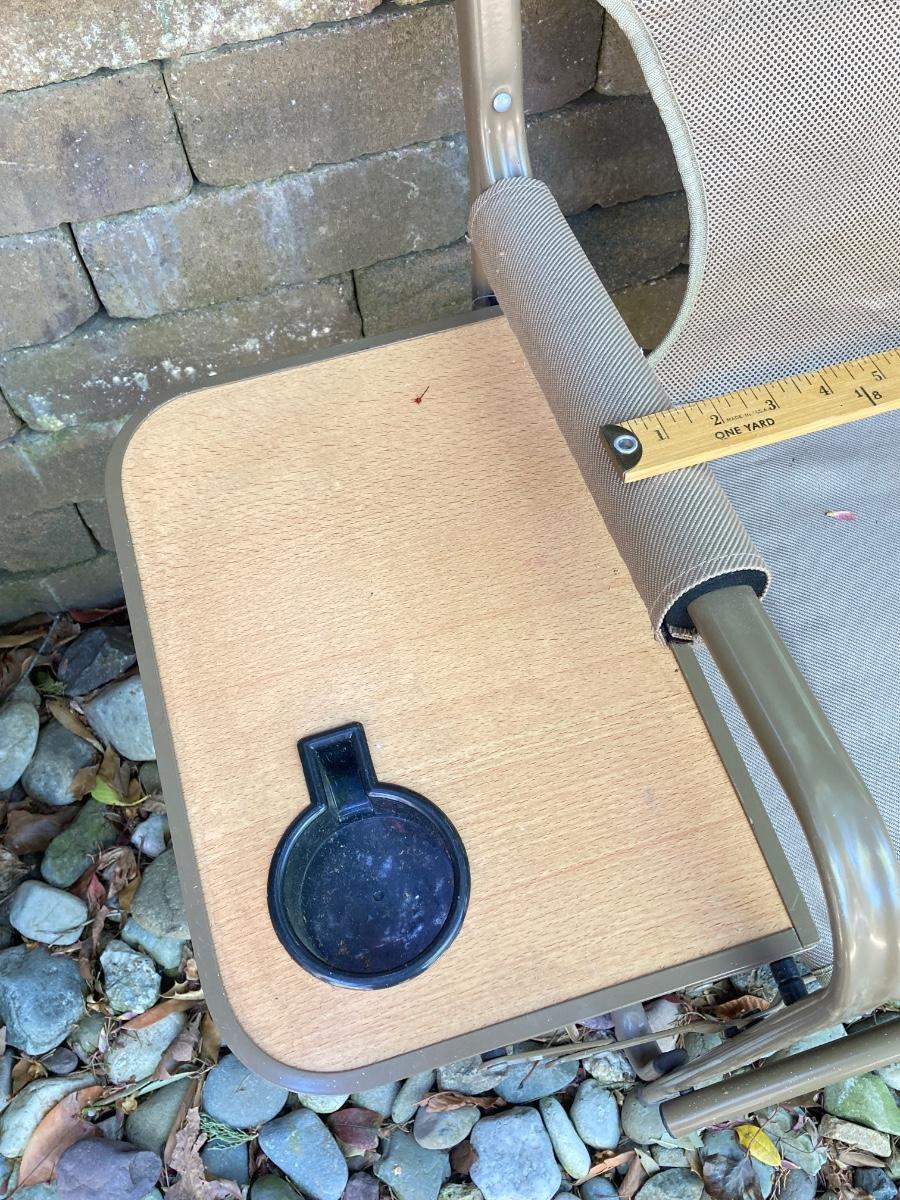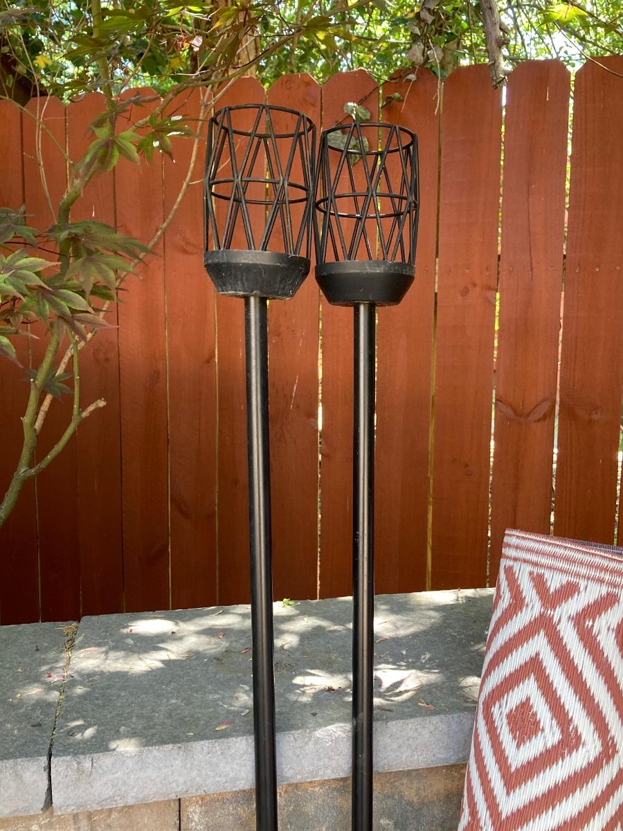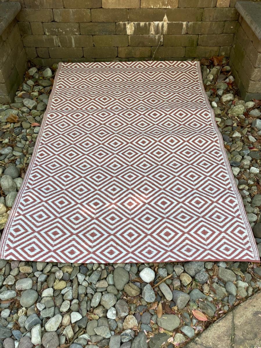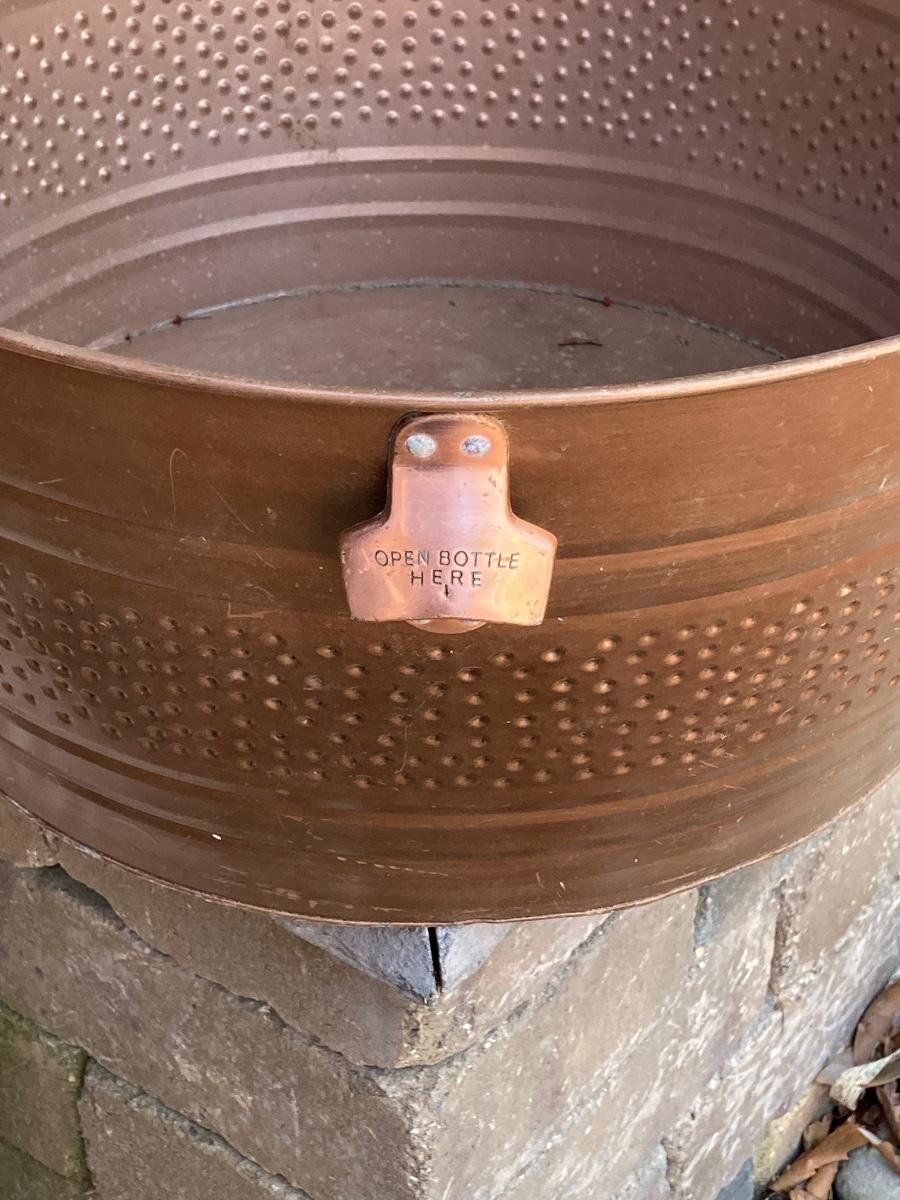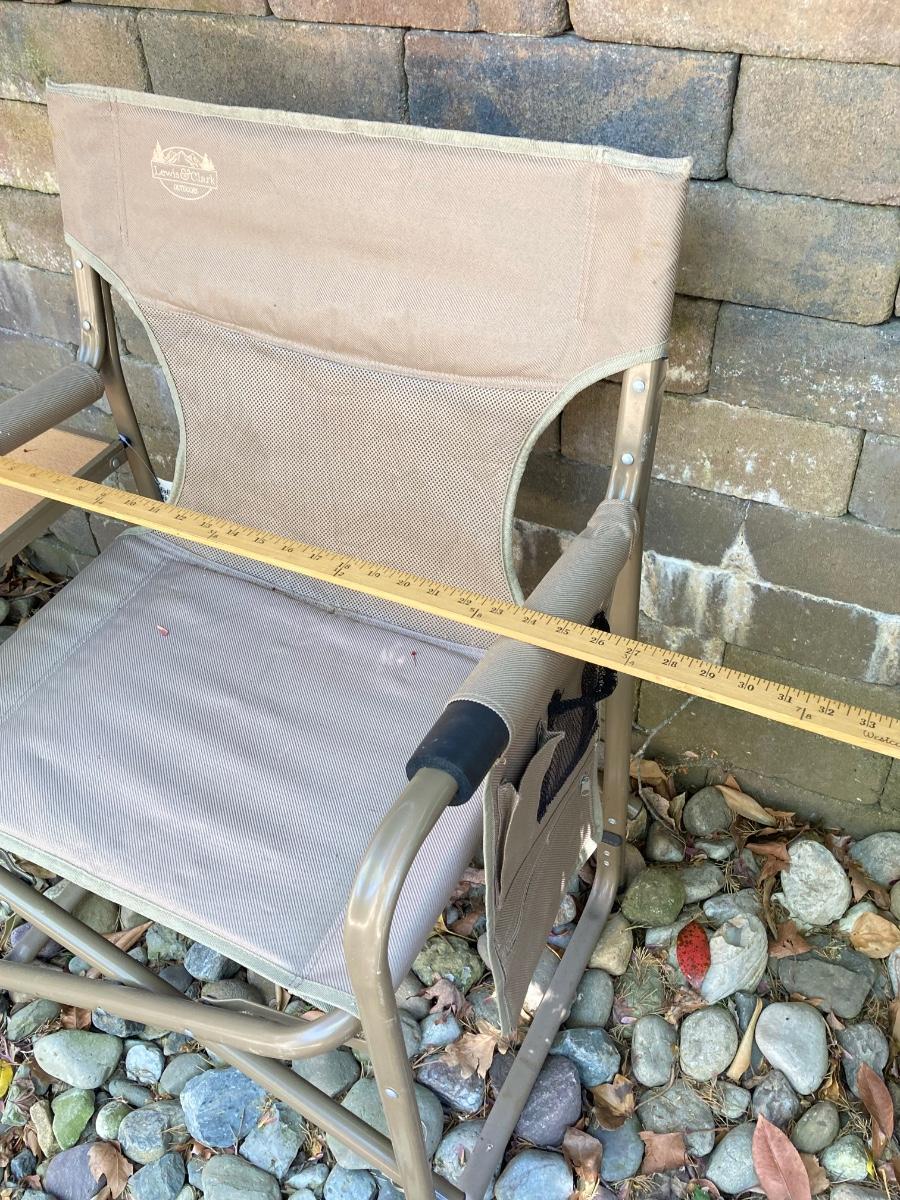LOT 115: Outdoor Livin’ Includes and Lewis & Clark Fold & Go Directors Chair, Tiki Torches, Cooler, Copper Plated Bottle Holder Ice-bucket Indoor/Outdoor Rug and Rolling Cooler
