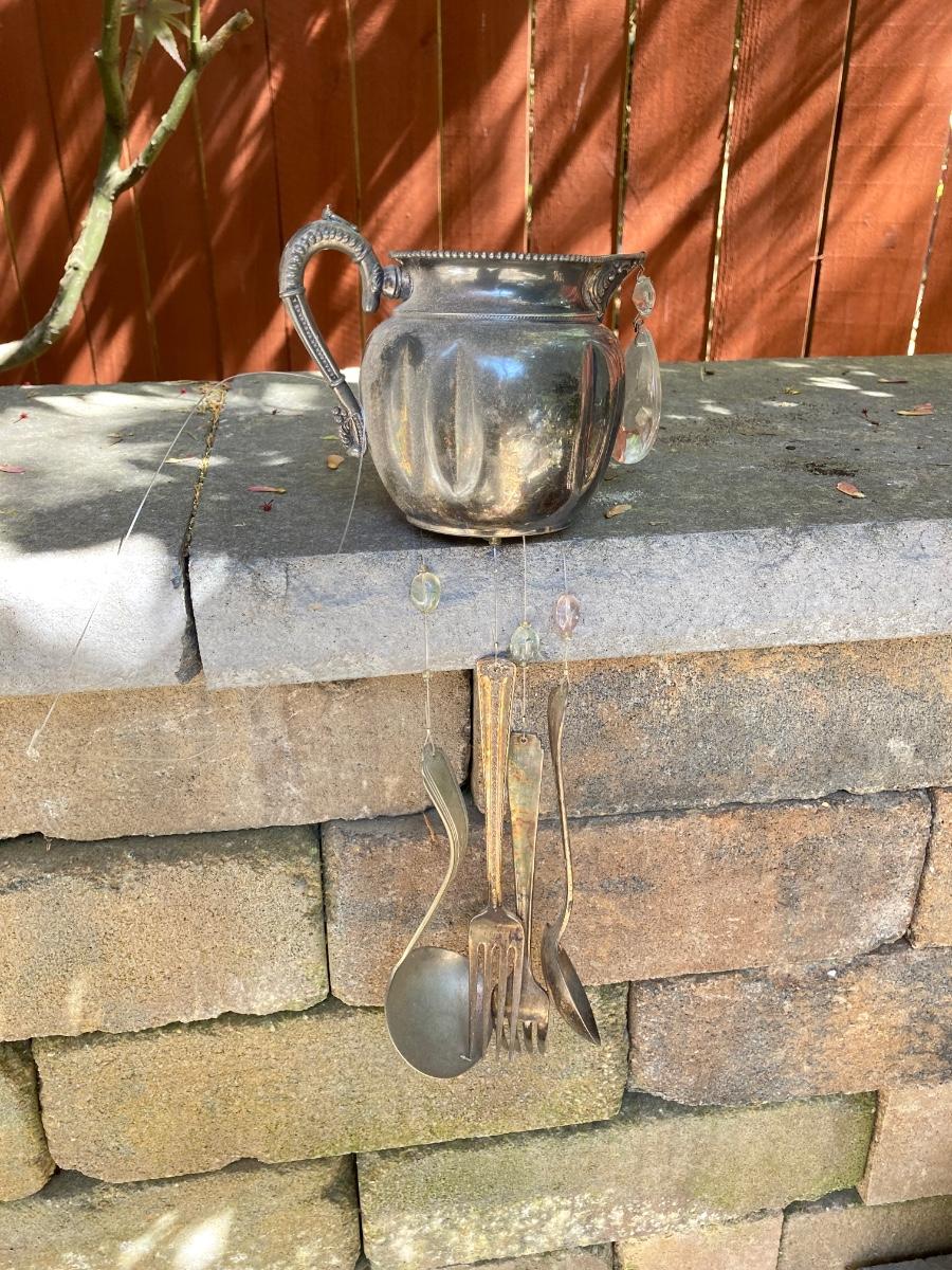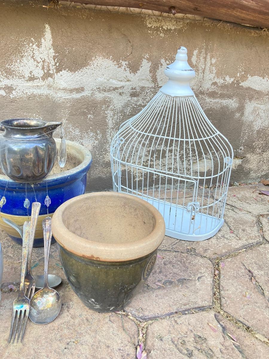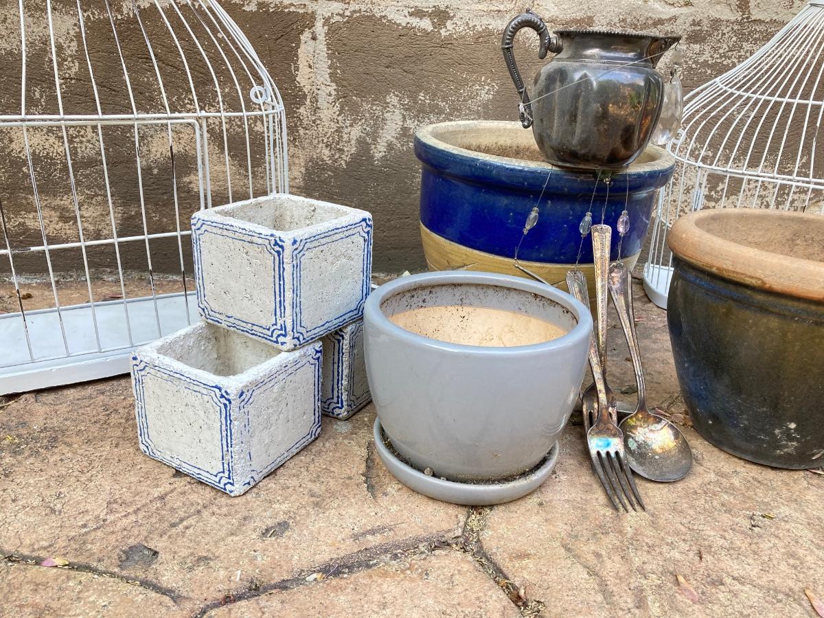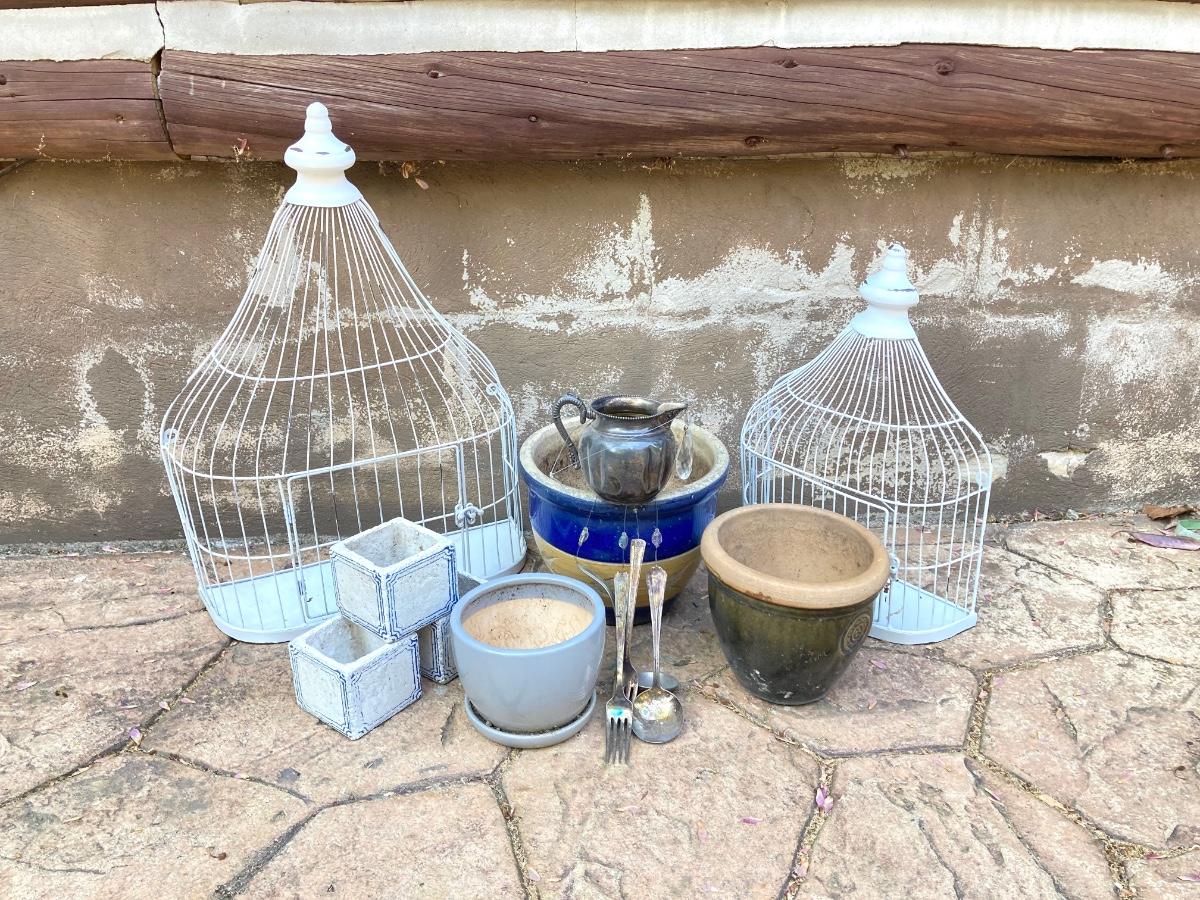 LOT 121: Home Decor Collection - Ceramic / Pottery Planters, Silver Plated Pitcher and Utensil Wind Chimes, Two White Wire Bird Cages and More