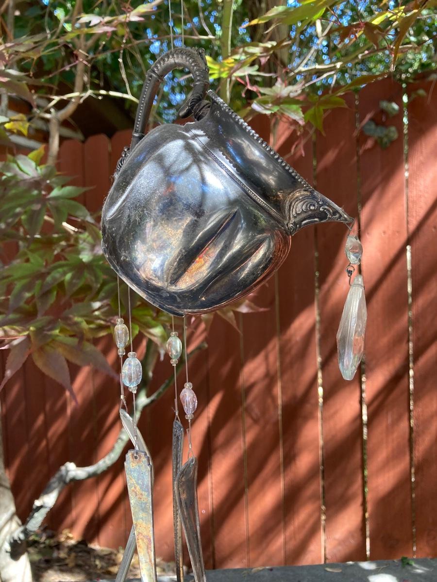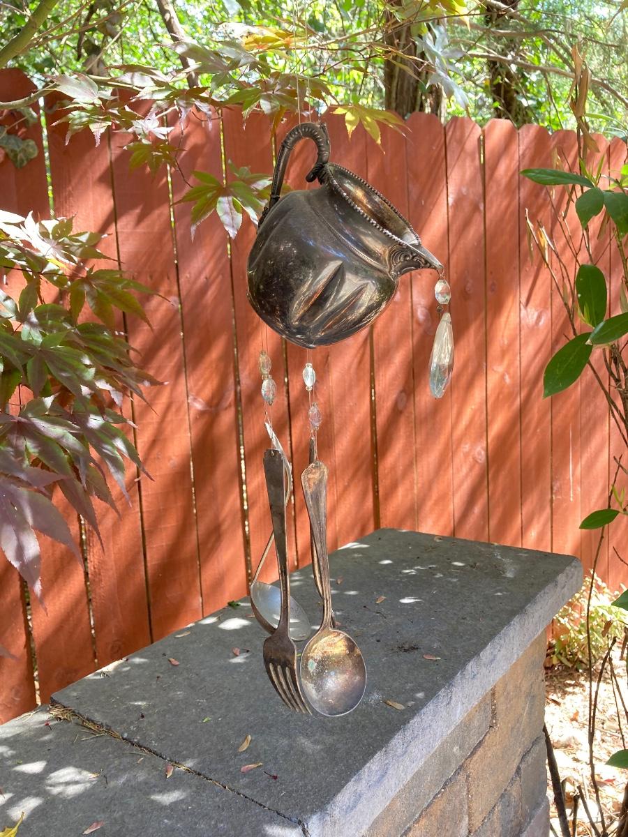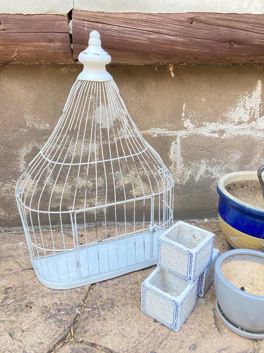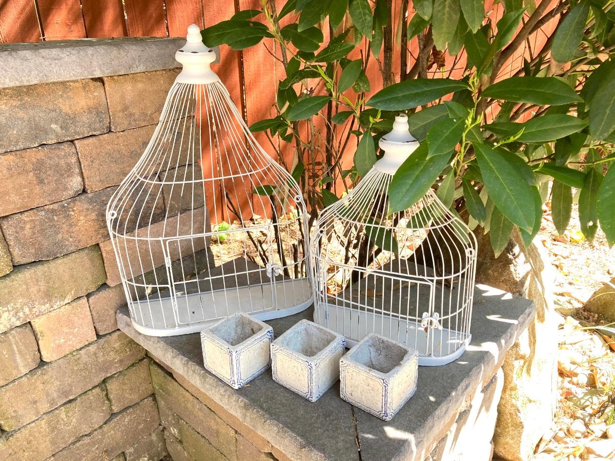 LOT 121: Home Decor Collection - Ceramic / Pottery Planters, Silver Plated Pitcher and Utensil Wind Chimes, Two White Wire Bird Cages and More